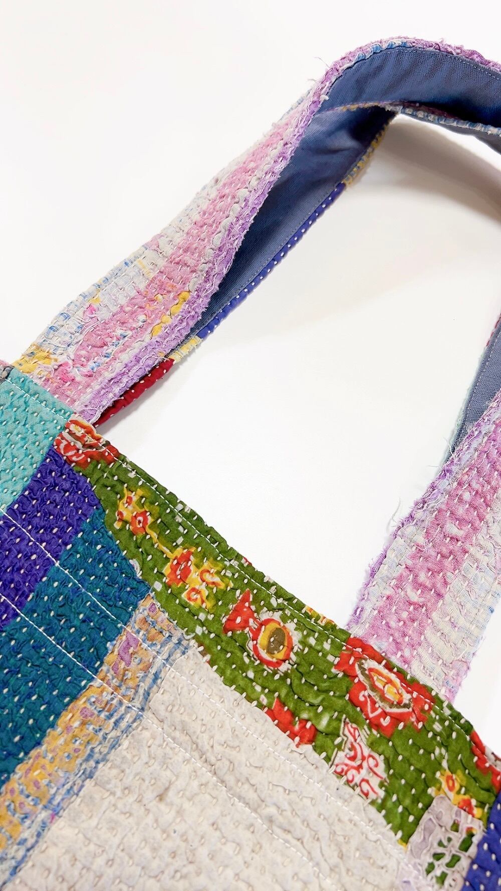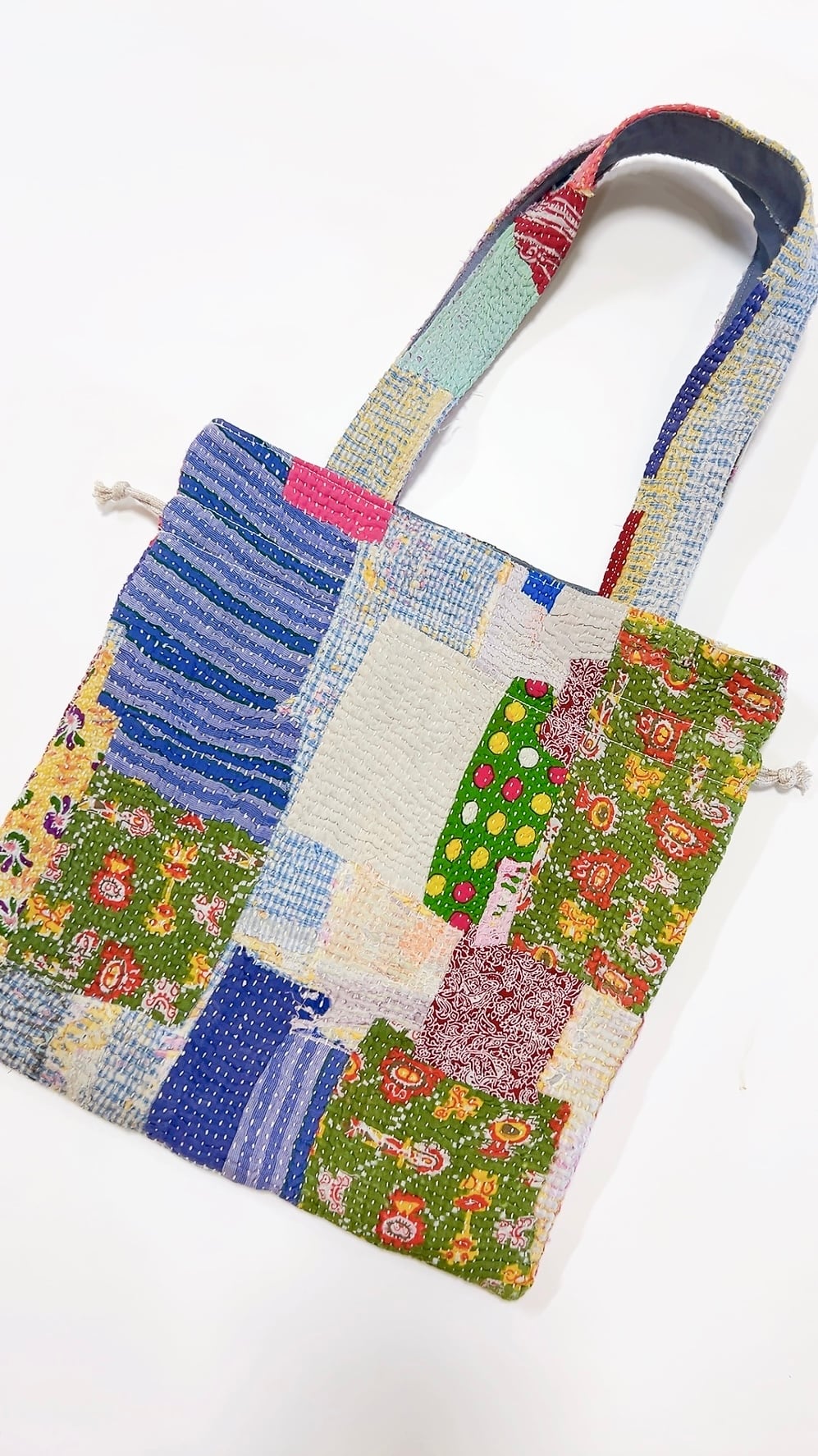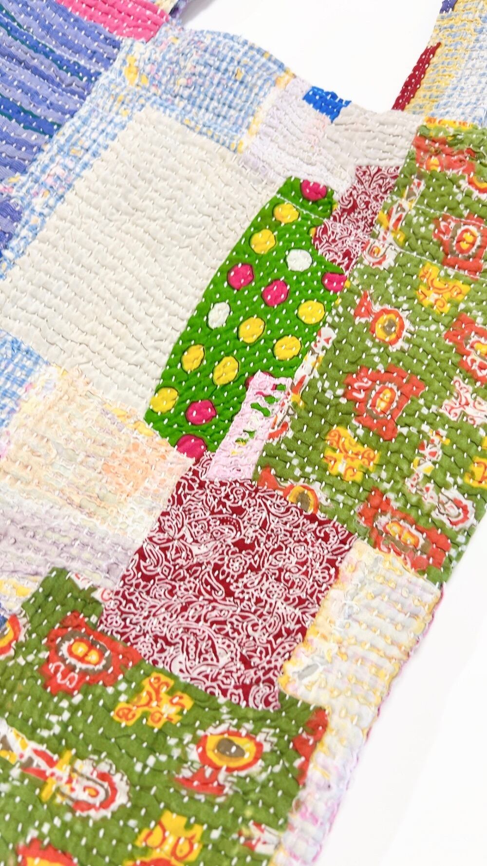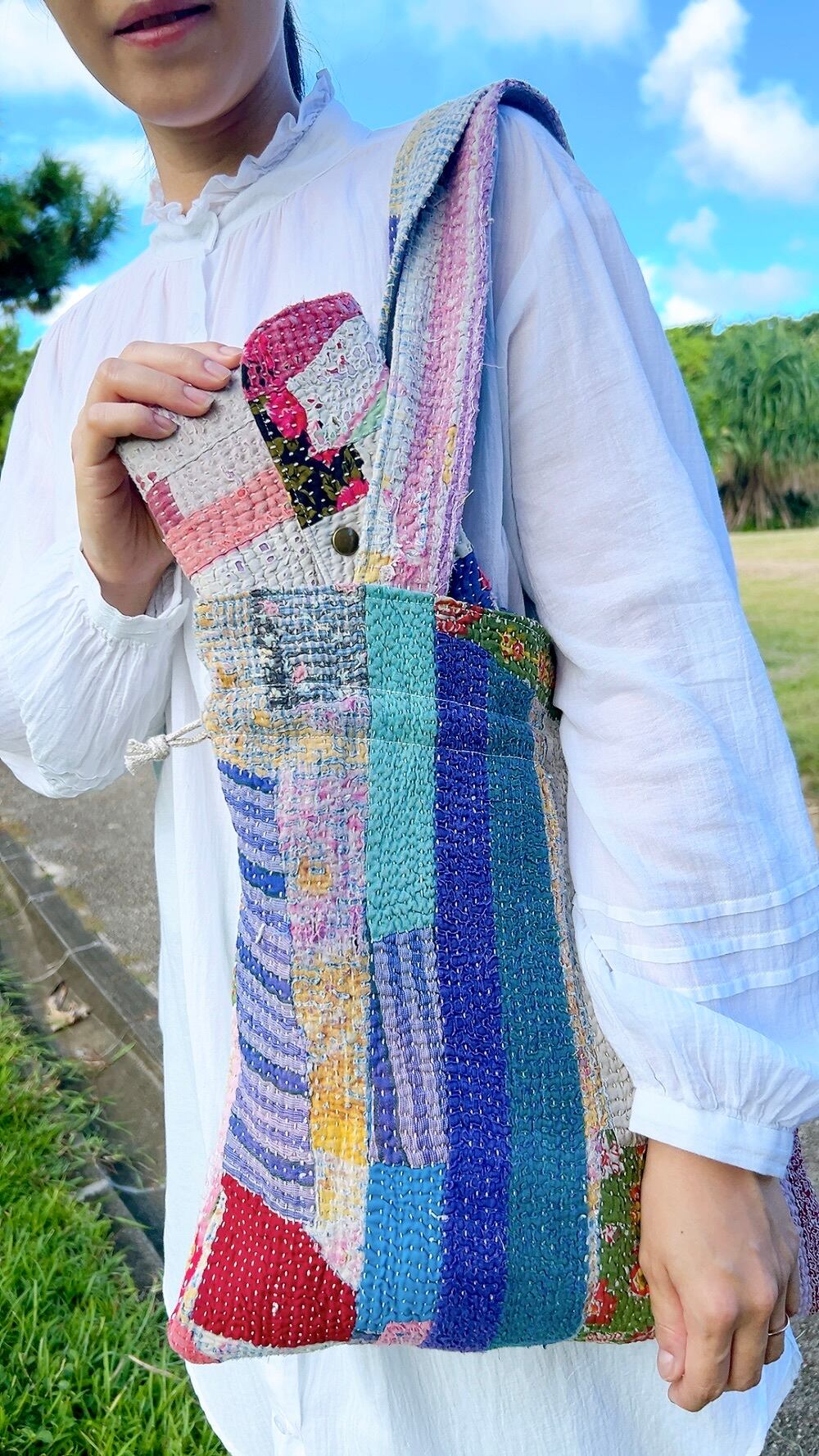 大きめ巾着トートバッグは、ヴィンテージ感あふれるラリーキルトを使用したおしゃれなアイテムです。風合い豊かな生地と独特のデザインが魅力で、日常使いから特別なお出かけシーンまで幅広く活躍します。