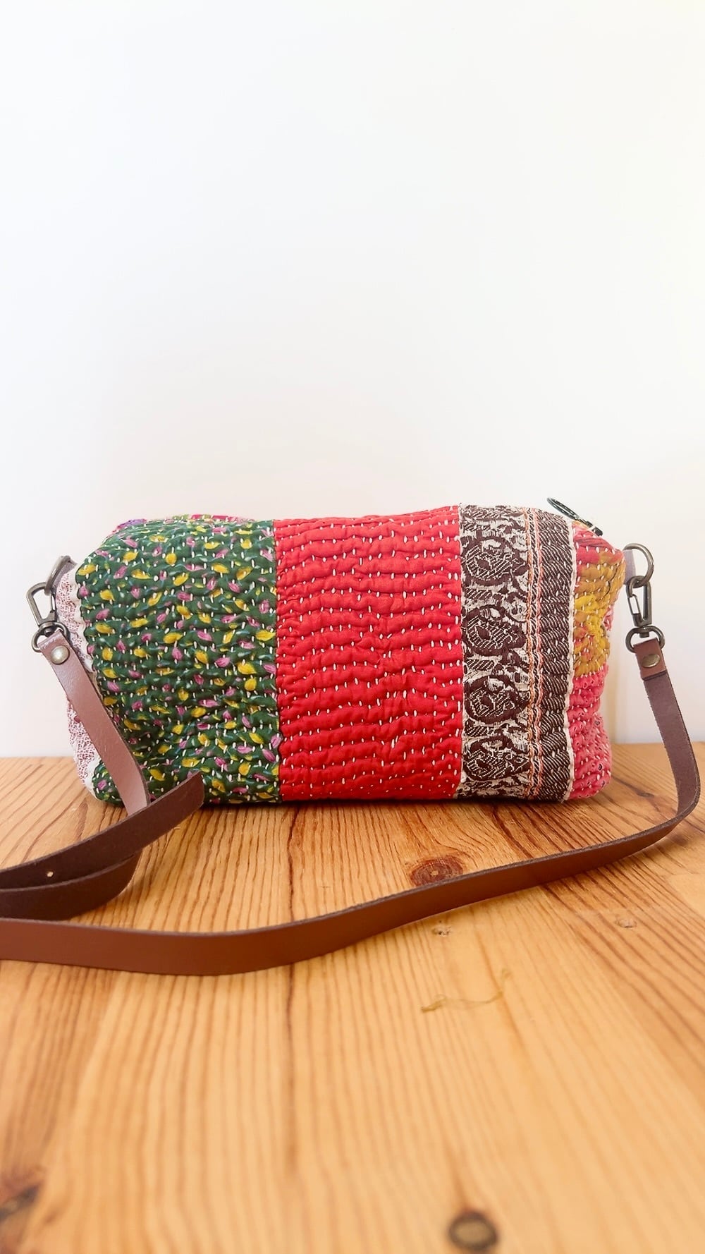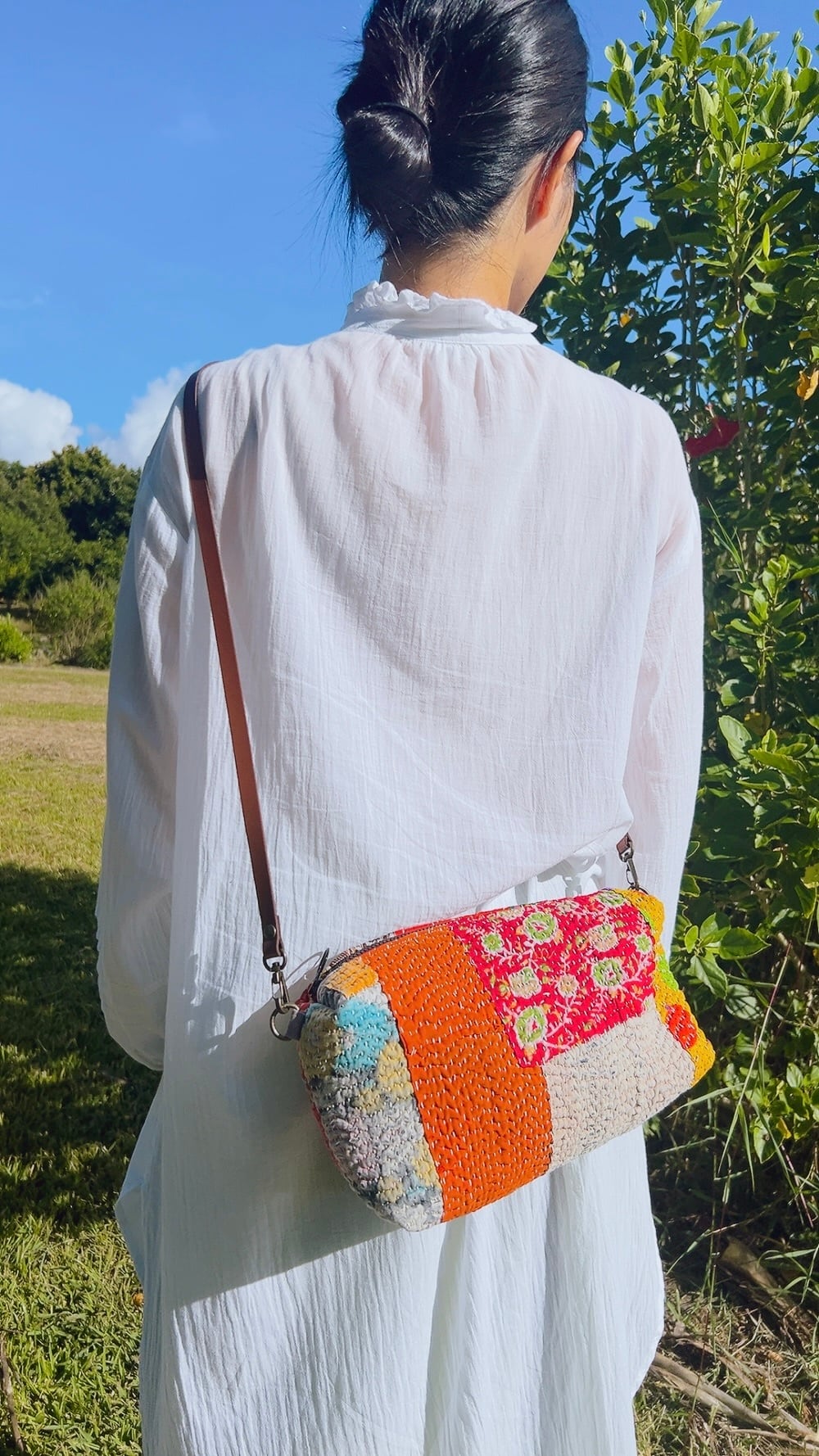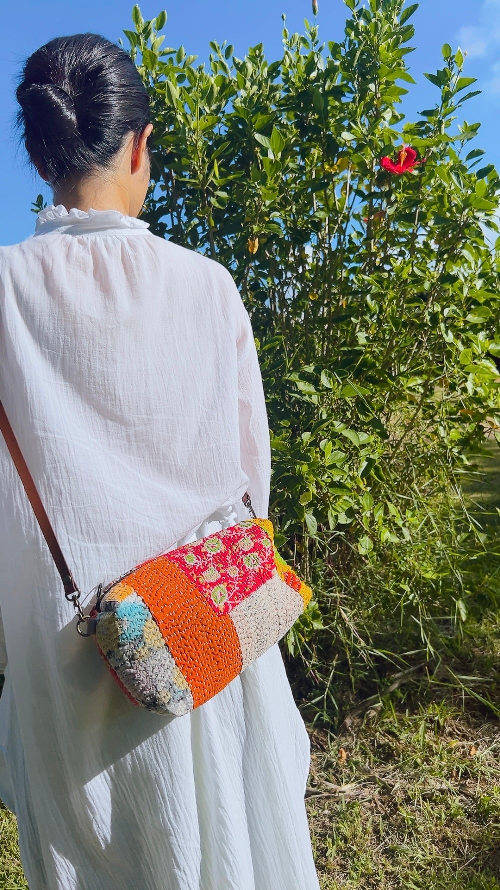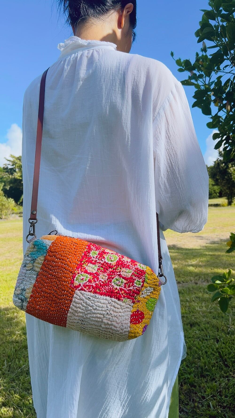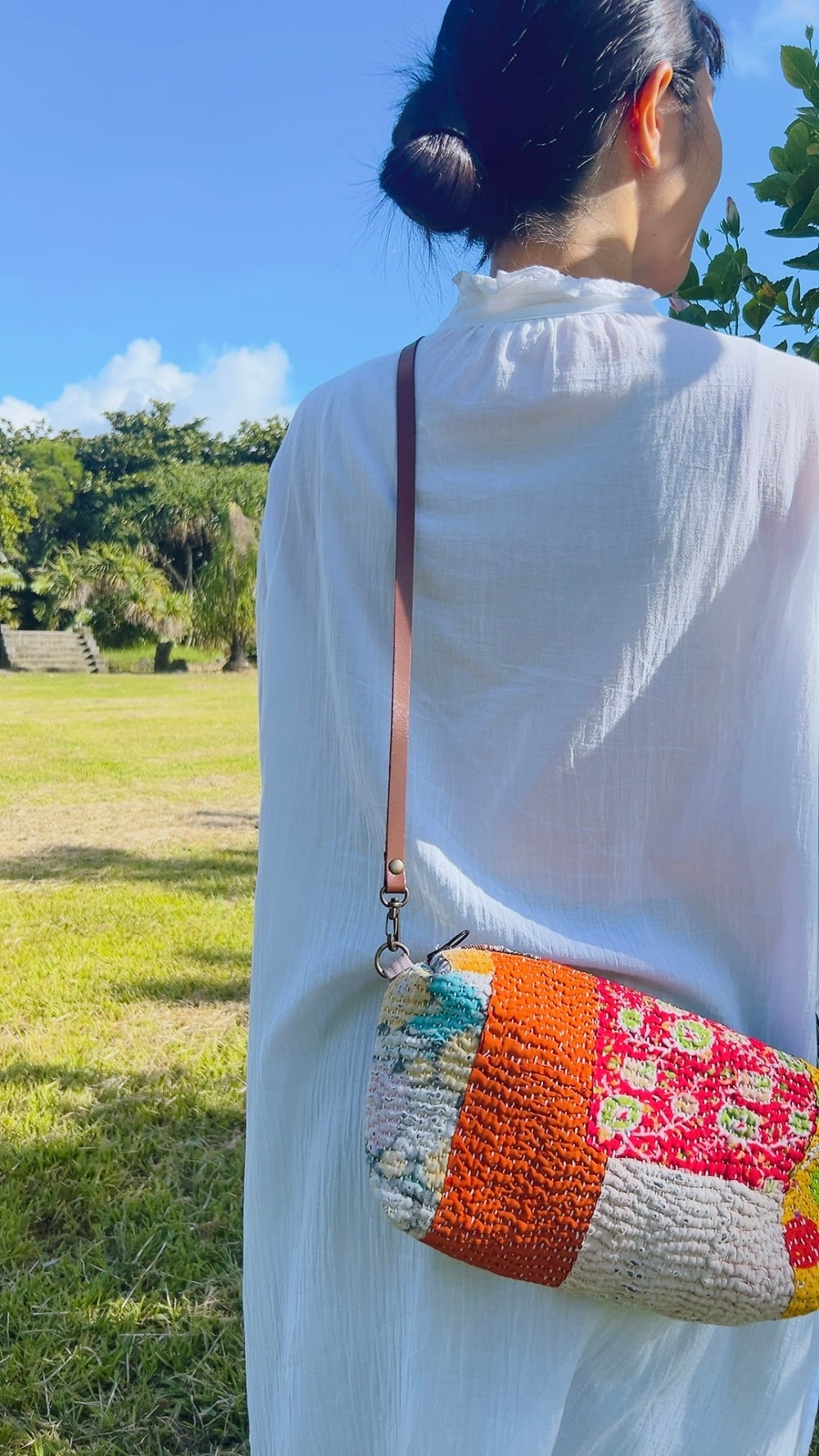 たっぷりマチが魅力のショルダーバッグです!ラリーキルトの独特なデザインがアクセントとなり、爽やかな色合いがこれからの季節にピッタリ。気分も上がります。