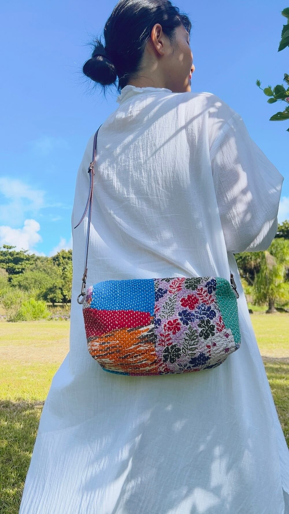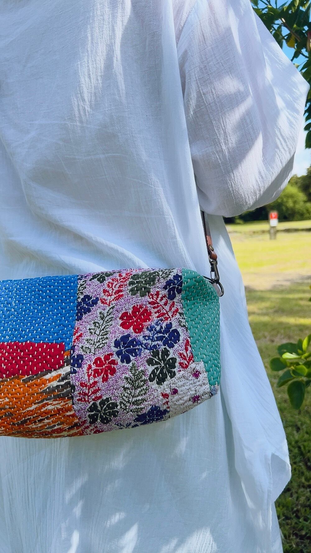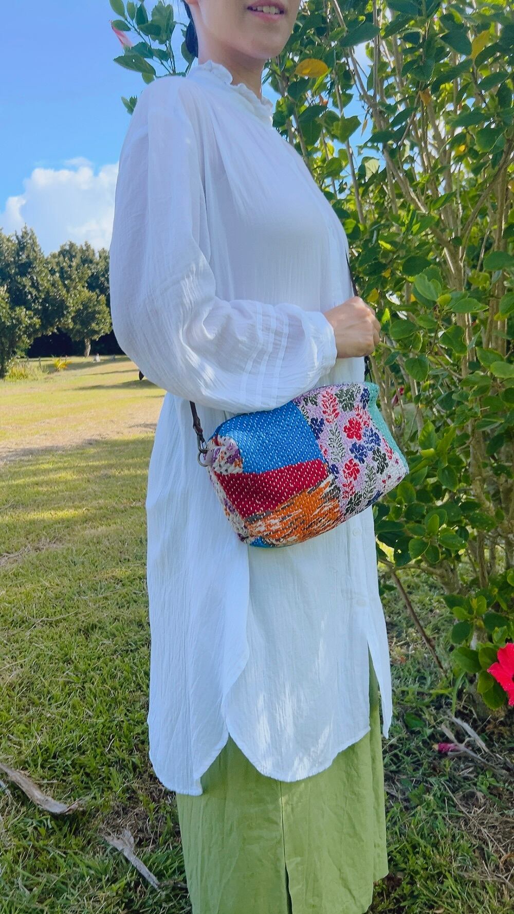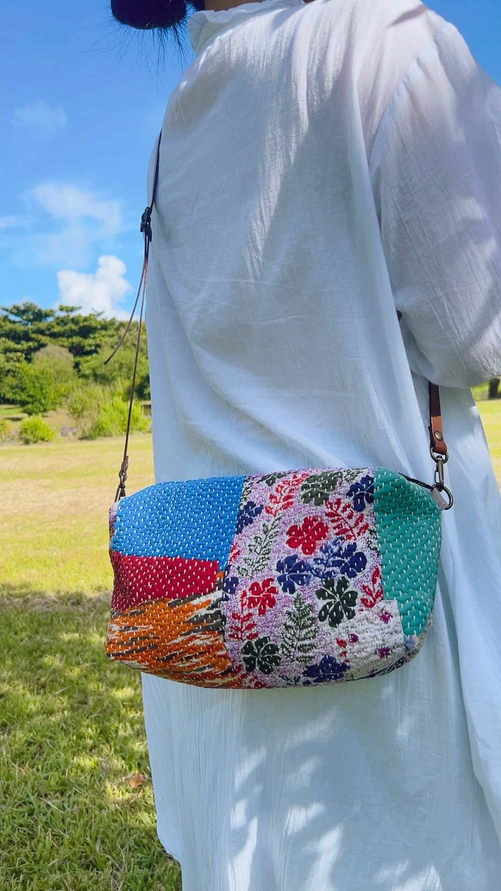 たっぷりマチが魅力のショルダーバッグです!ラリーキルトの独特なデザインがアクセントとなり、爽やかな色合いがこれからの季節にピッタリ。気分も上がります。
