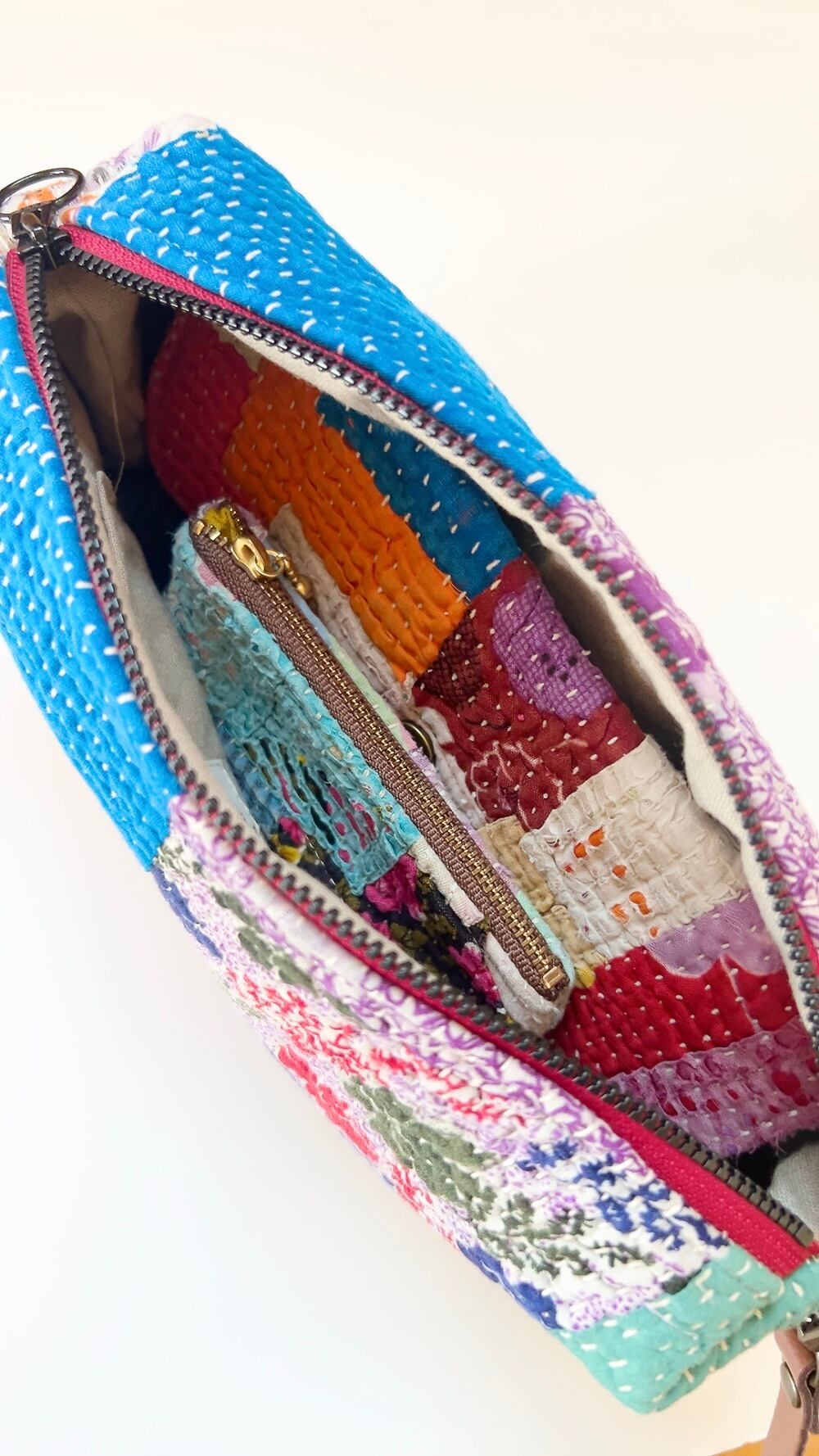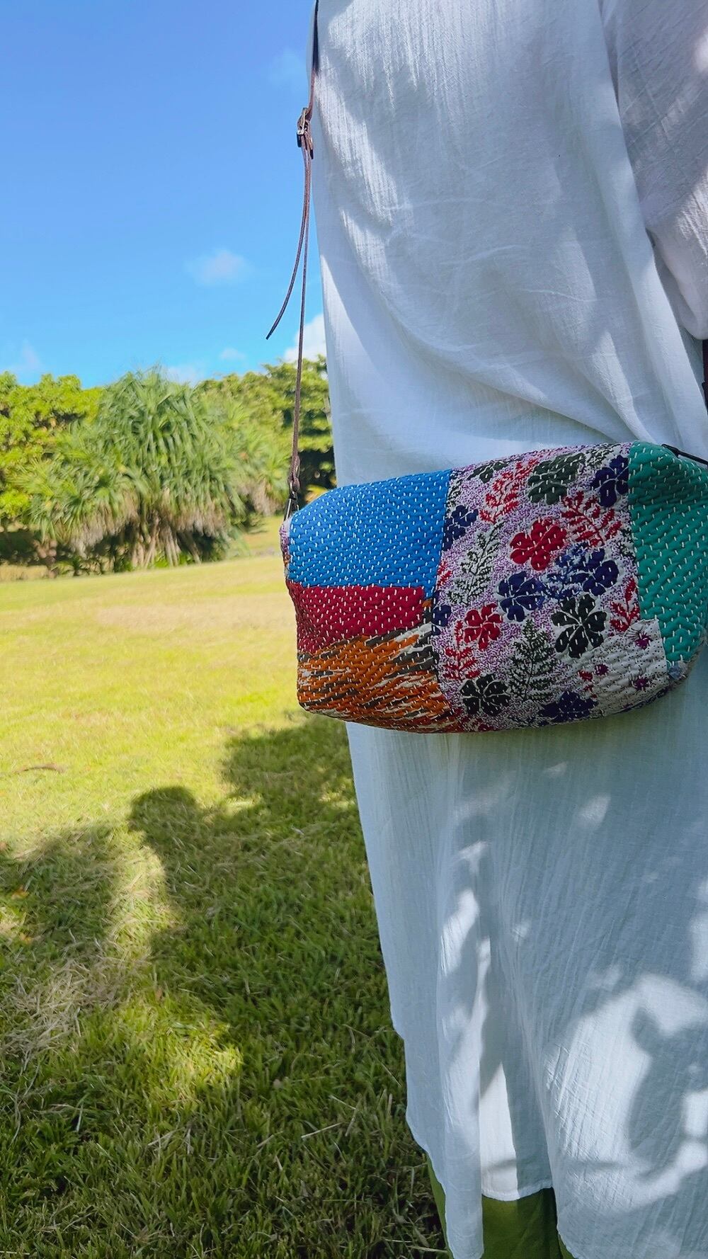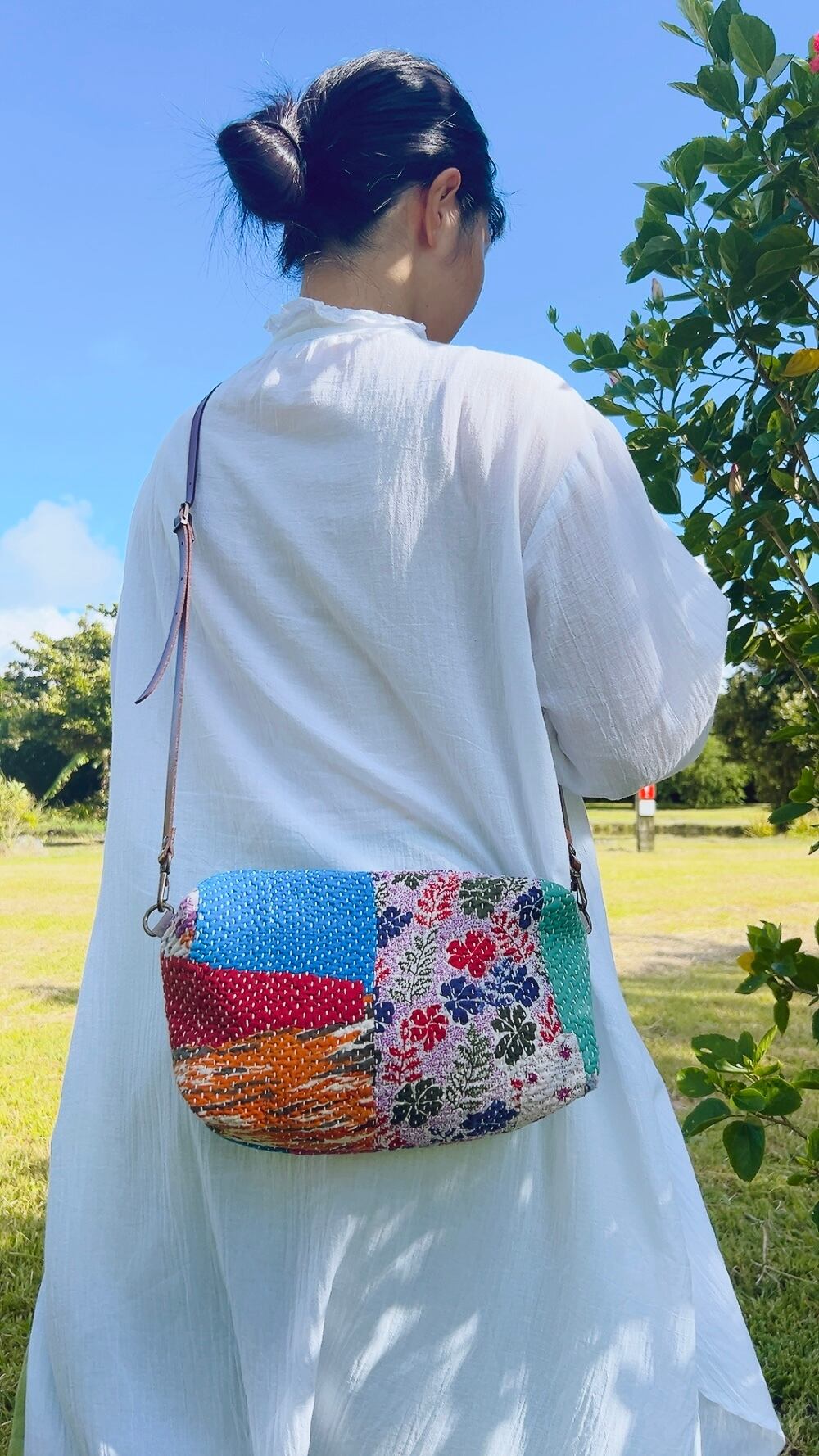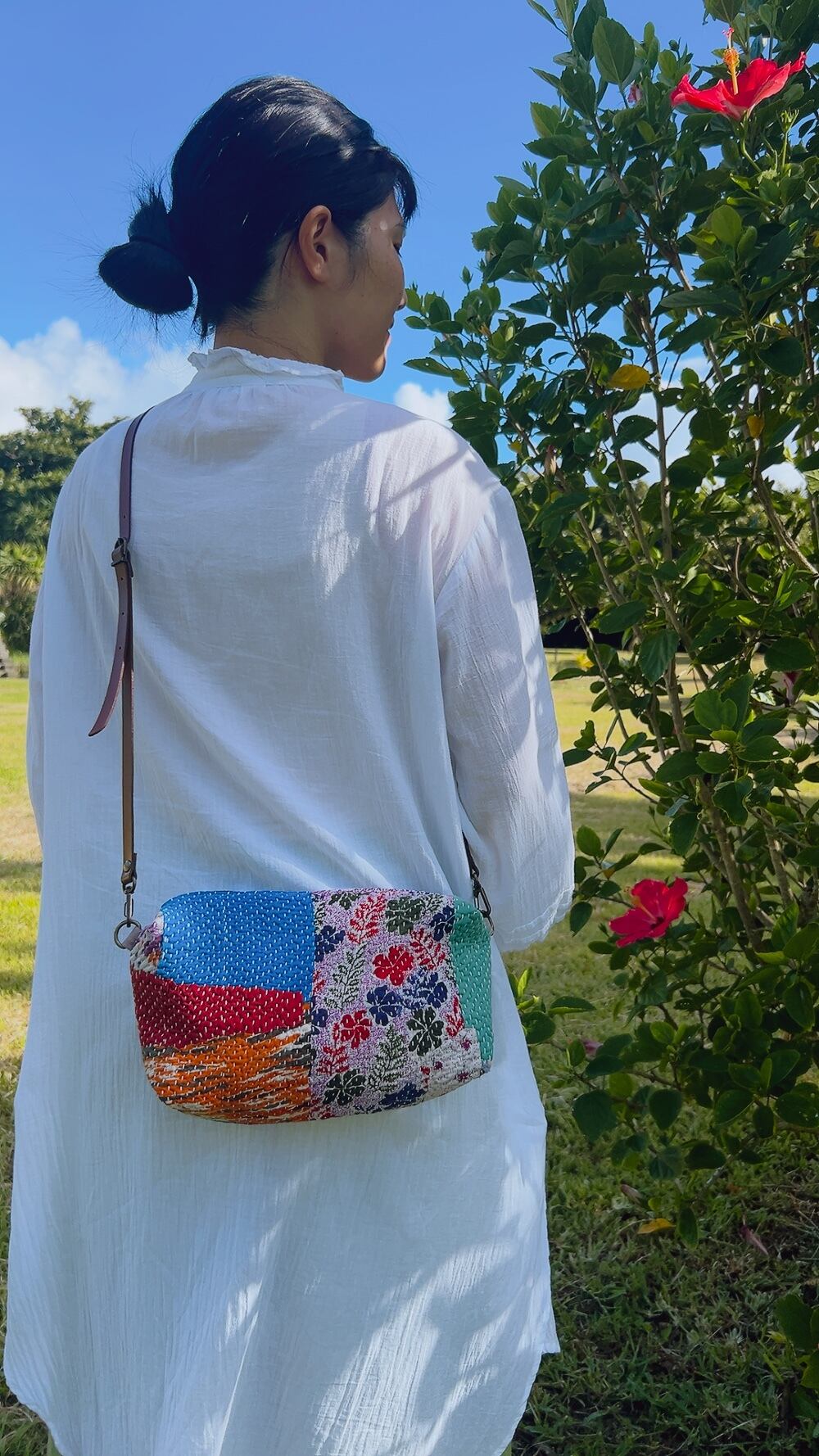 たっぷりマチが魅力のショルダーバッグです!ラリーキルトの独特なデザインがアクセントとなり、爽やかな色合いがこれからの季節にピッタリ。気分も上がります。