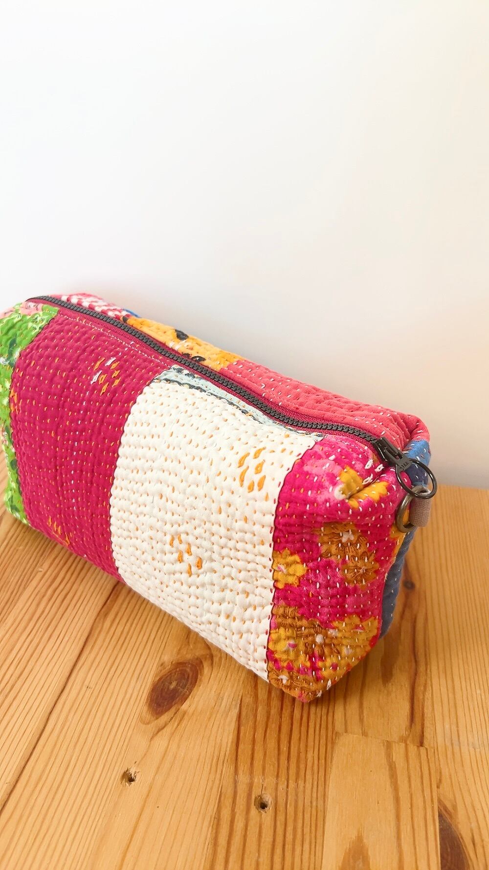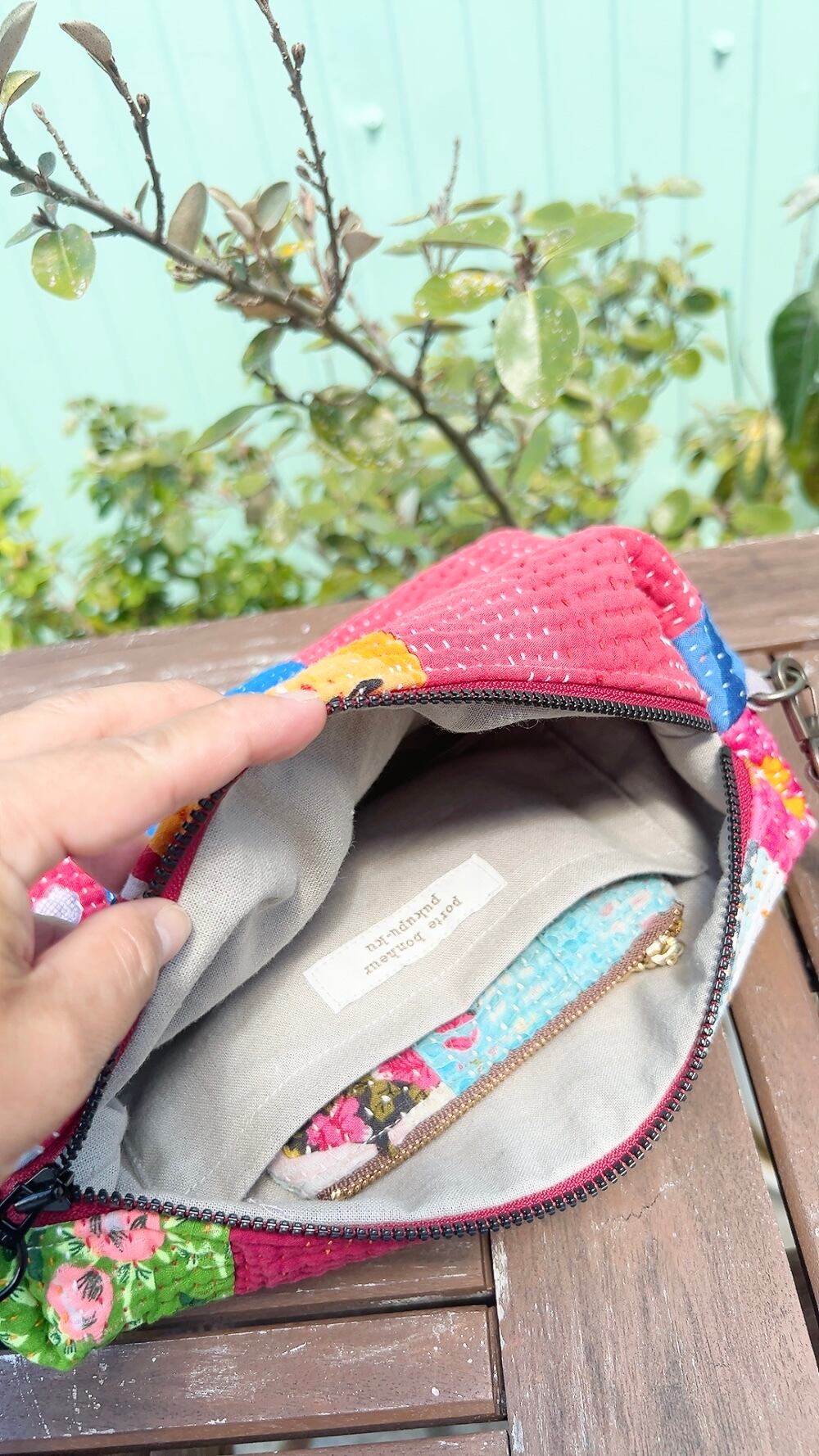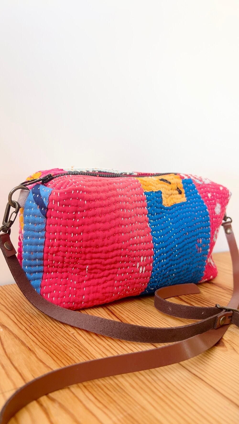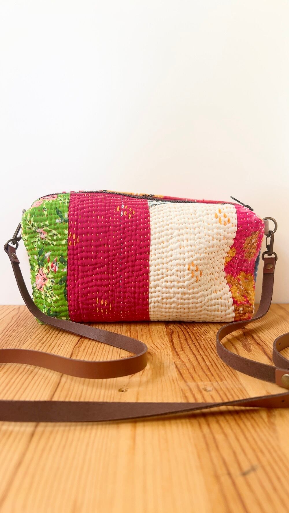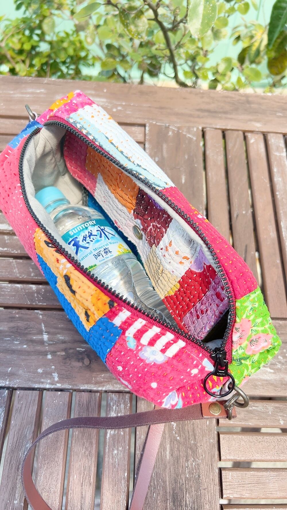 たっぷりマチが魅力のショルダーバッグです!ラリーキルトの独特なデザインがアクセントとなり、爽やかな色合いがこれからの季節にピッタリ。気分も上がります。