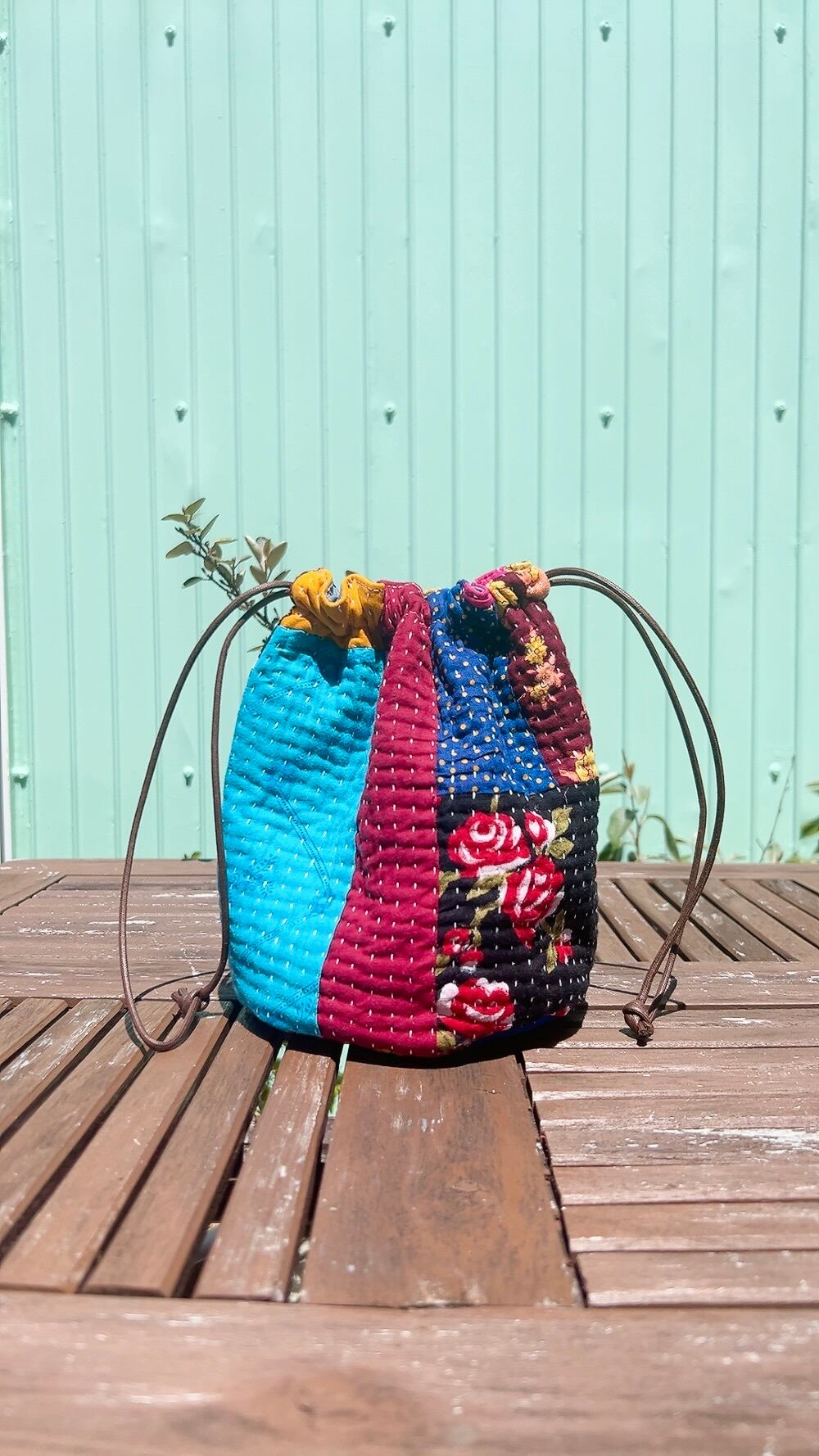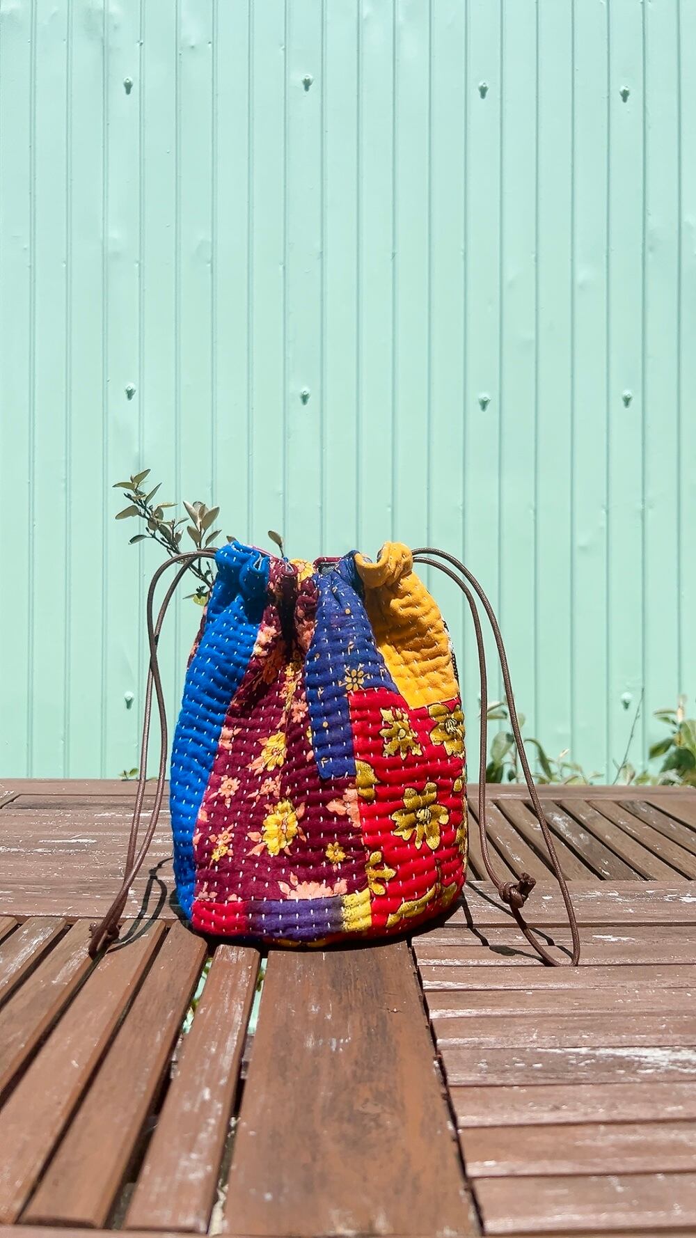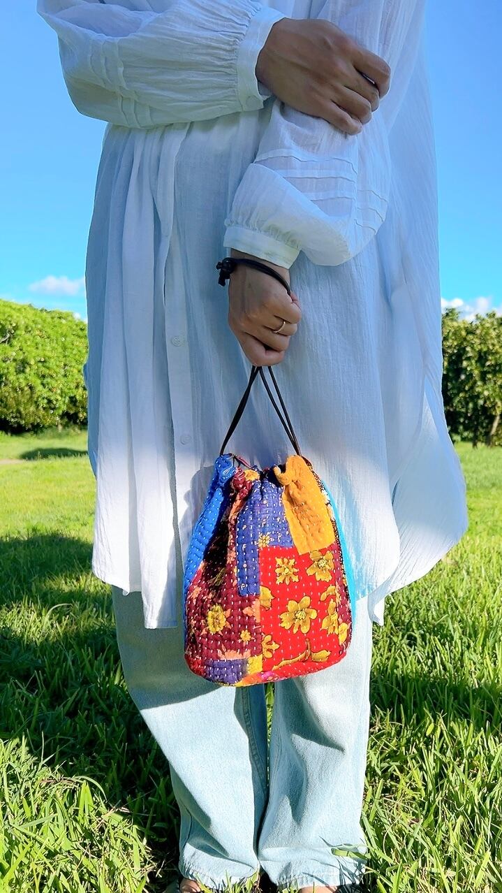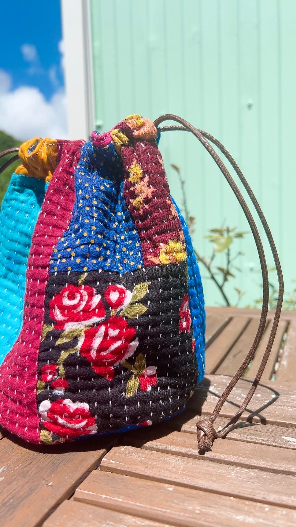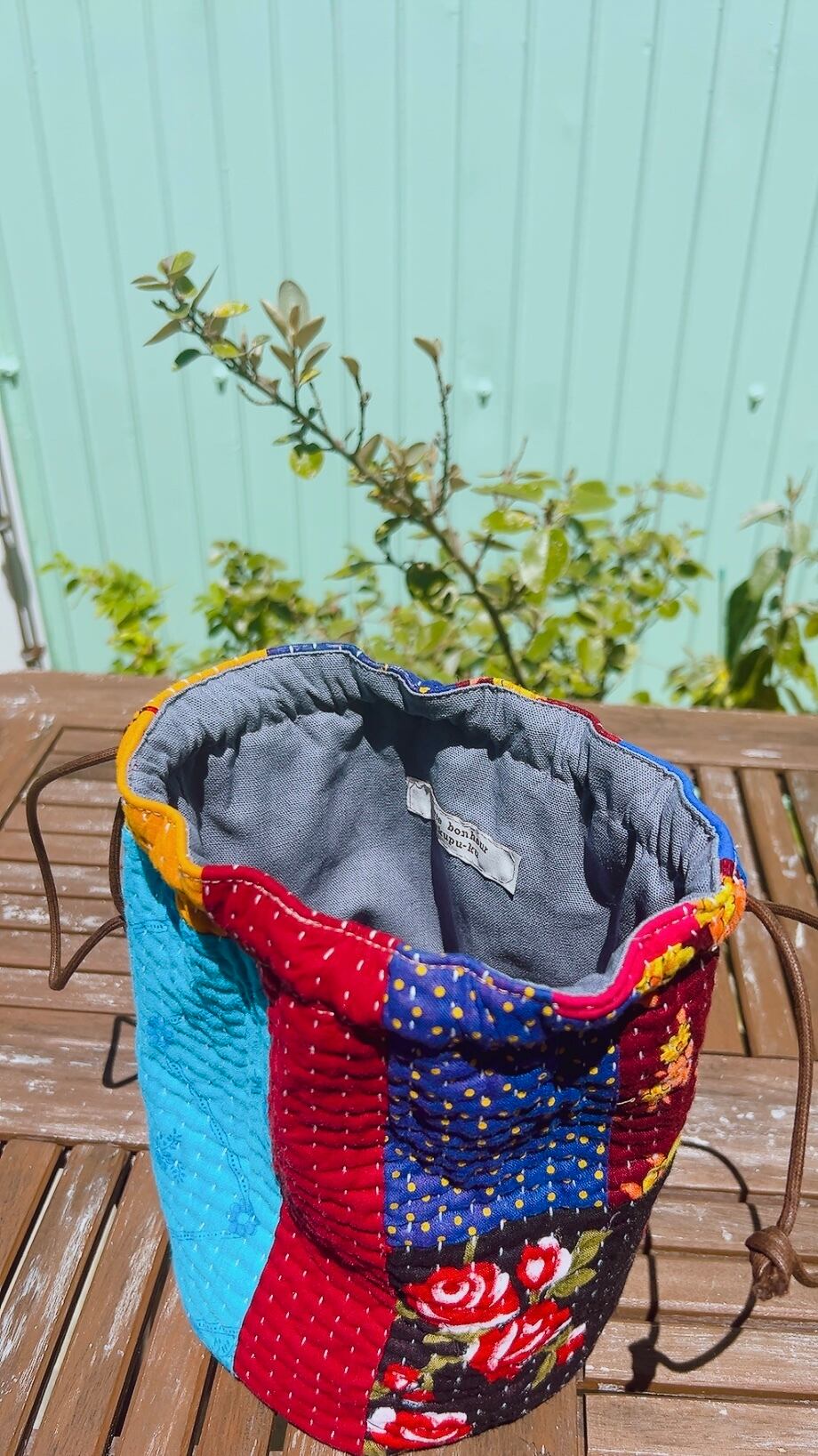 ヴィンテージラリーキルトの風合いを活かした、こだわりの巾着バッグです。