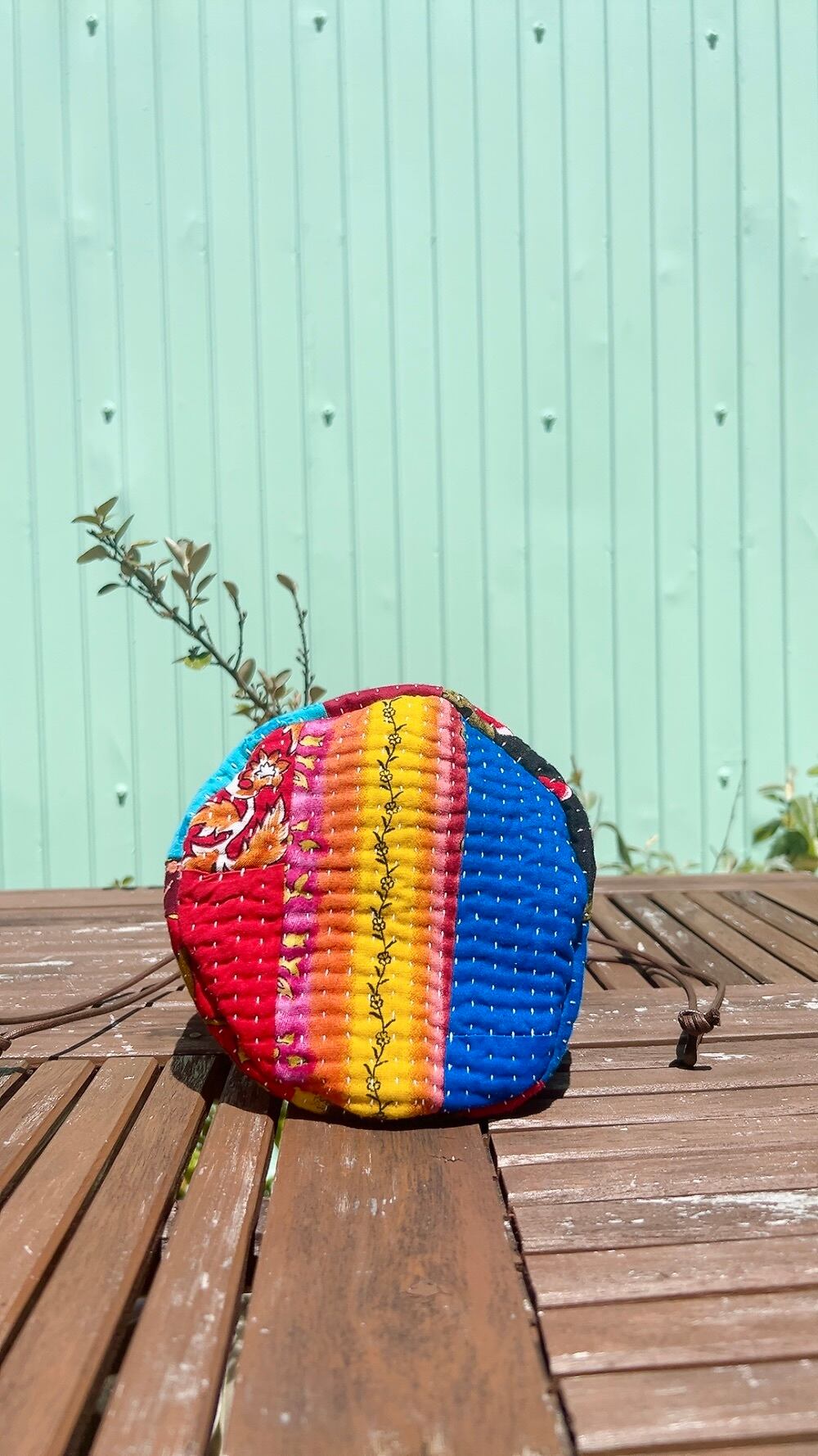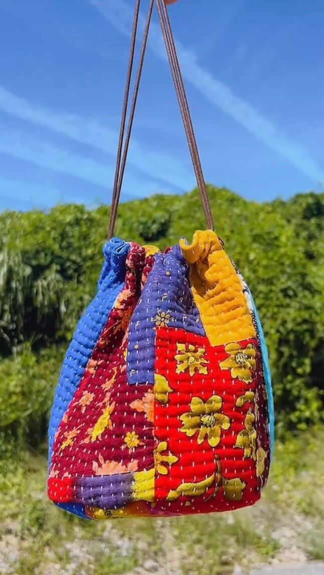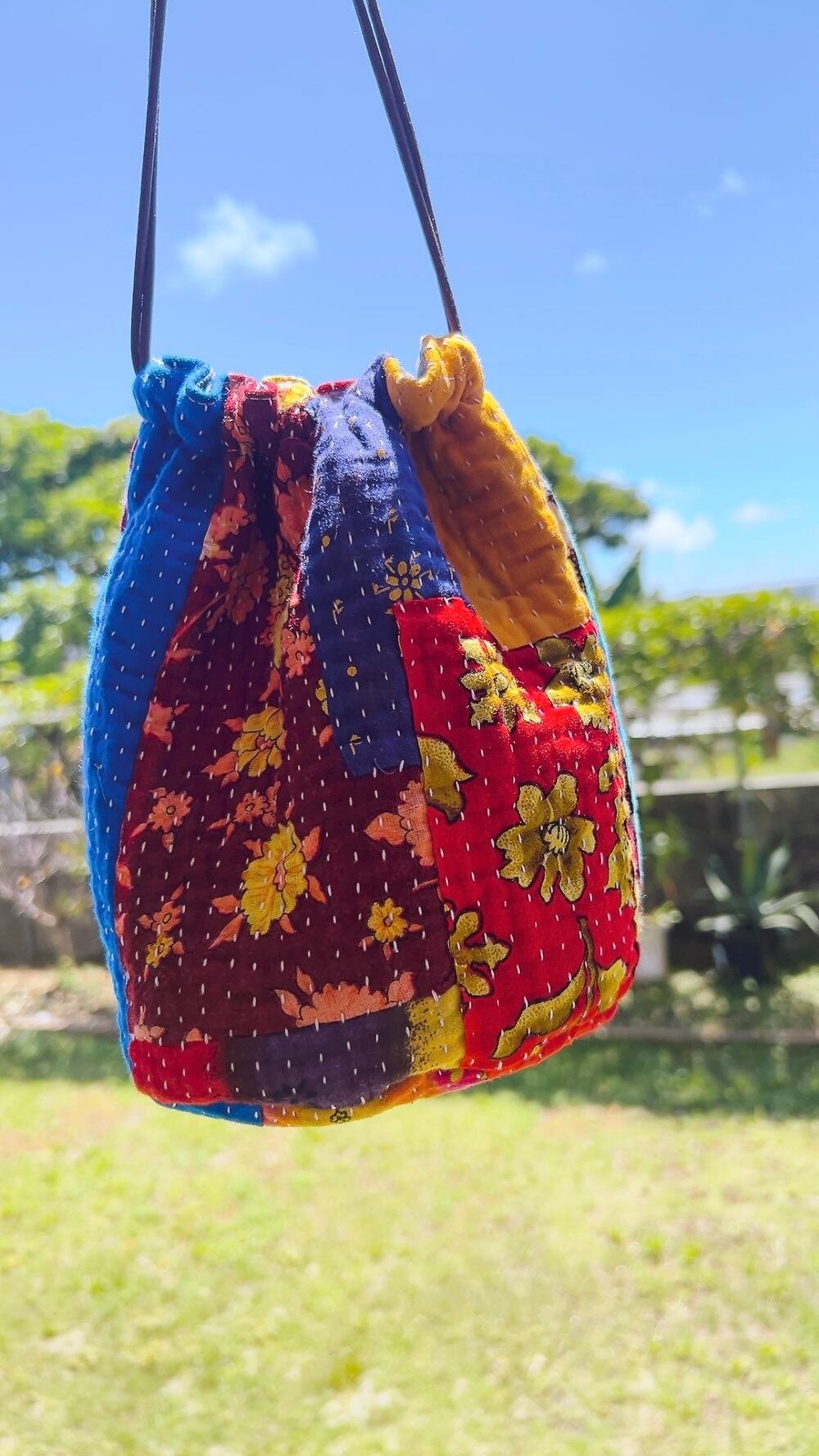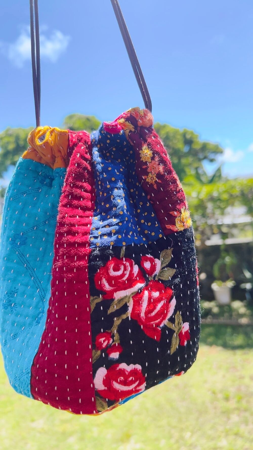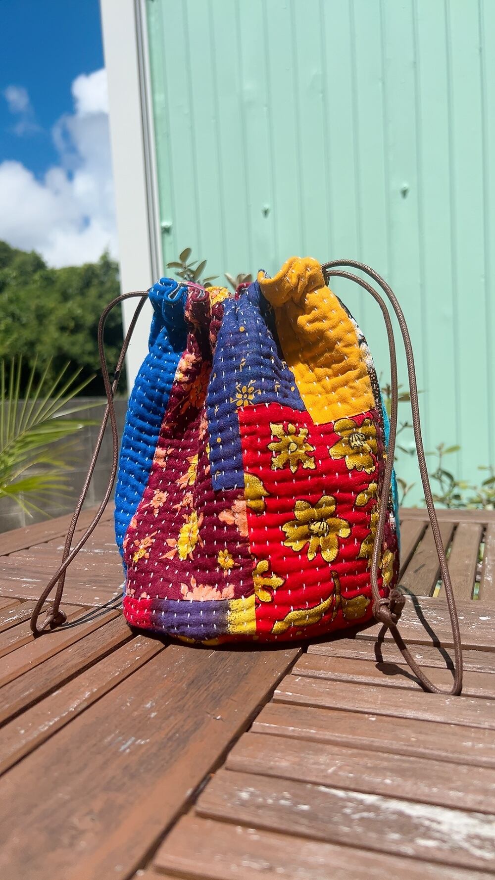 ヴィンテージラリーキルトの風合いを活かした、こだわりの巾着バッグです。