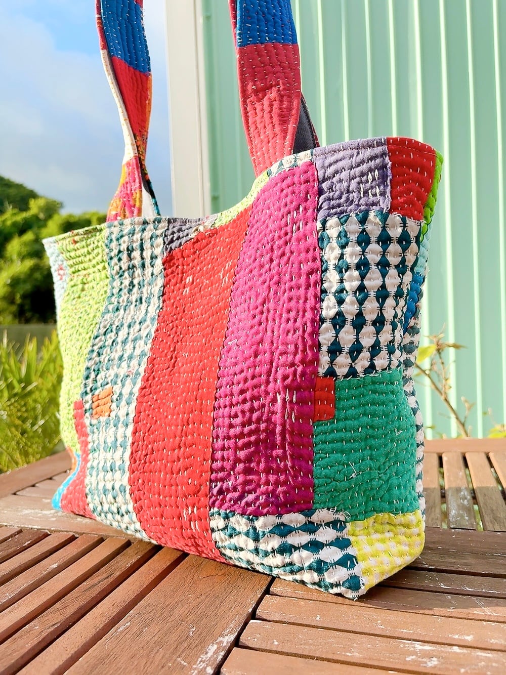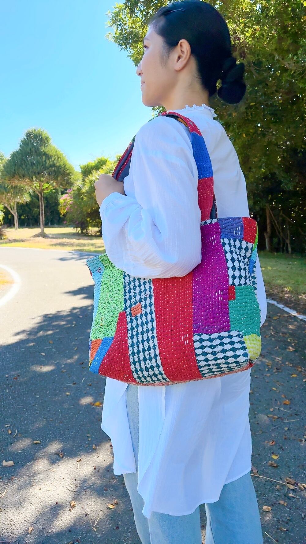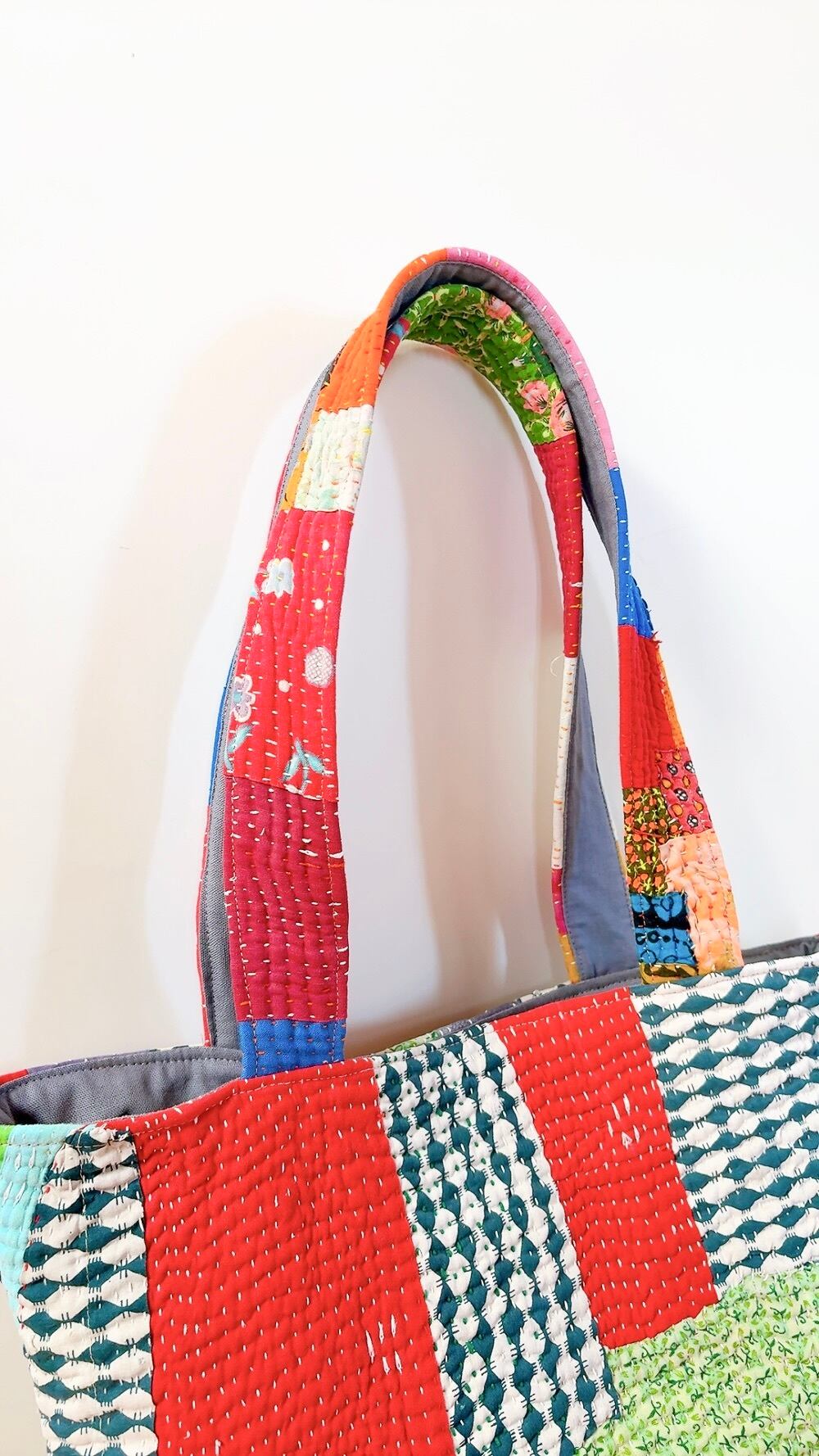 ポケットいっぱいトートバッグは、ヴィンテージラリーキルトを使用した魅力的なアイテムです。パッチワーク柄が施され、どこか懐かしさを感じさせながらも個性的なデザインが特徴です。