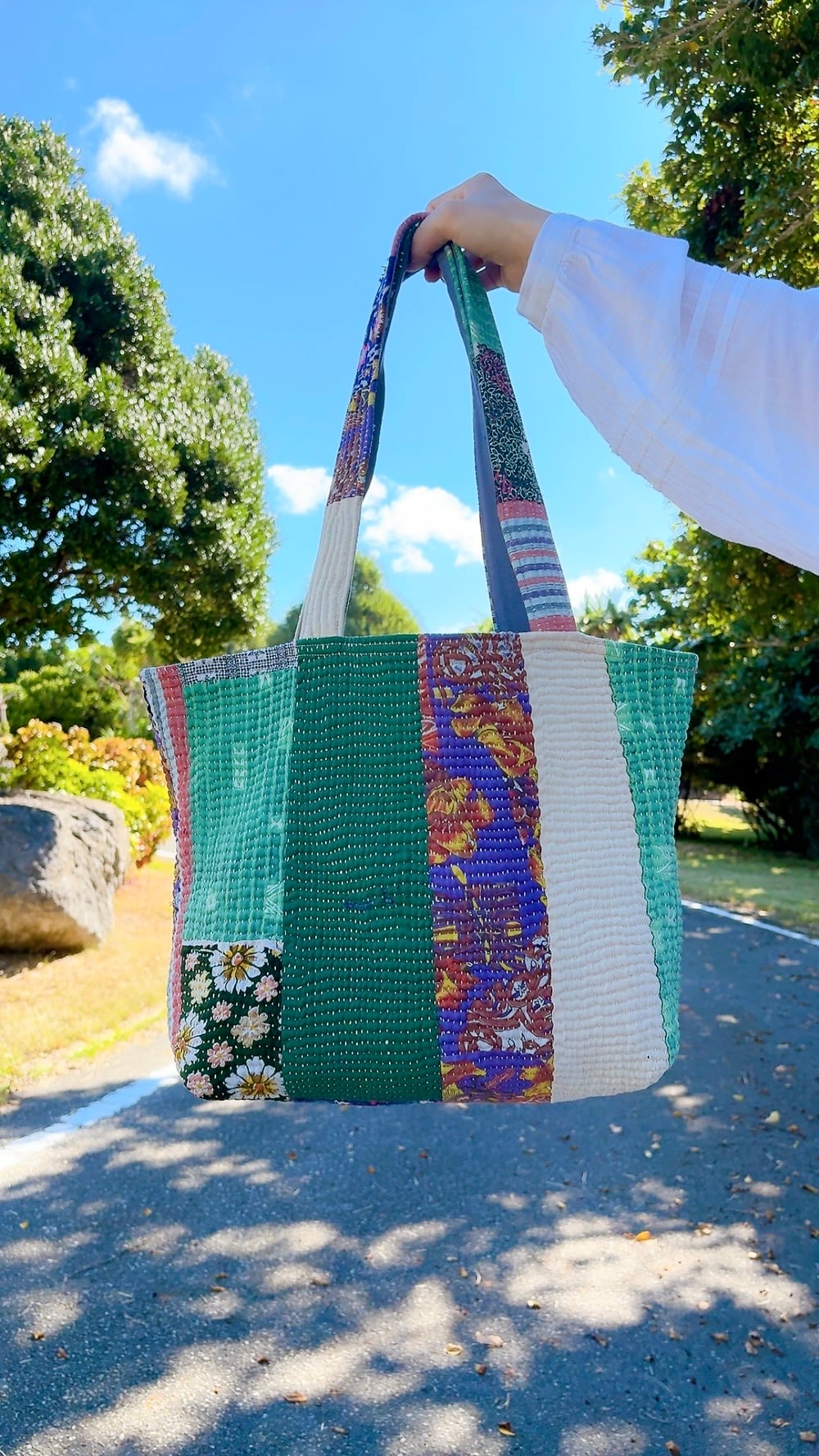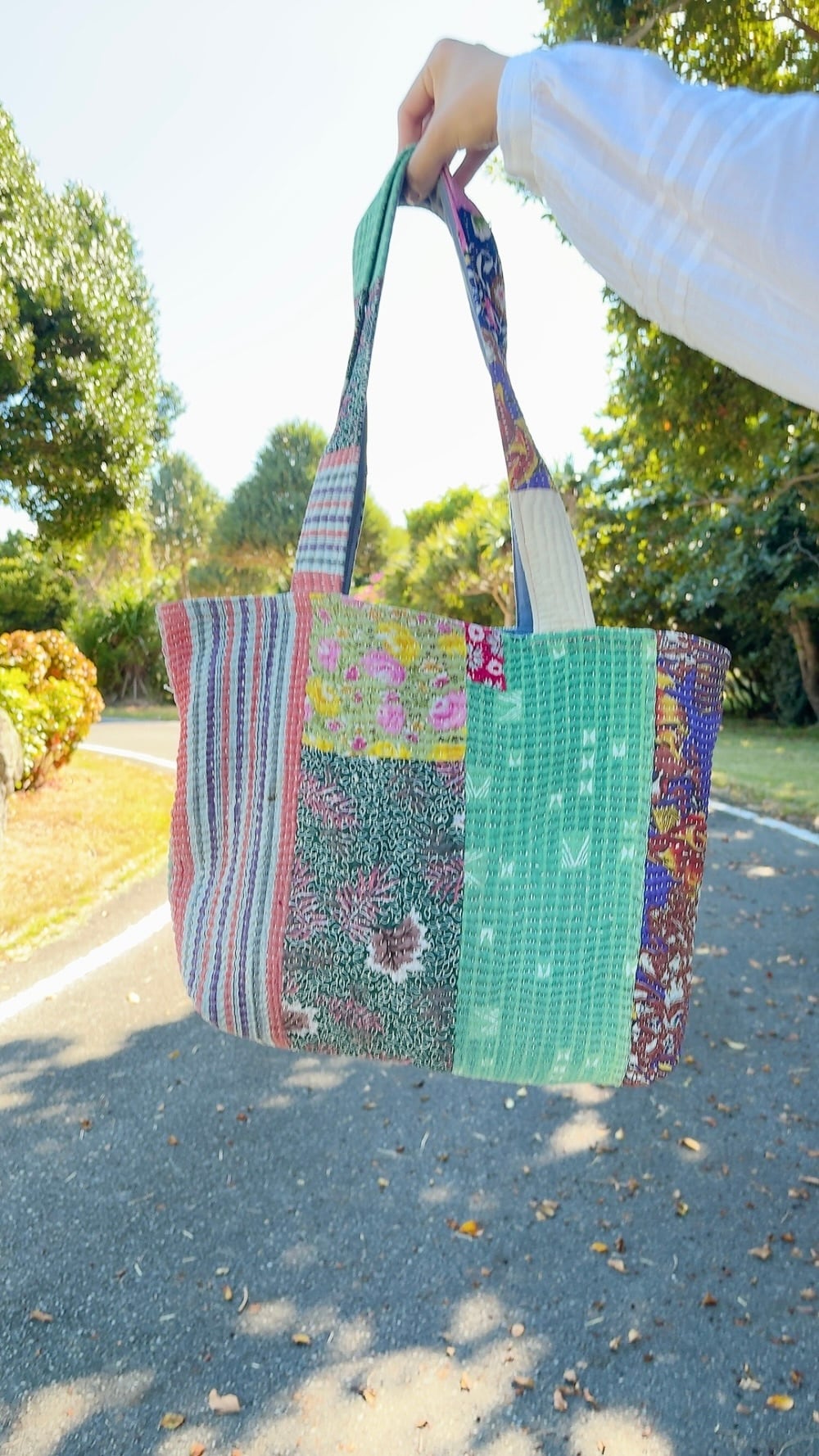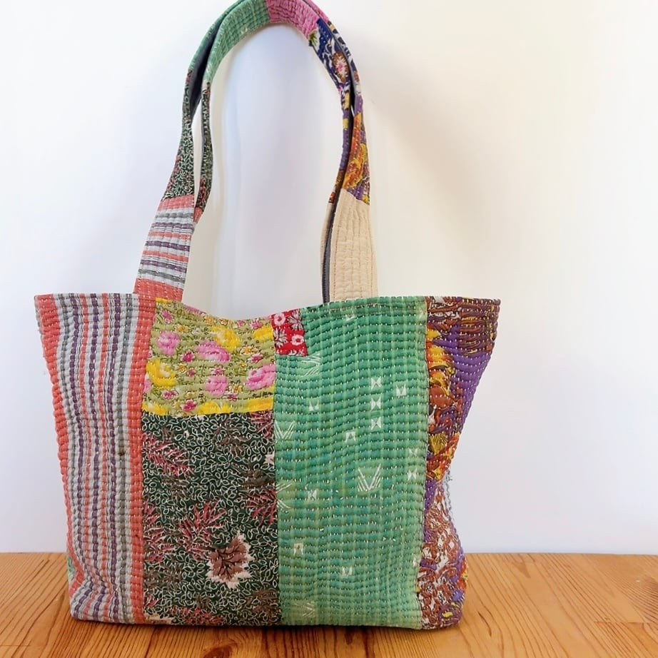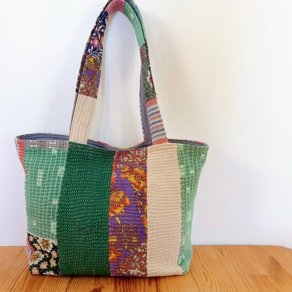 ポケットいっぱいトートバッグは、ヴィンテージラリーキルトを使用した魅力的なアイテムです。パッチワーク柄が施され、どこか懐かしさを感じさせながらも個性的なデザインが特徴です。