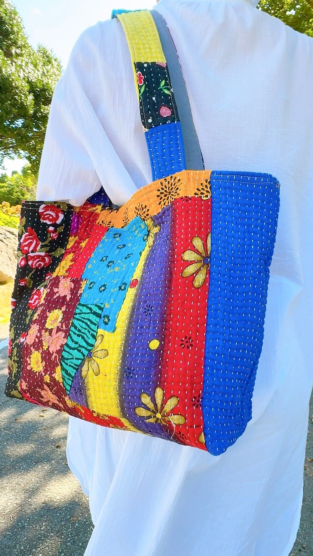 ポケットいっぱいトートバッグは、ヴィンテージラリーキルトを使用した魅力的なアイテムです。パッチワーク柄が施され、どこか懐かしさを感じさせながらも個性的なデザインが特徴です。