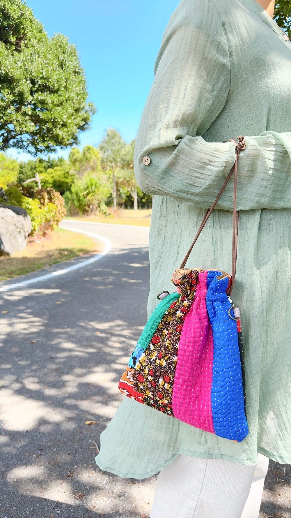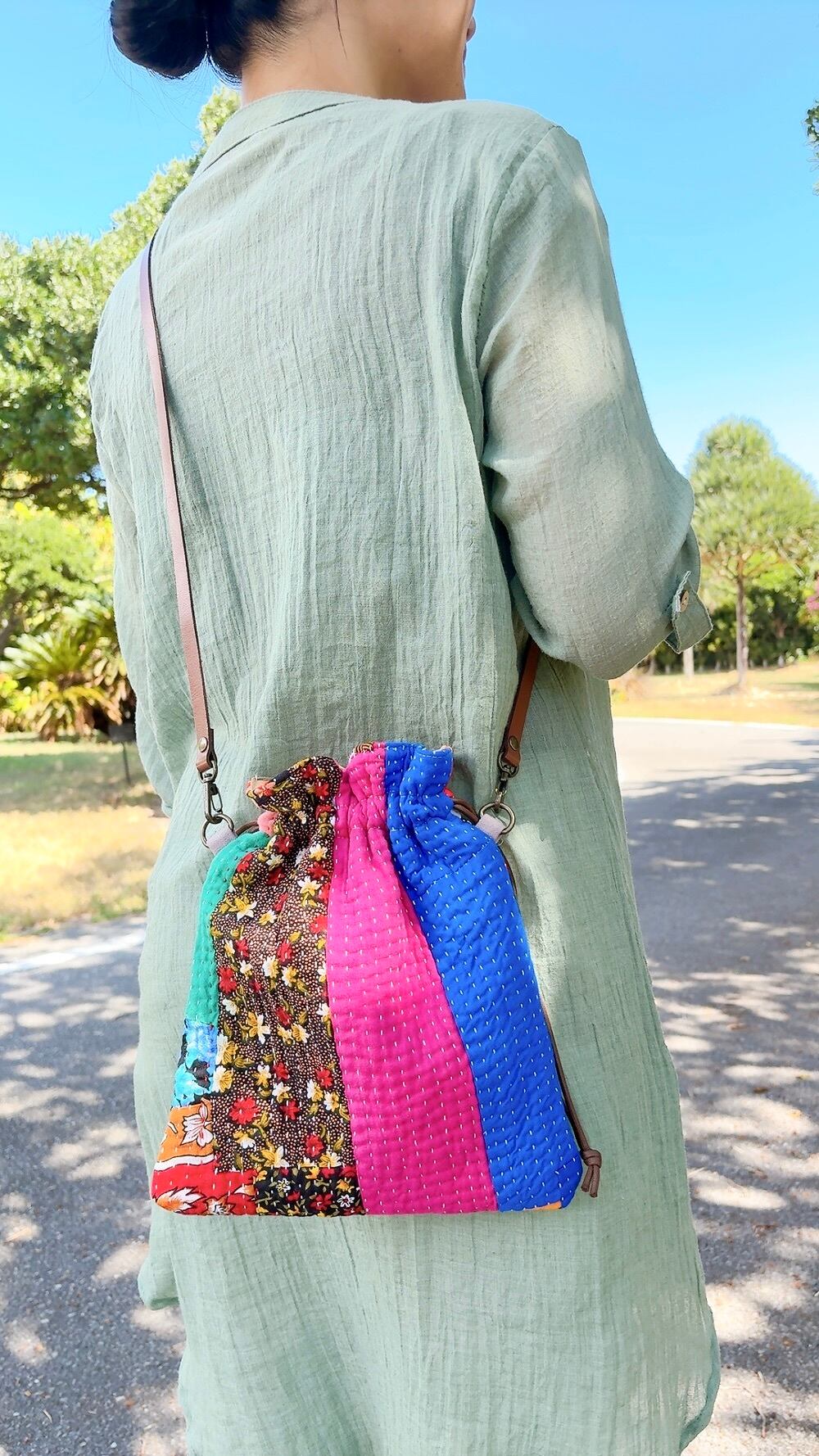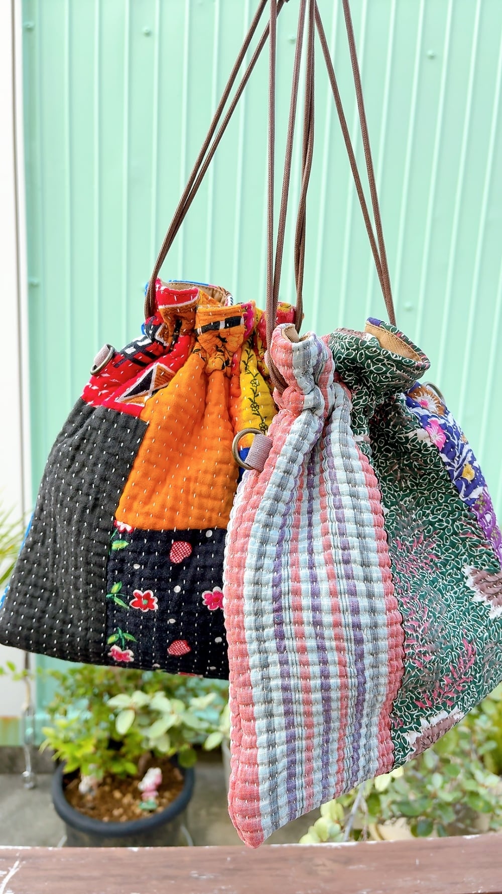 ラリーキルトで仕立てた巾着バッグ。
