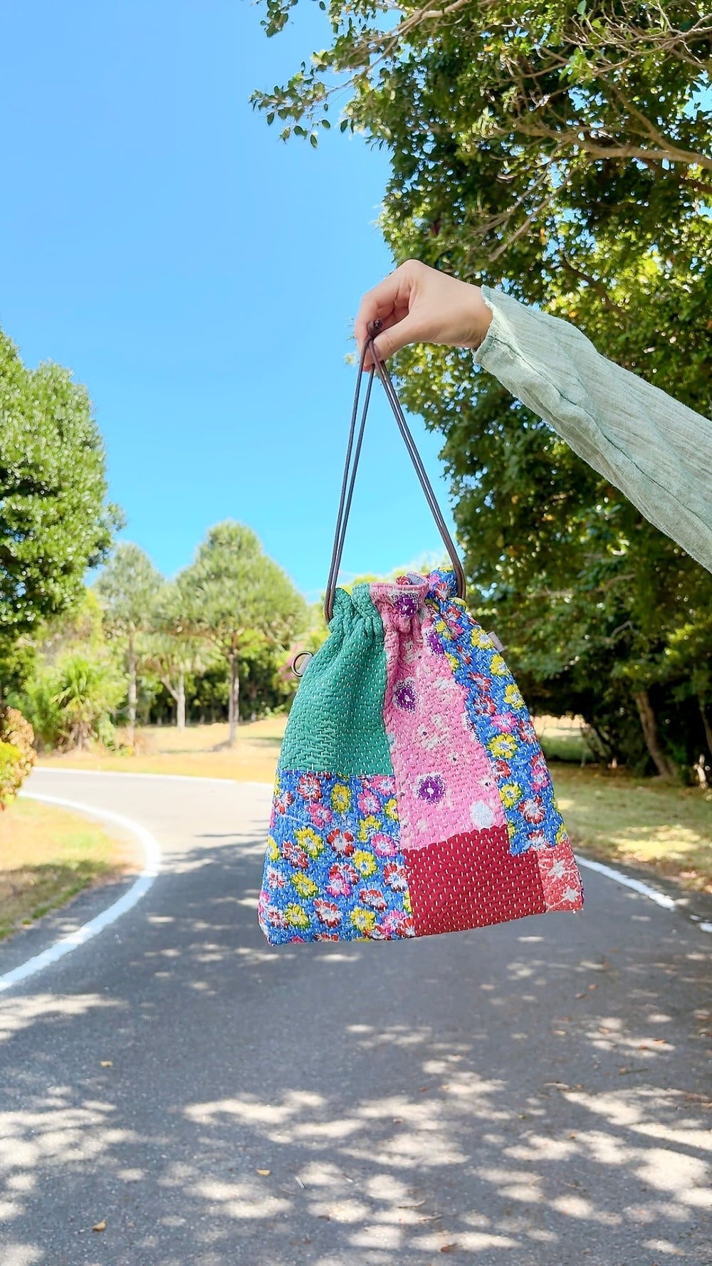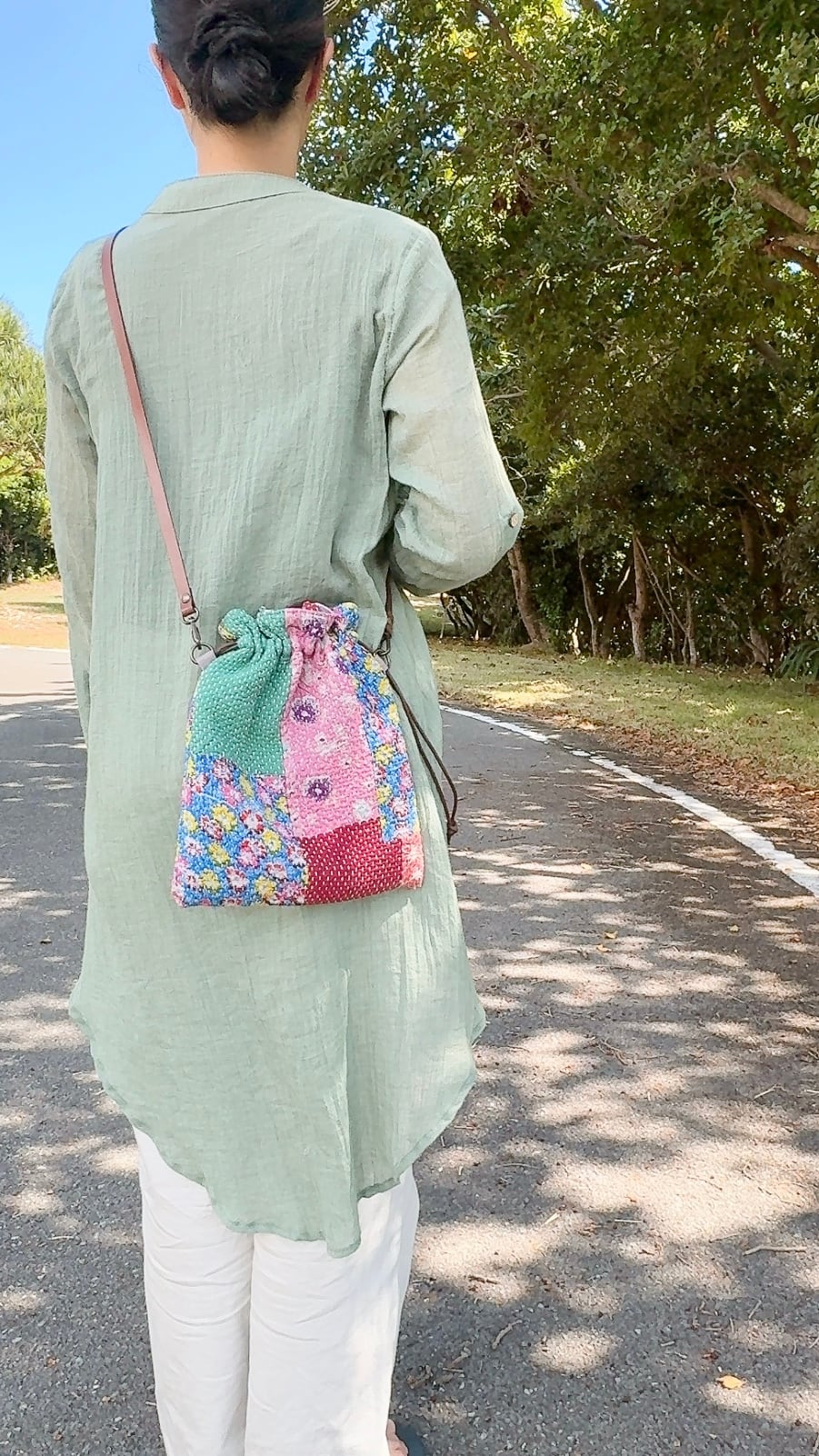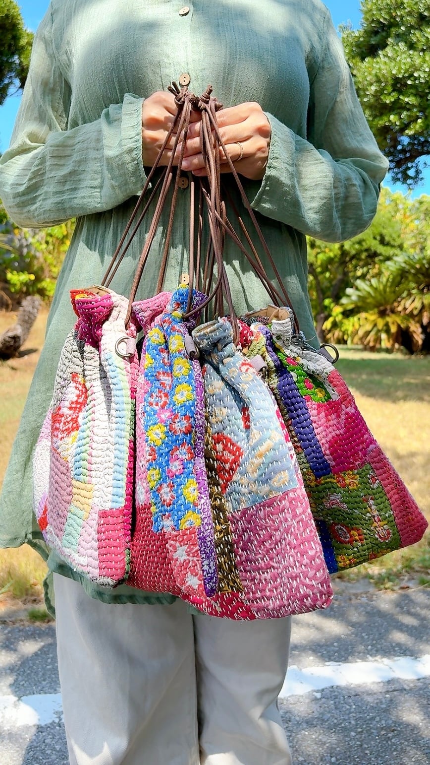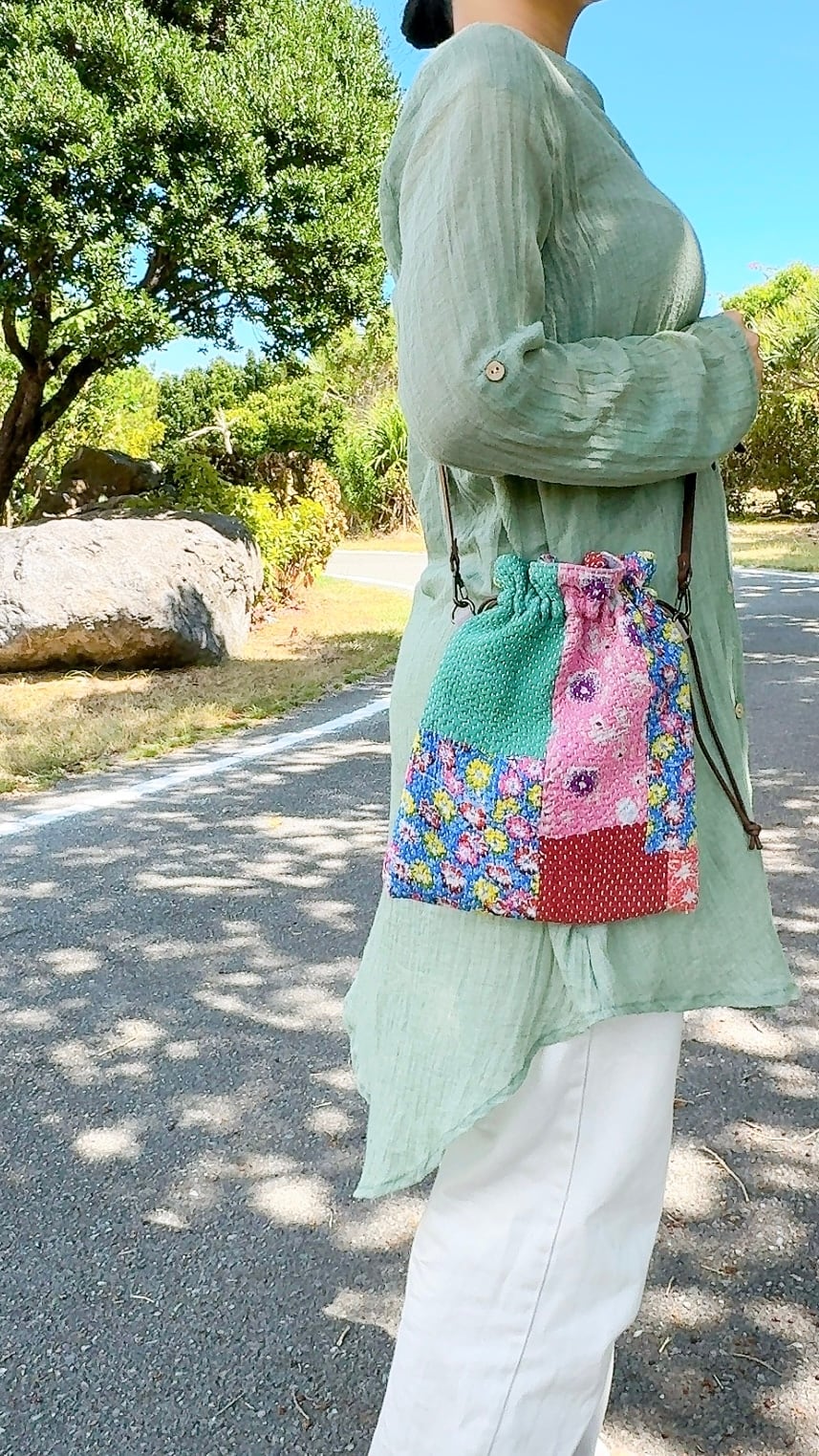 ラリーキルトで仕立てた巾着バッグ。