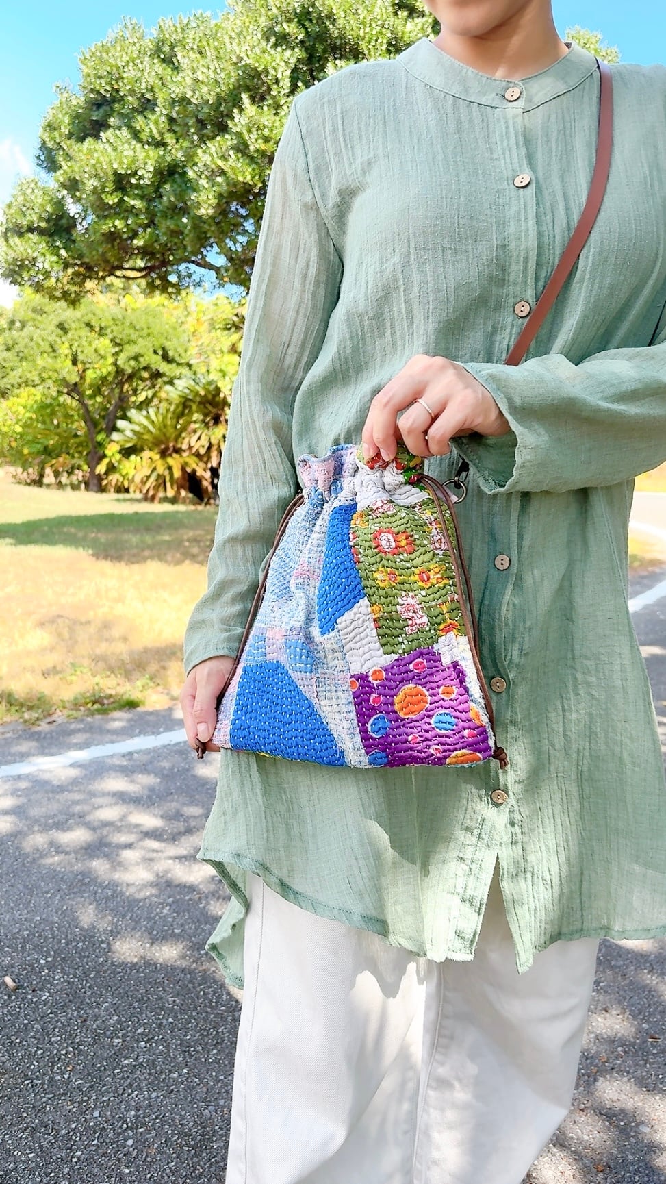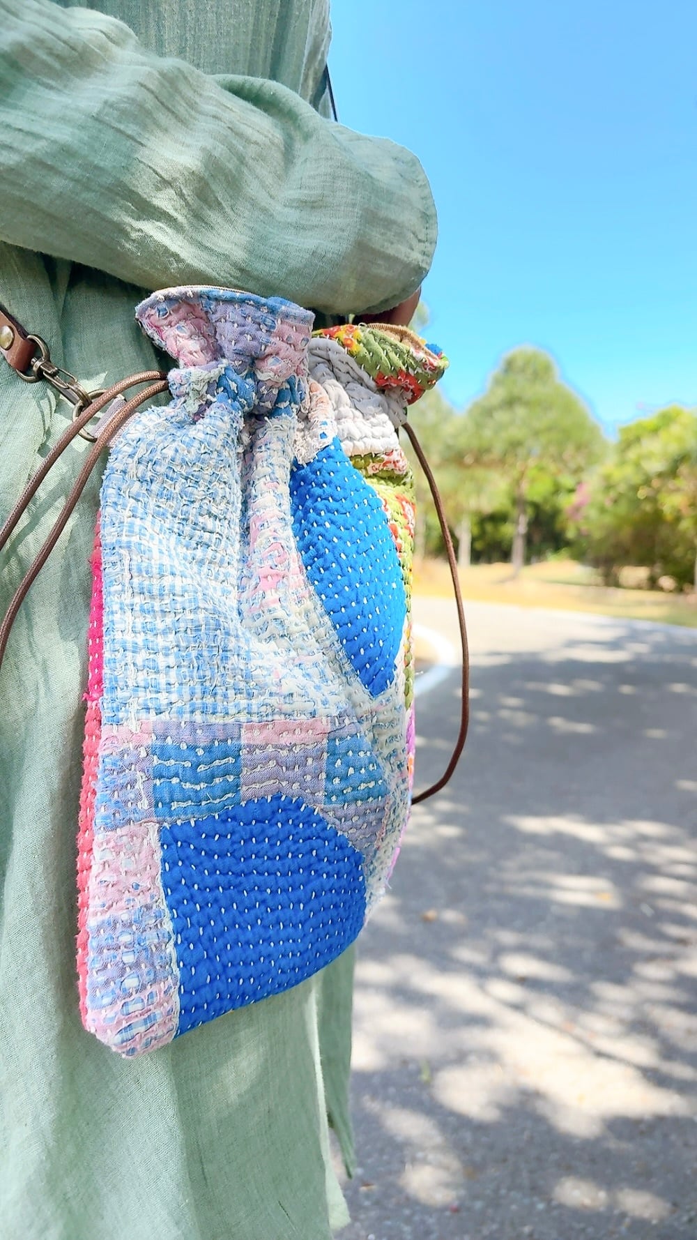 ラリーキルトで仕立てた巾着バッグ。