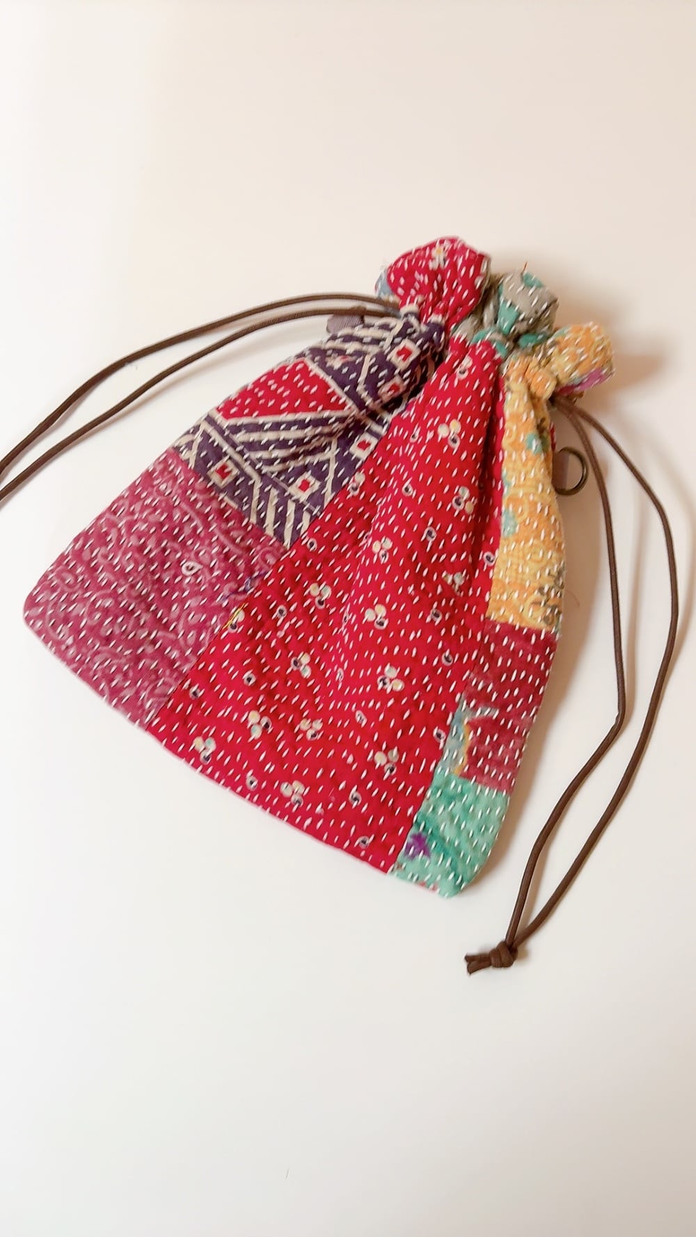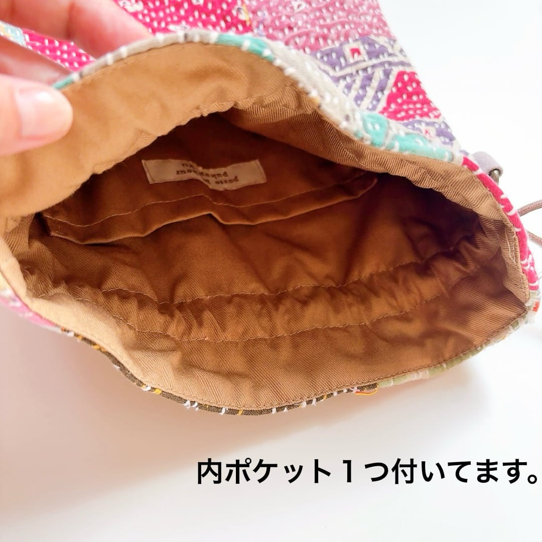 ラリーキルトで仕立てた巾着バッグ。