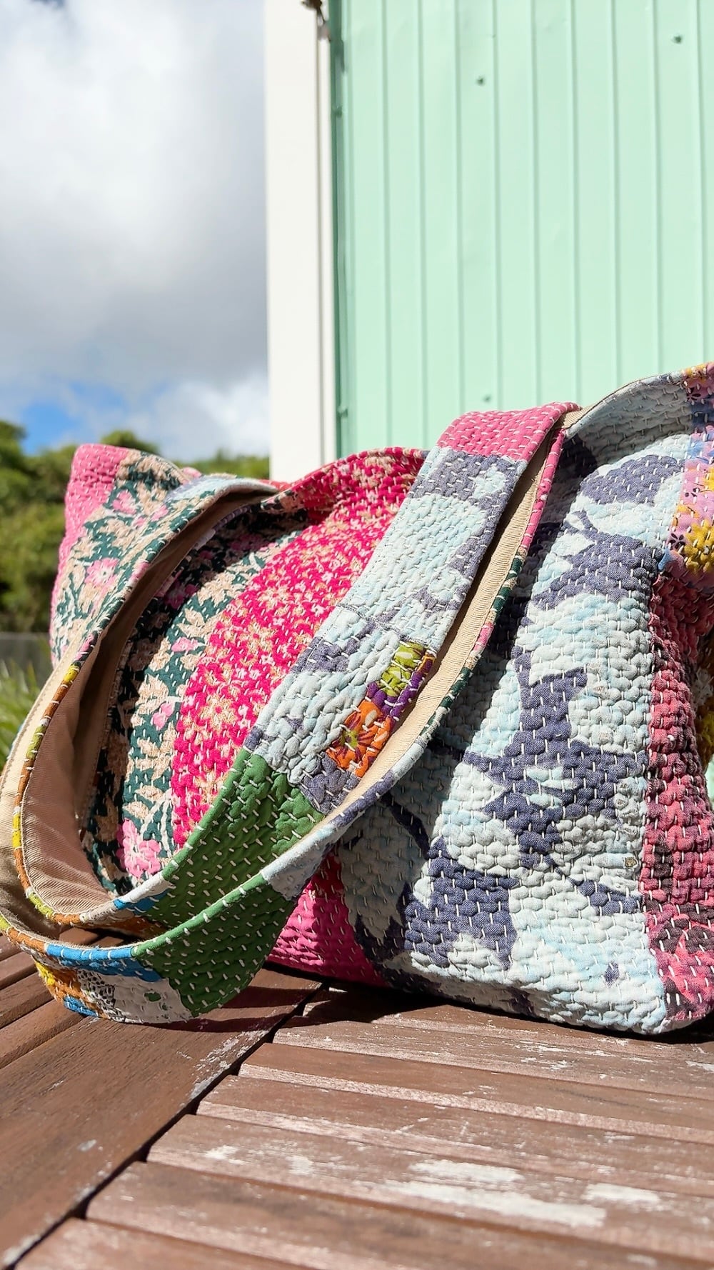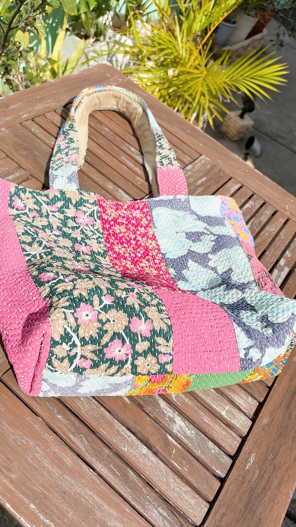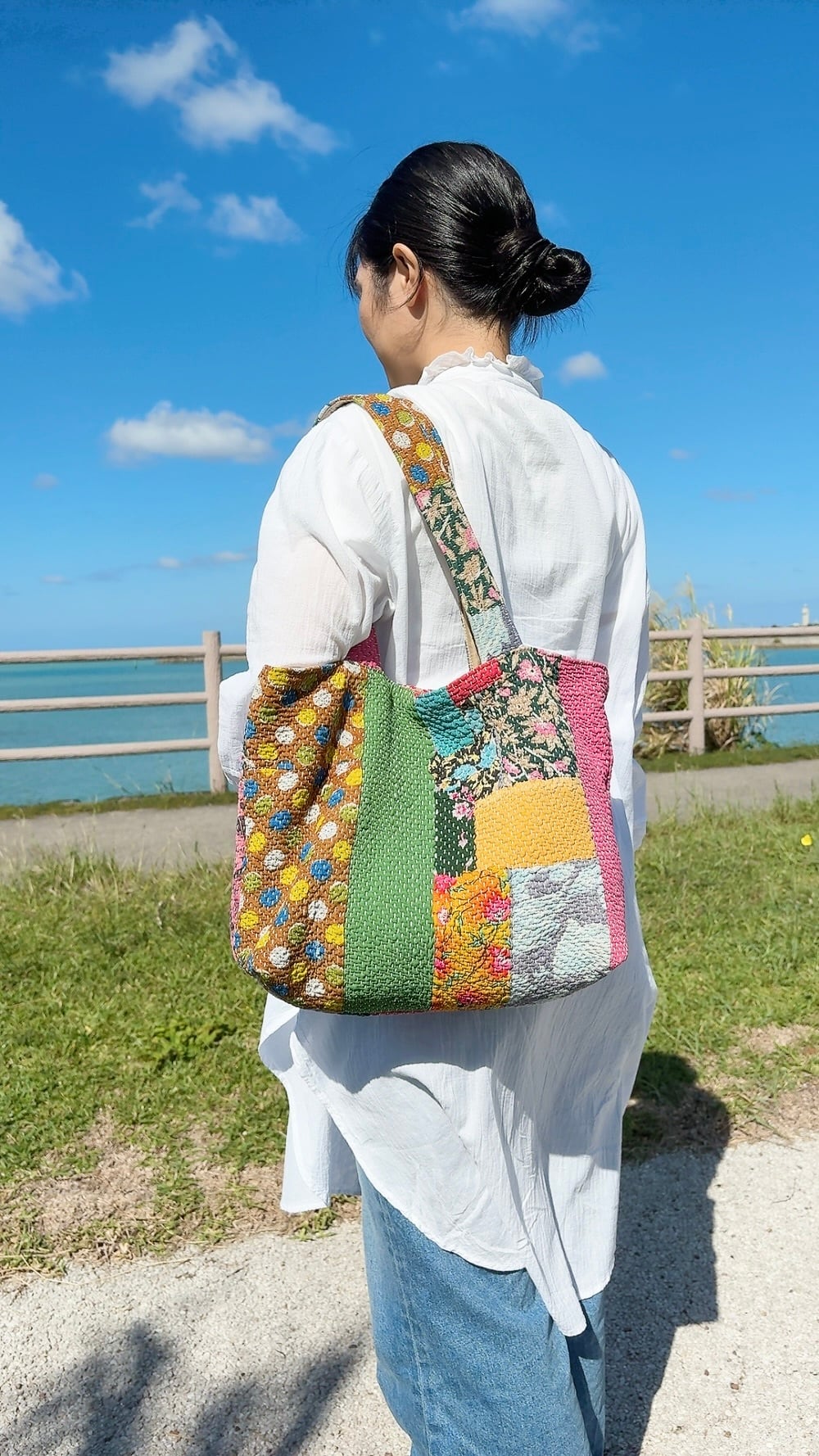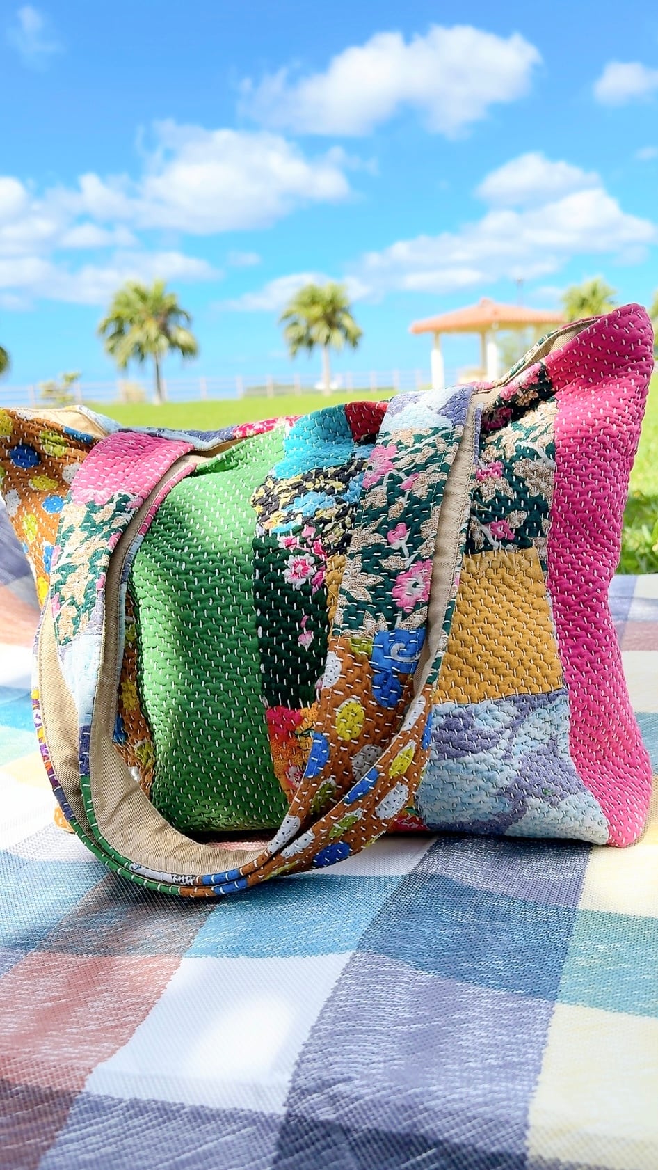 ポケットいっぱいトートバッグは、ヴィンテージラリーキルトを使用した魅力的なアイテムです。パッチワーク柄が施され、どこか懐かしさを感じさせながらも個性的なデザインが特徴です。
