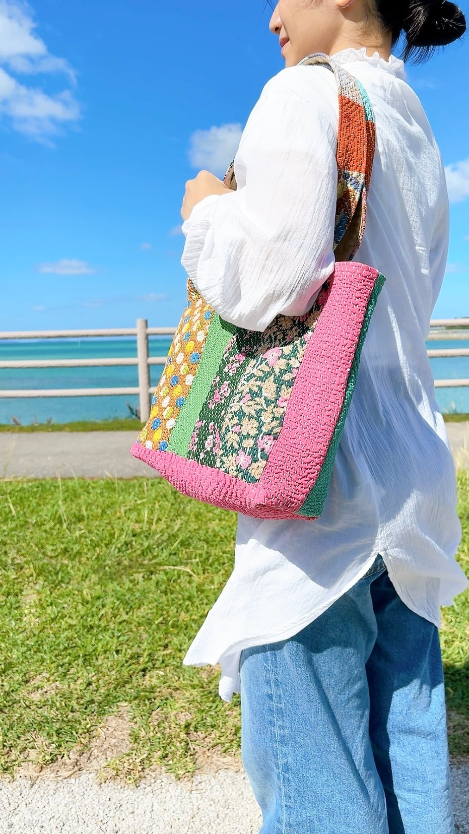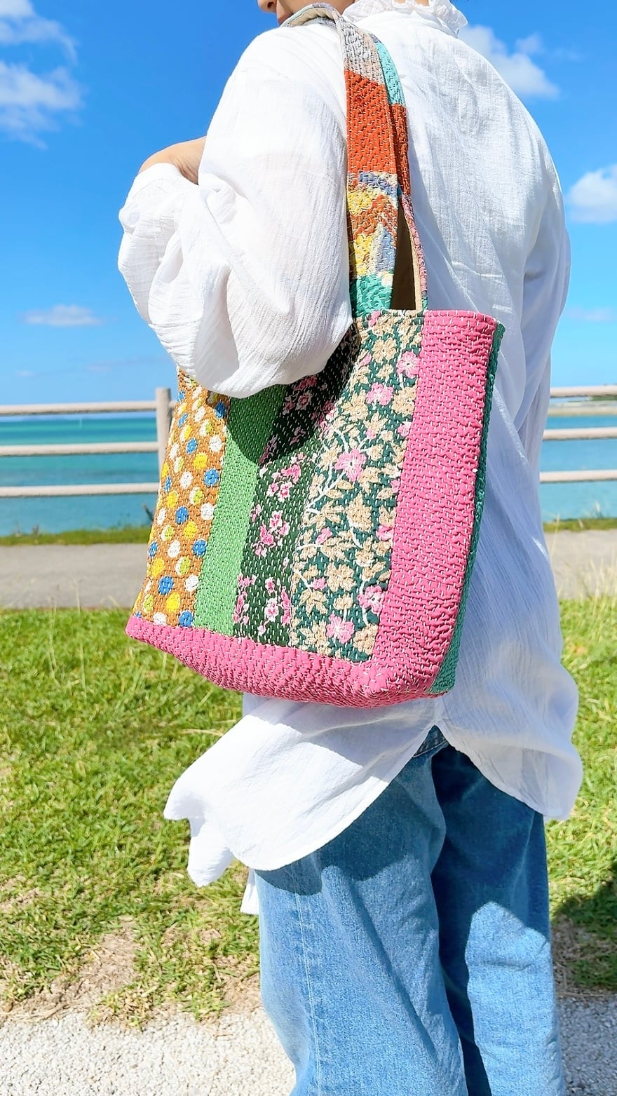 ポケットいっぱいトートバッグは、ヴィンテージラリーキルトを使用した魅力的なアイテムです。パッチワーク柄が施され、どこか懐かしさを感じさせながらも個性的なデザインが特徴です。