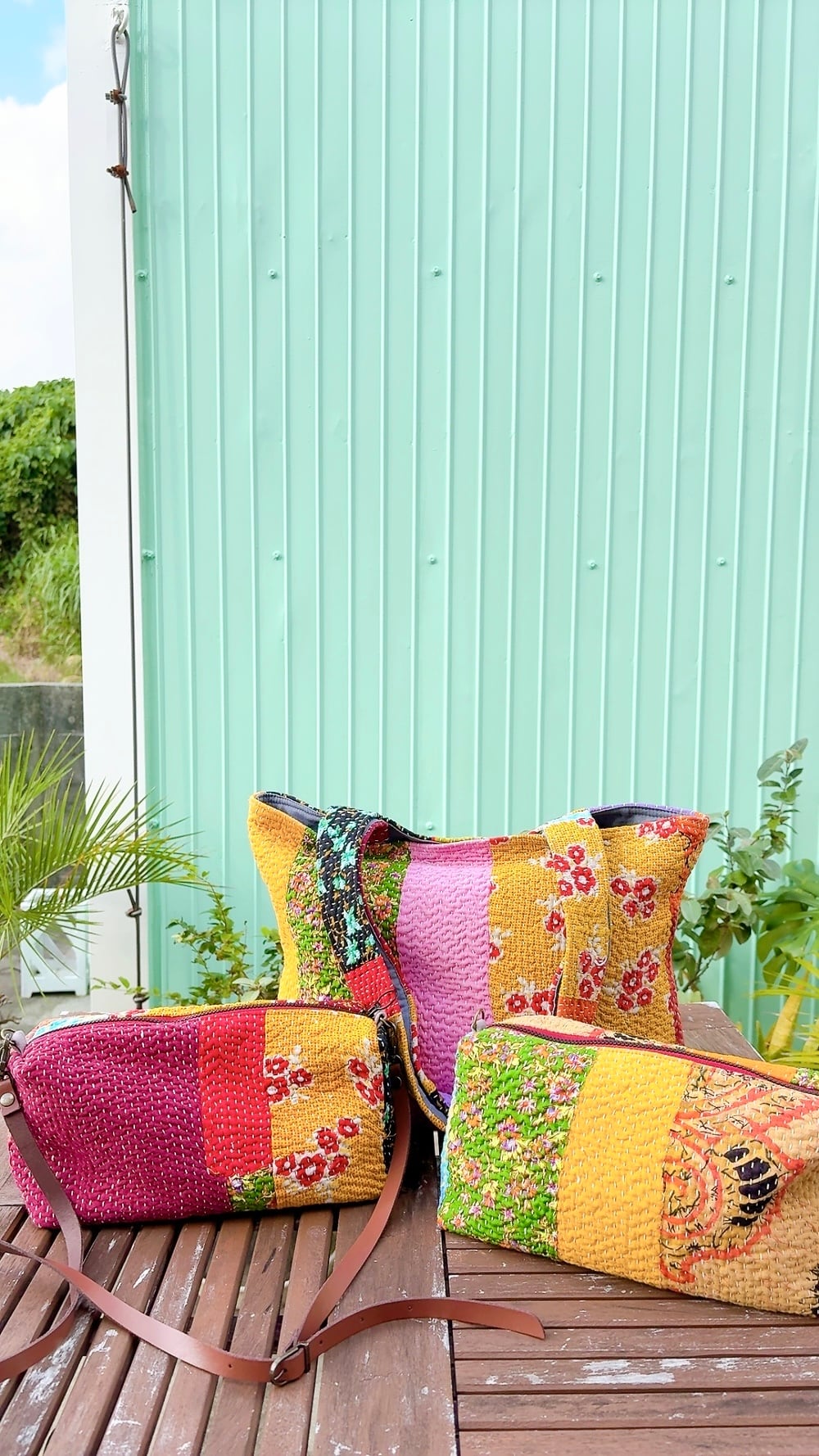 たっぷりマチが魅力のショルダーバッグです!ラリーキルトの独特なデザインがアクセントとなり、爽やかな色合いが気分も上がります。