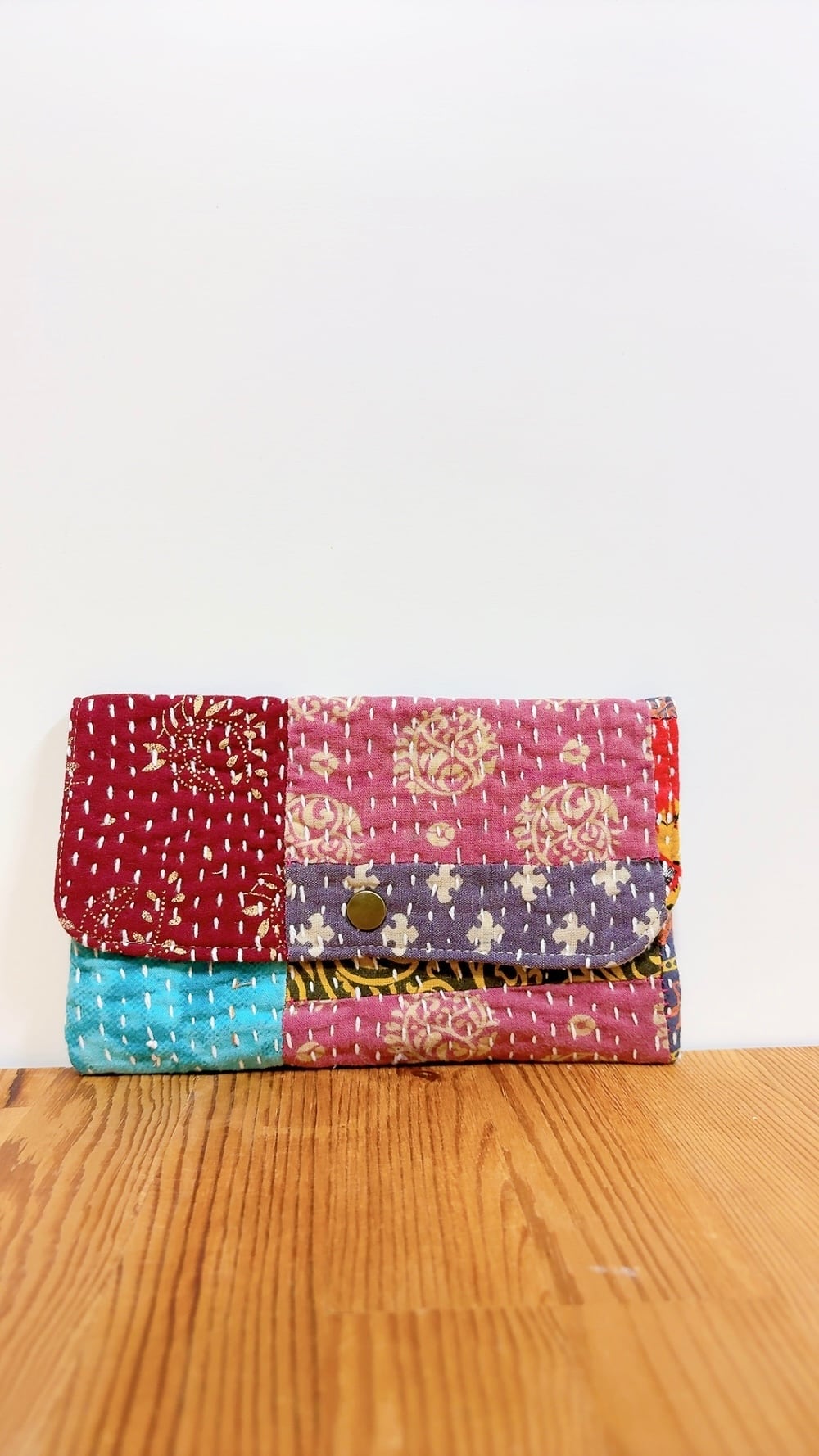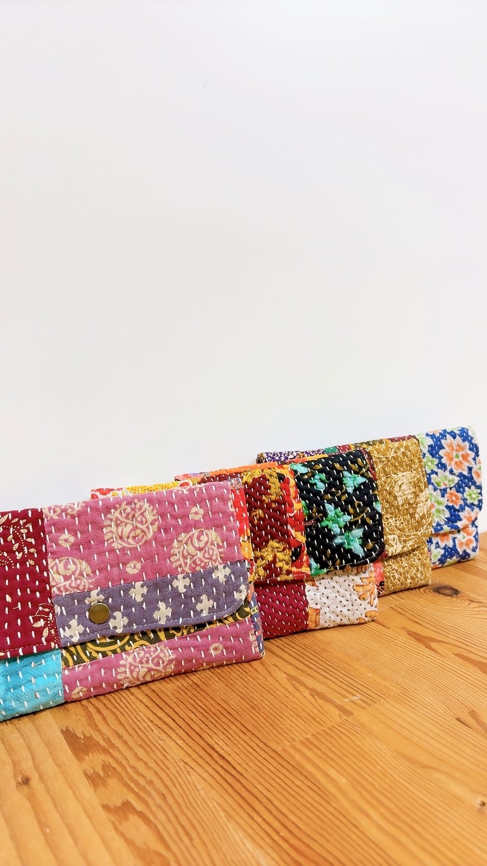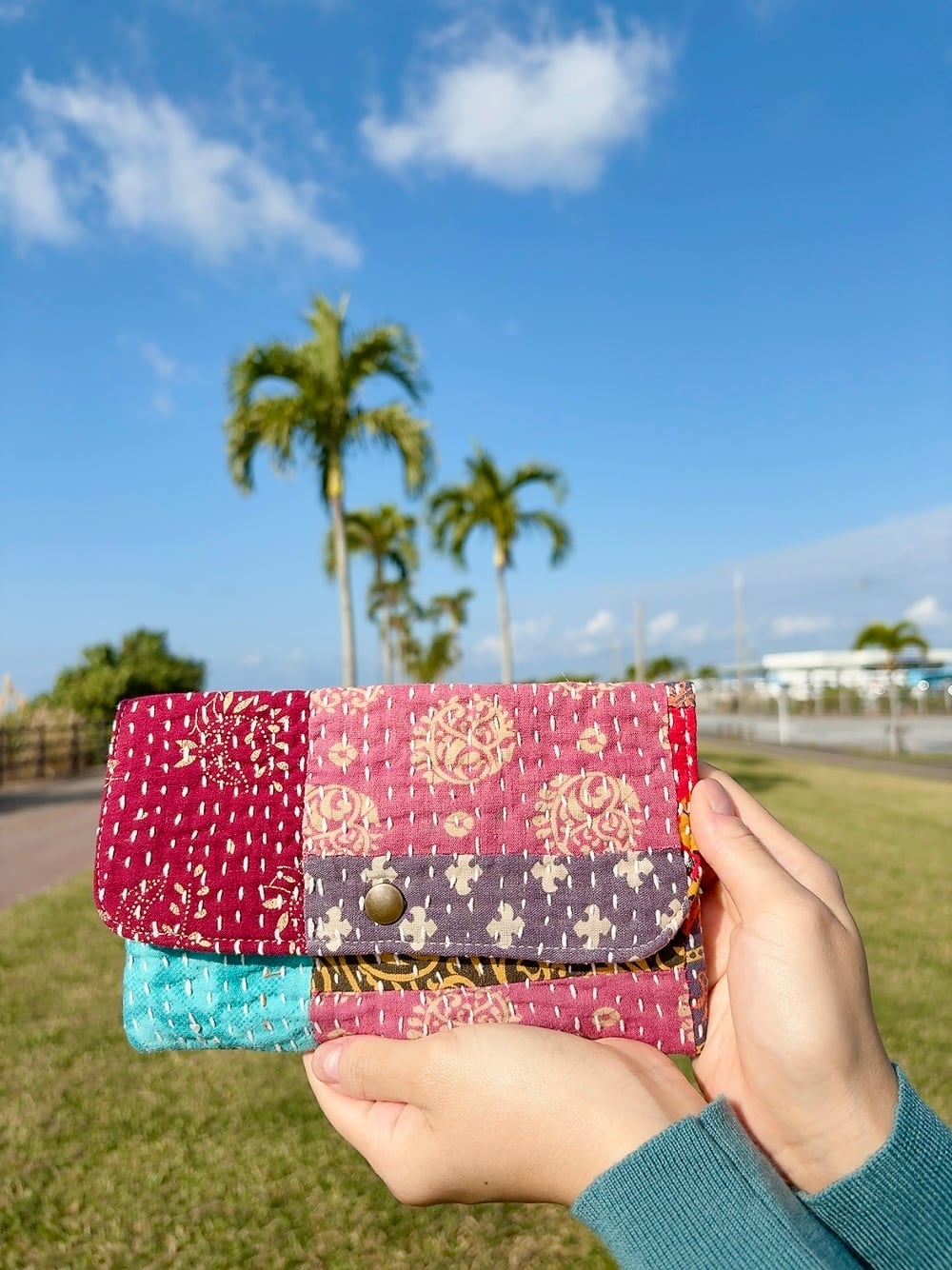 ヴィンテージラリーキルトから作られたフラットポーチです。コンパクトなサイズ感で、通帳入れとしても便利にお使いいただけます。