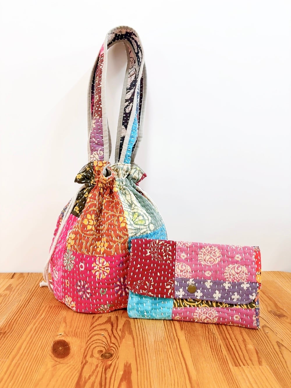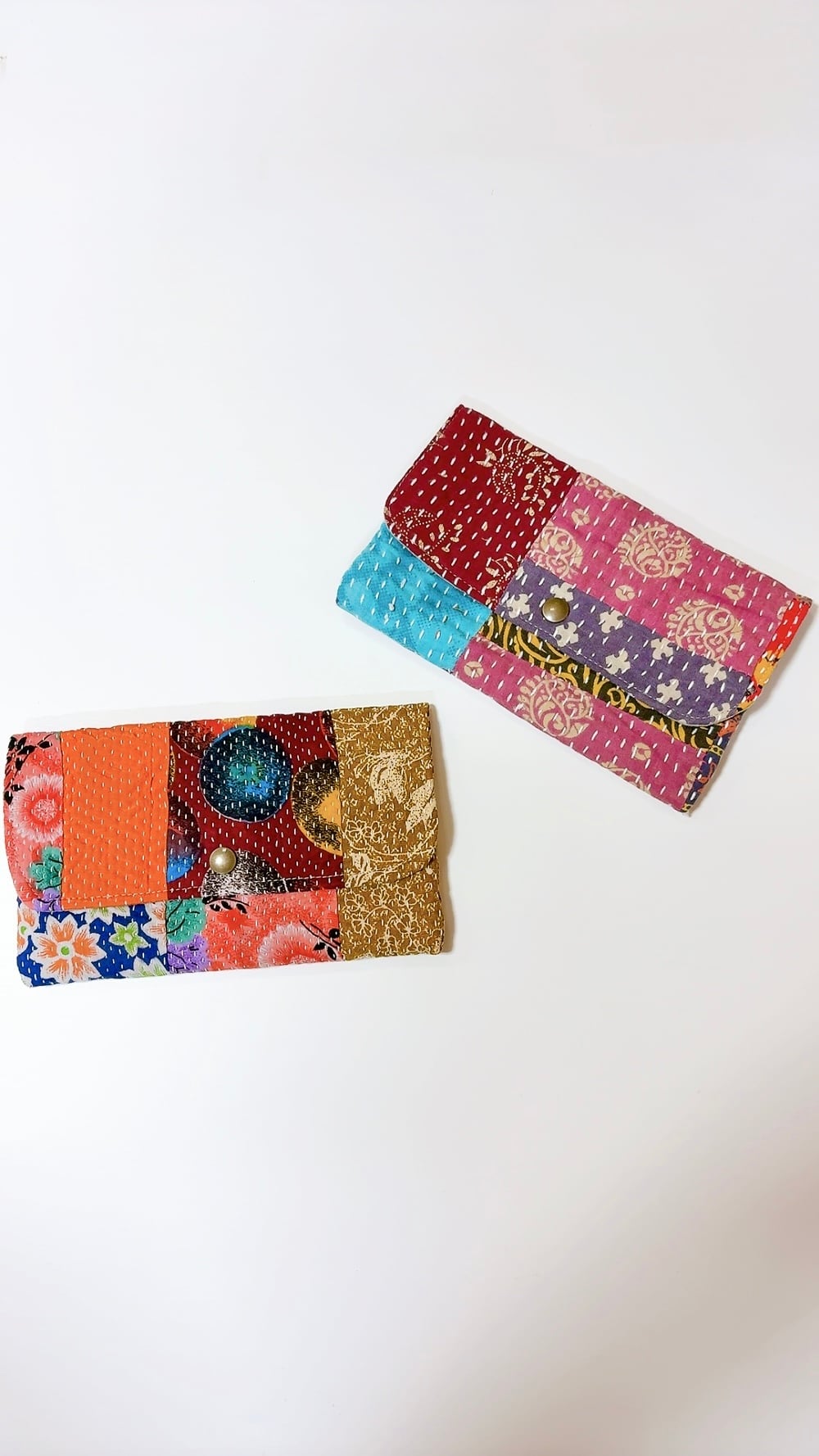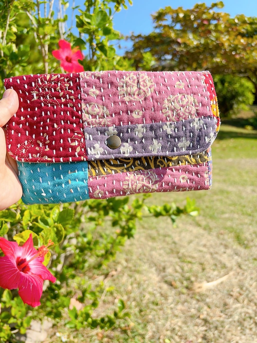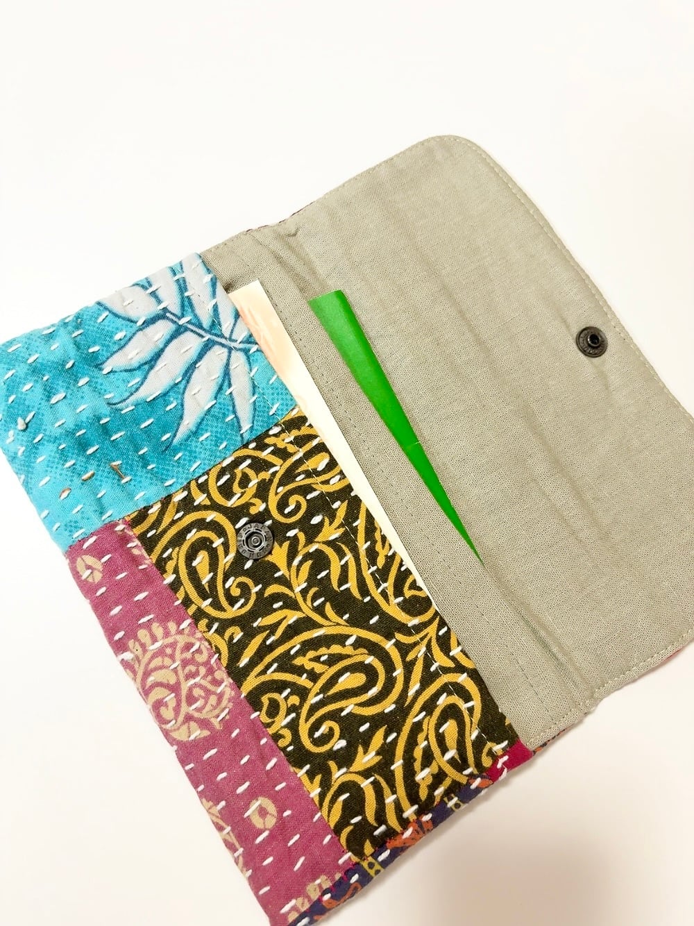 ヴィンテージラリーキルトから作られたフラットポーチです。コンパクトなサイズ感で、通帳入れとしても便利にお使いいただけます。