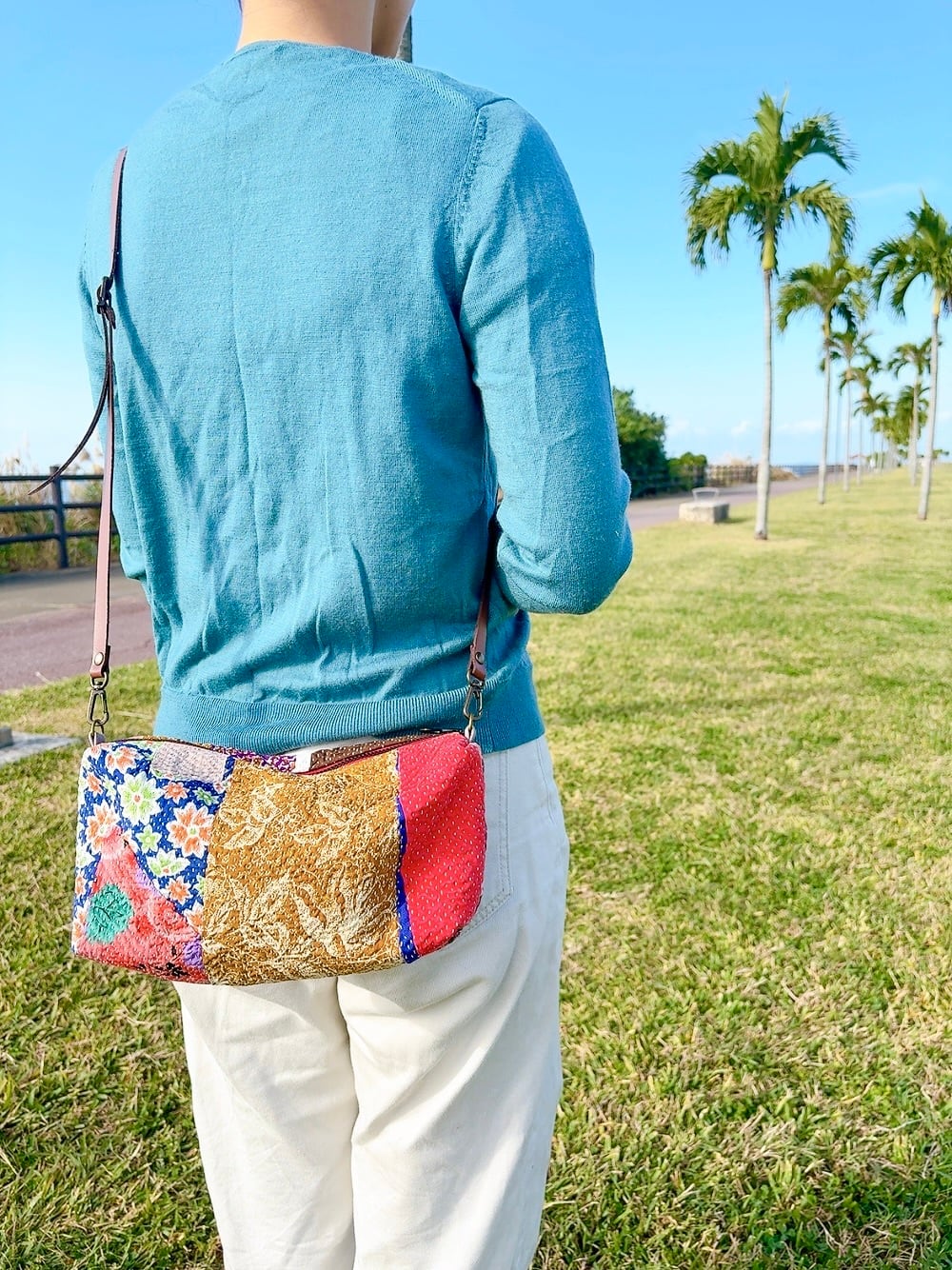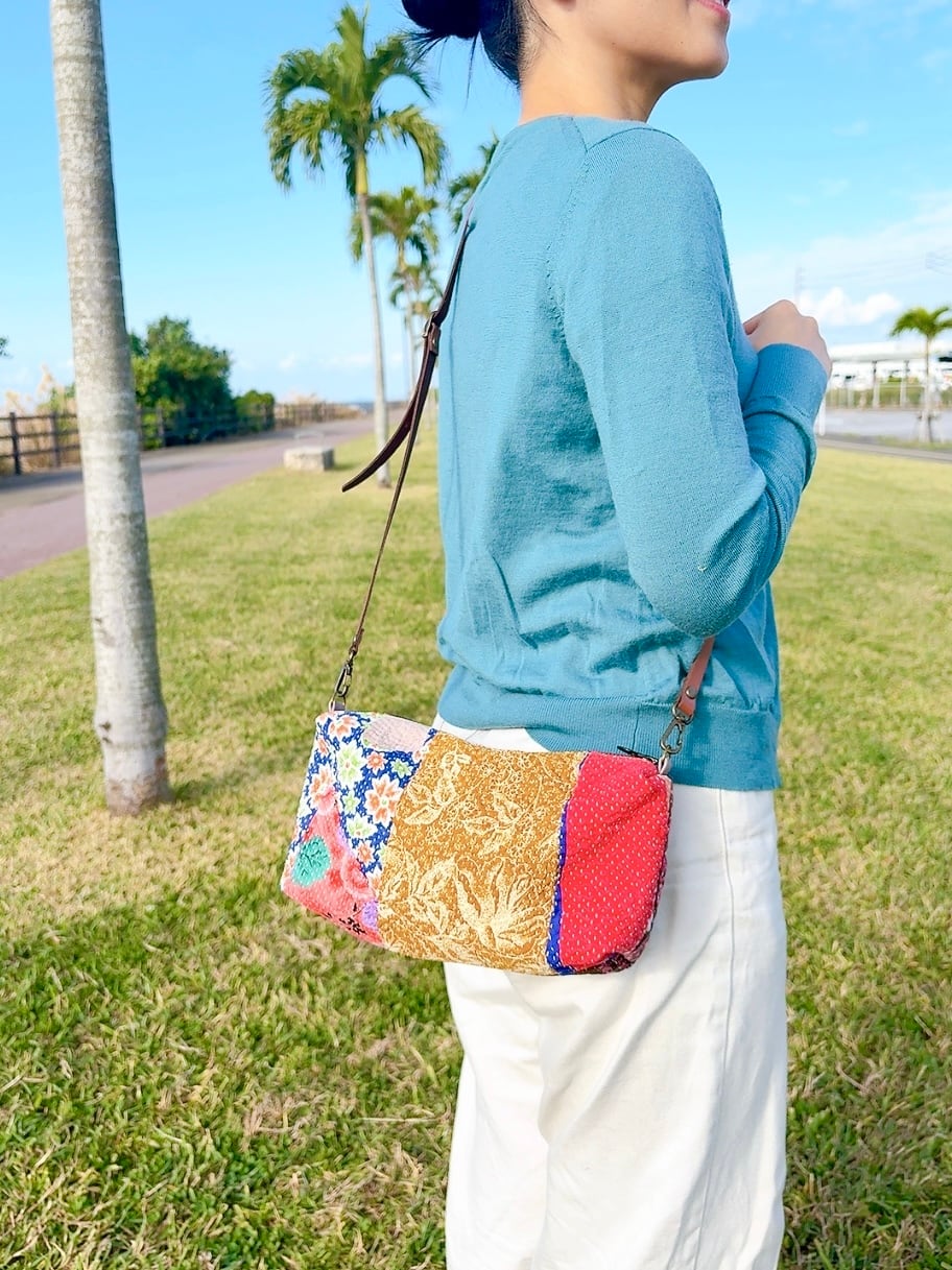 たっぷりマチが魅力のショルダーバッグです!ラリーキルトの独特なデザインがアクセントとなり、爽やかな色合いが気分も上がります。