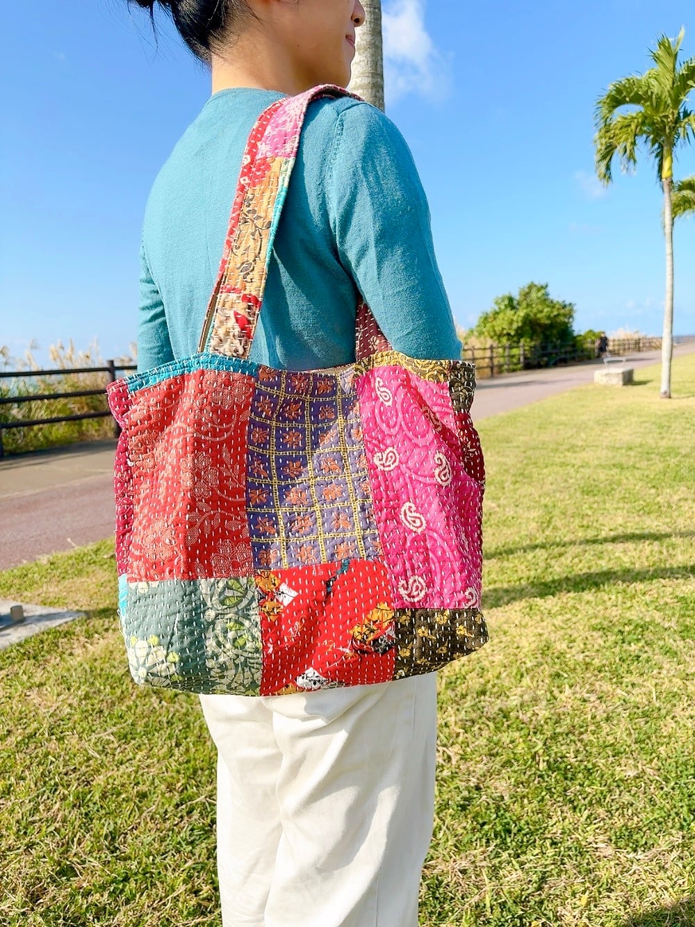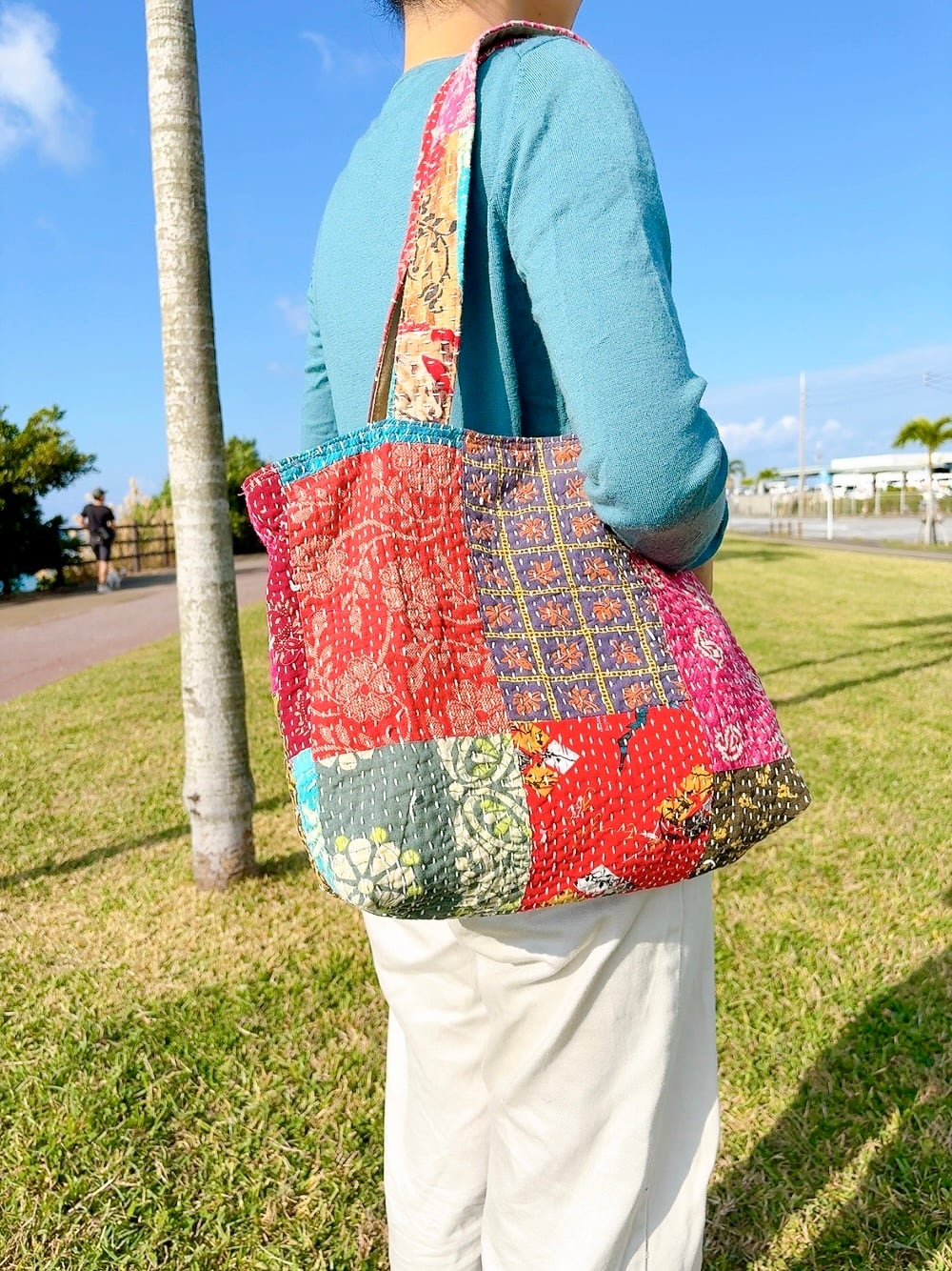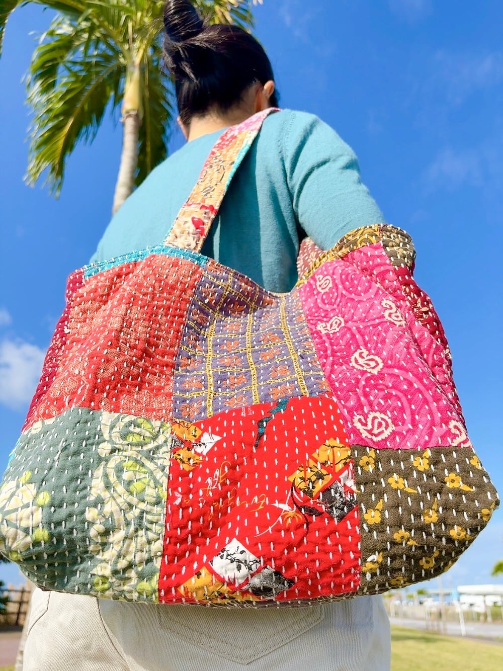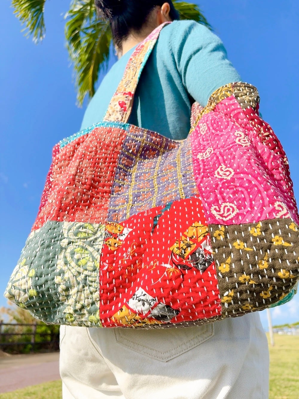 ポケットいっぱいトートバッグは、ヴィンテージラリーキルトを使用した魅力的なアイテムです。パッチワーク柄が施され、どこか懐かしさを感じさせながらも個性的なデザインが特徴です。