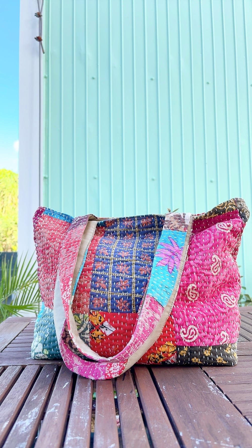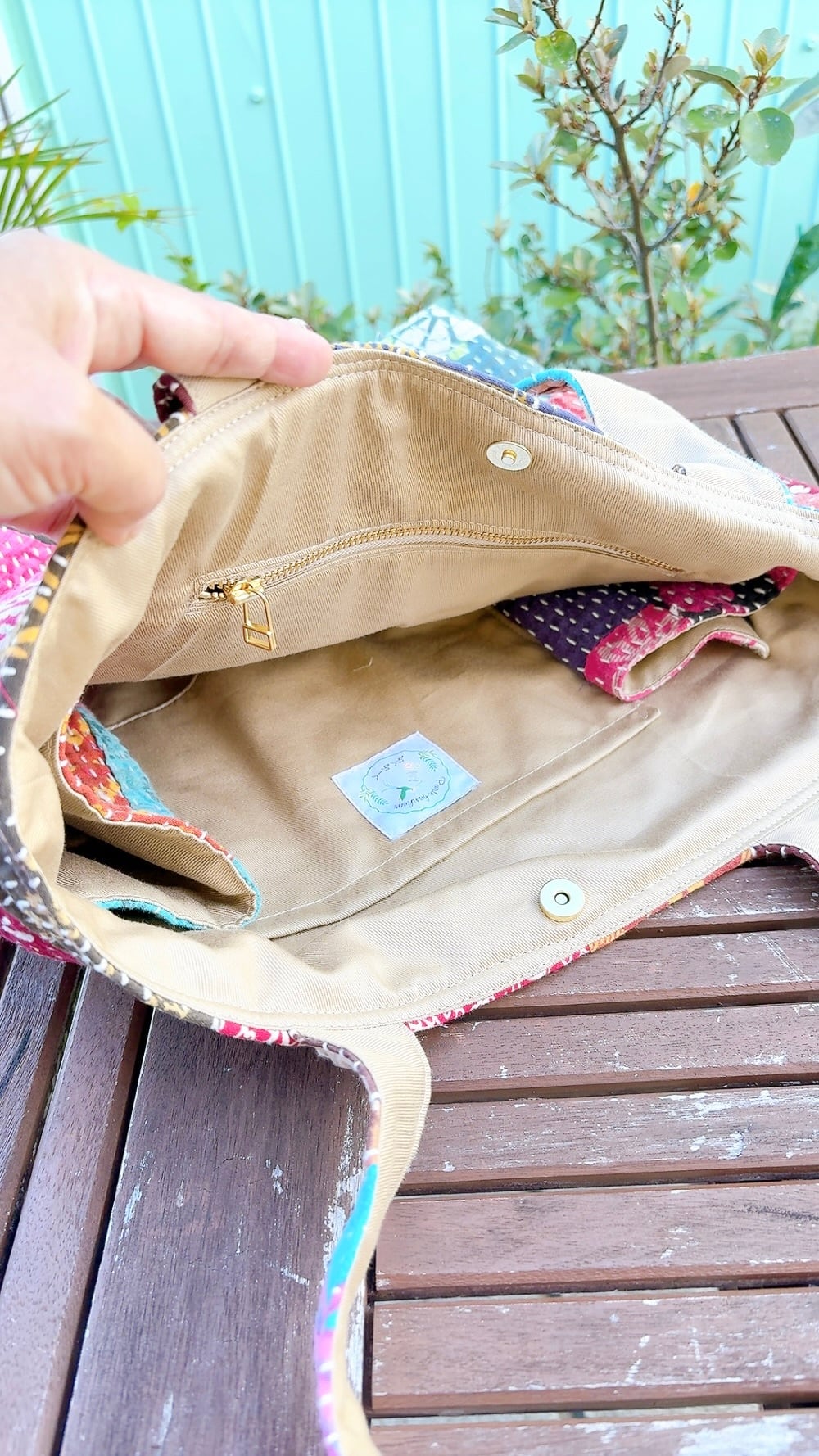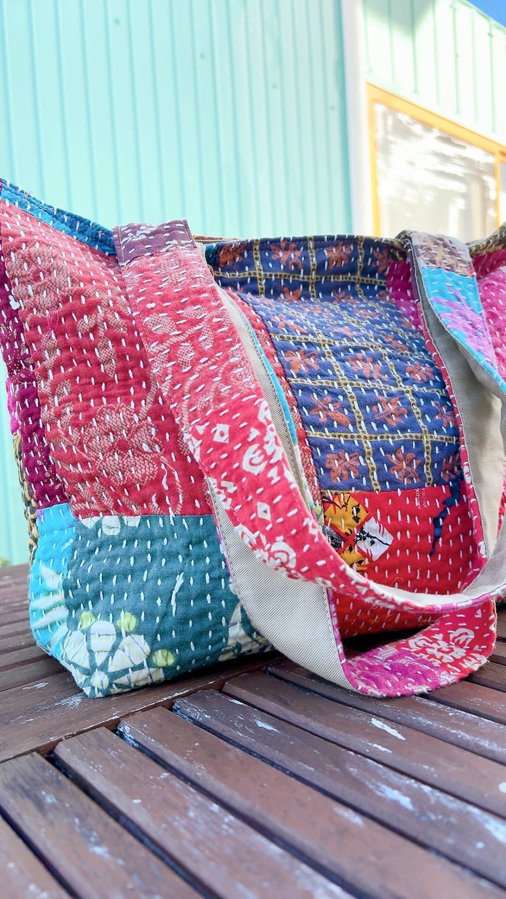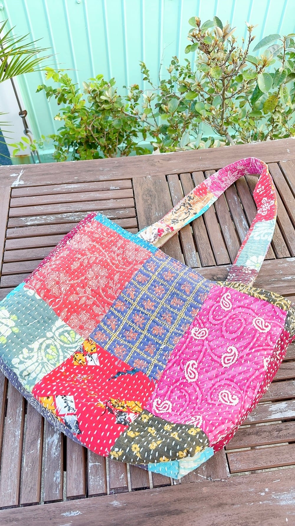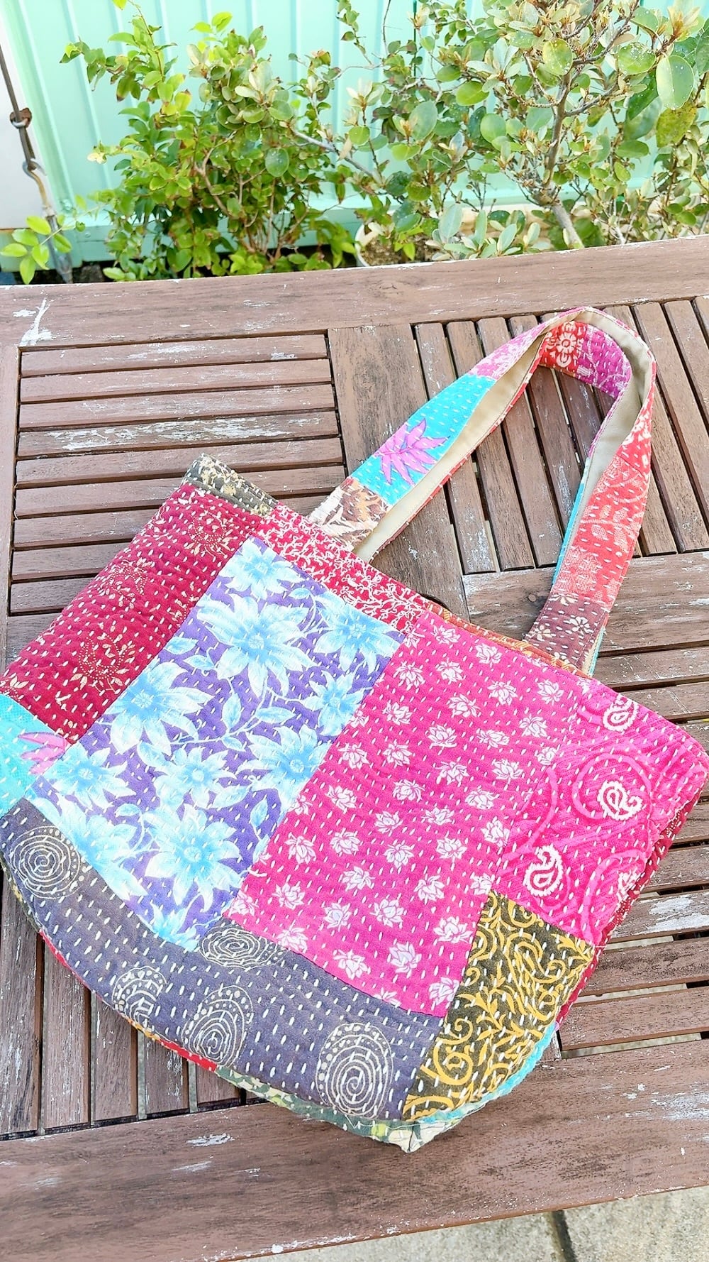 ポケットいっぱいトートバッグは、ヴィンテージラリーキルトを使用した魅力的なアイテムです。パッチワーク柄が施され、どこか懐かしさを感じさせながらも個性的なデザインが特徴です。