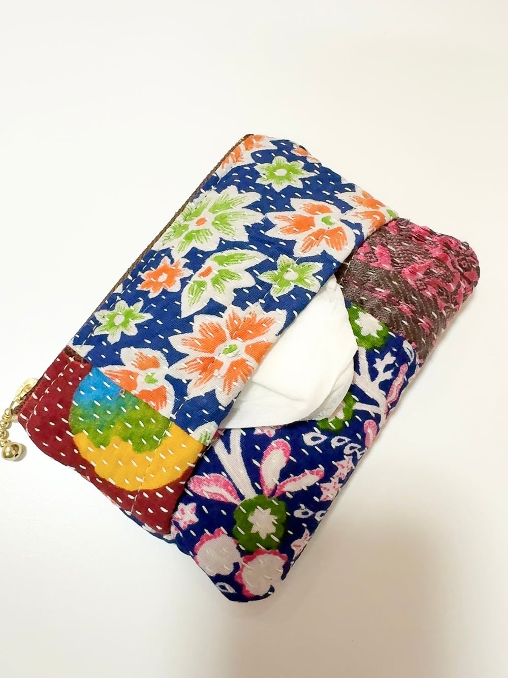手元にちょっとしたティッシュが常備できる、ラリーキルトポケットティッシュポーチです。キュートなデザインが魅力。小さなポーチですが、バッグの中で迷子にりそうなティッシュと一緒にコスメやお薬、小銭入れなどを入れコンパクトに収納。