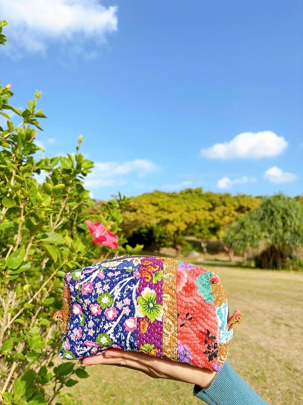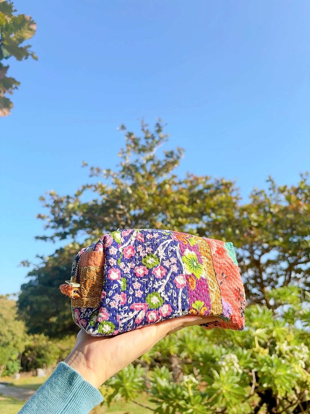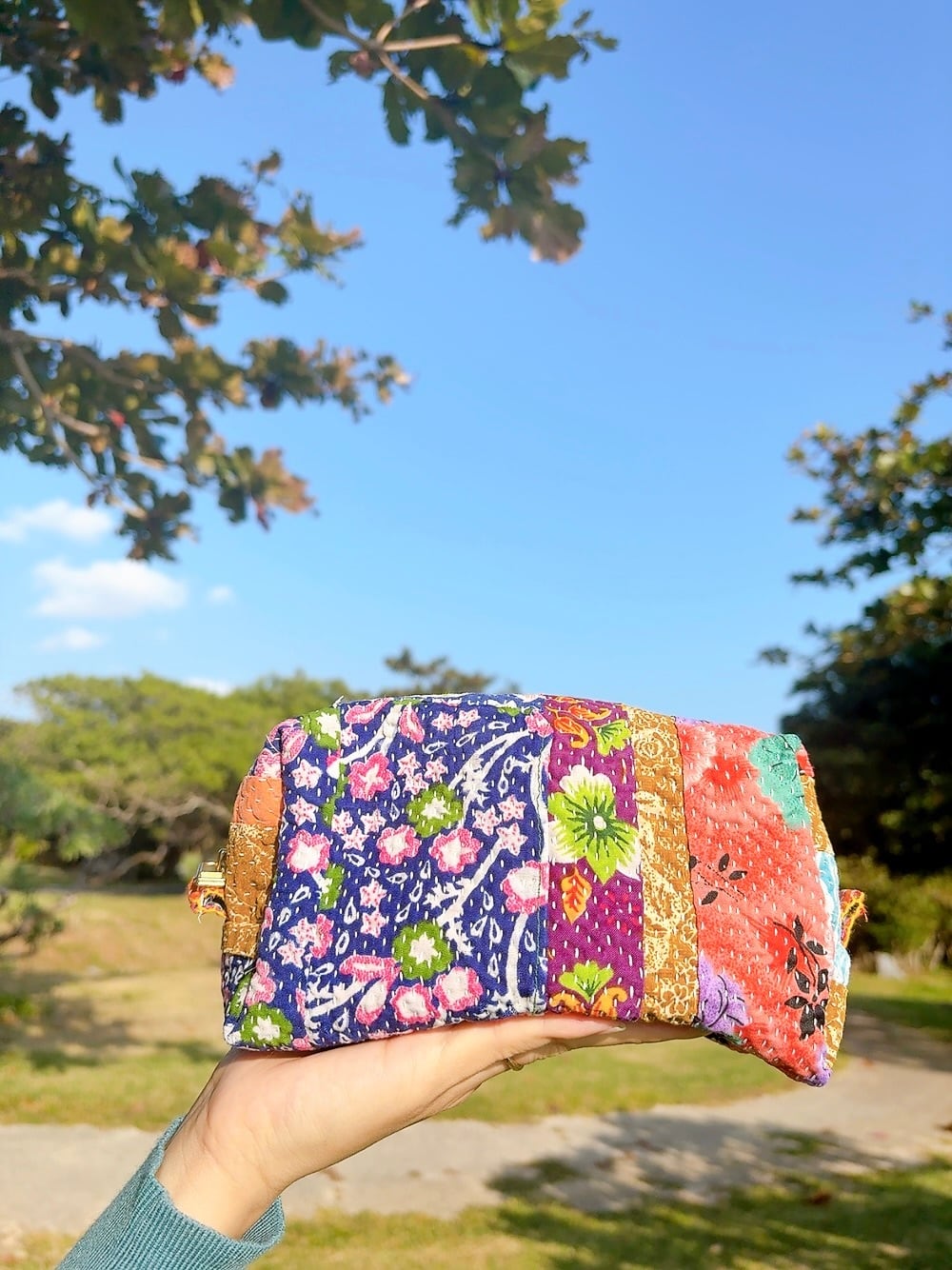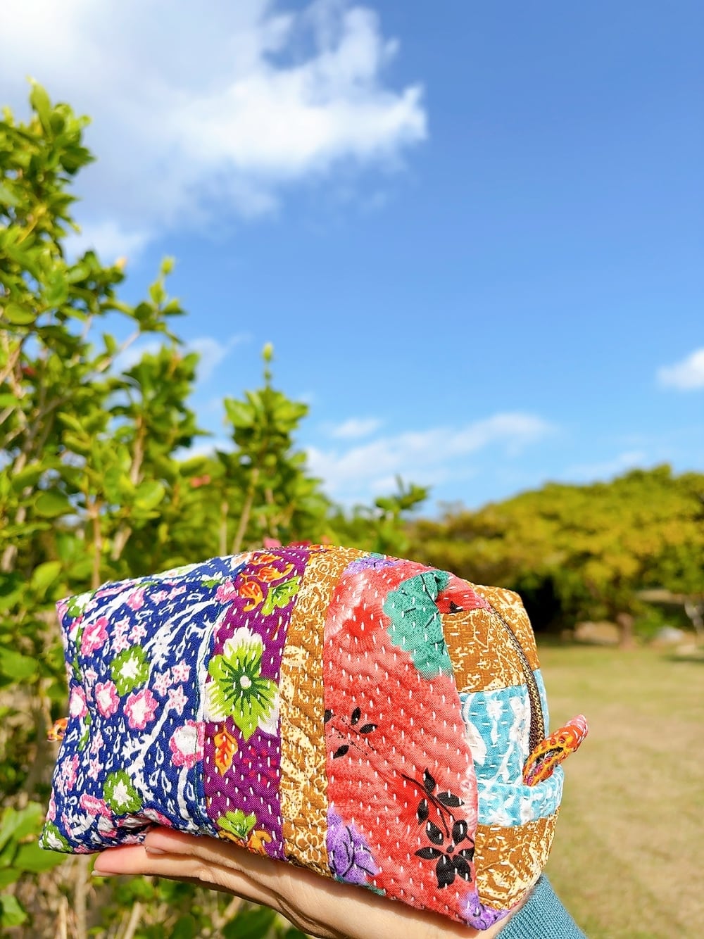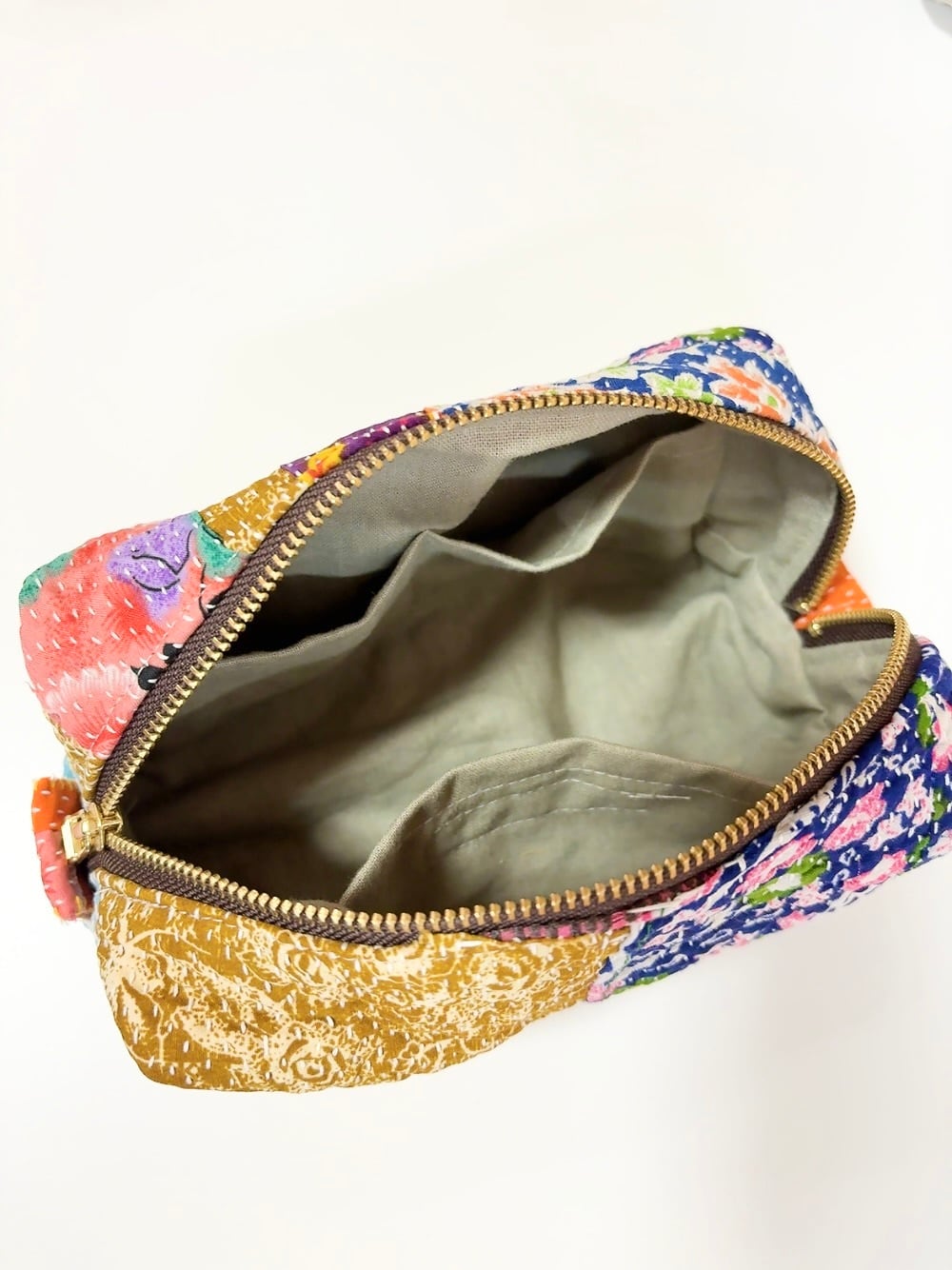 ボックスポーチは、ラリーキルトの魅力を存分に活かした、個性的なアイテムです。多彩なパッチワーク柄が施され、手作りの温かみを感じることができます。小物やコスメ、貴重品をスマートに収納できるので、外出時には欠かせない相棒となります。