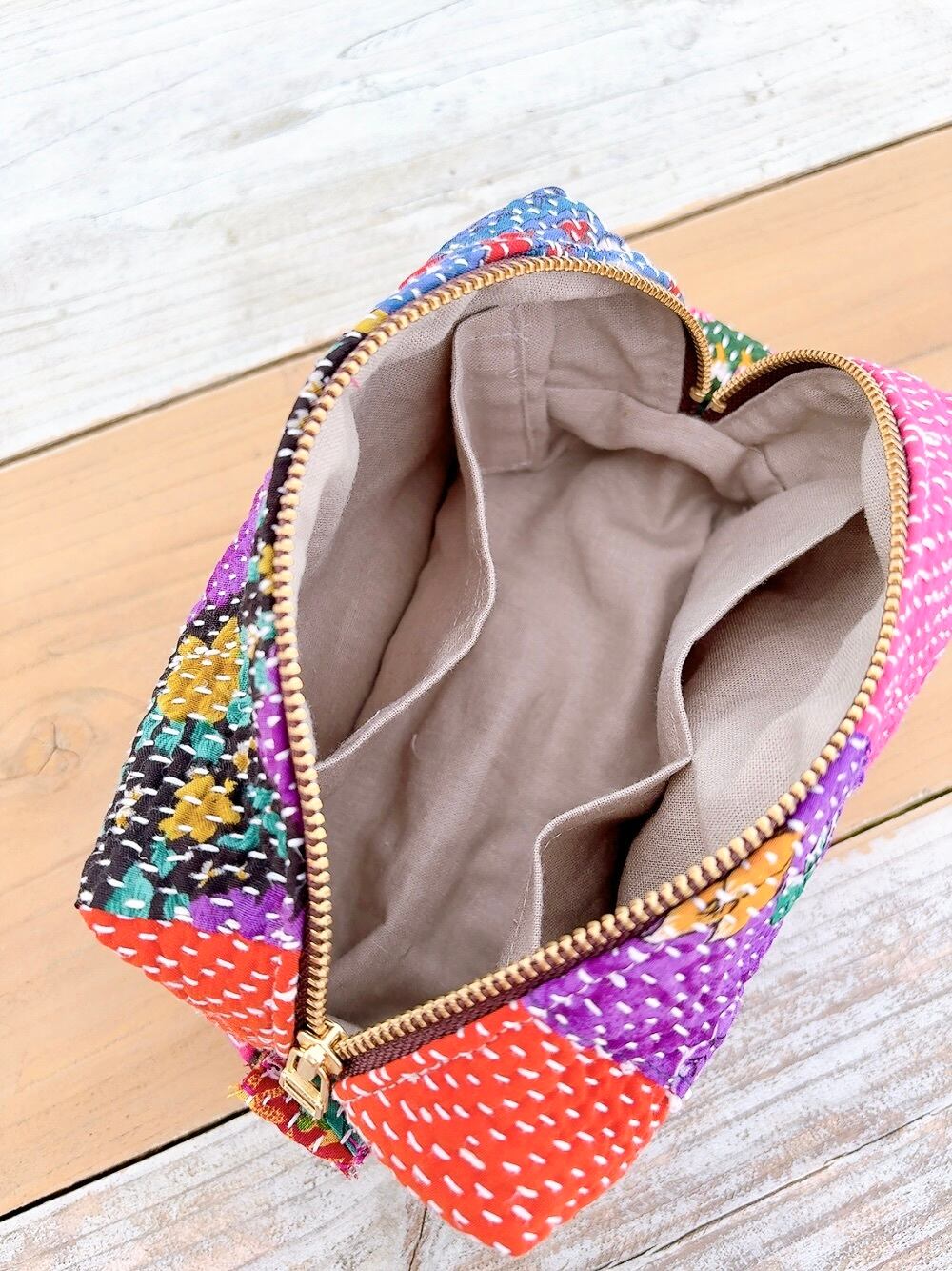 ボックスポーチは、ラリーキルトの魅力を存分に活かした、個性的なアイテムです。多彩なパッチワーク柄が施され、手作りの温かみを感じることができます。小物やコスメ、貴重品をスマートに収納できるので、外出時には欠かせない相棒となります。