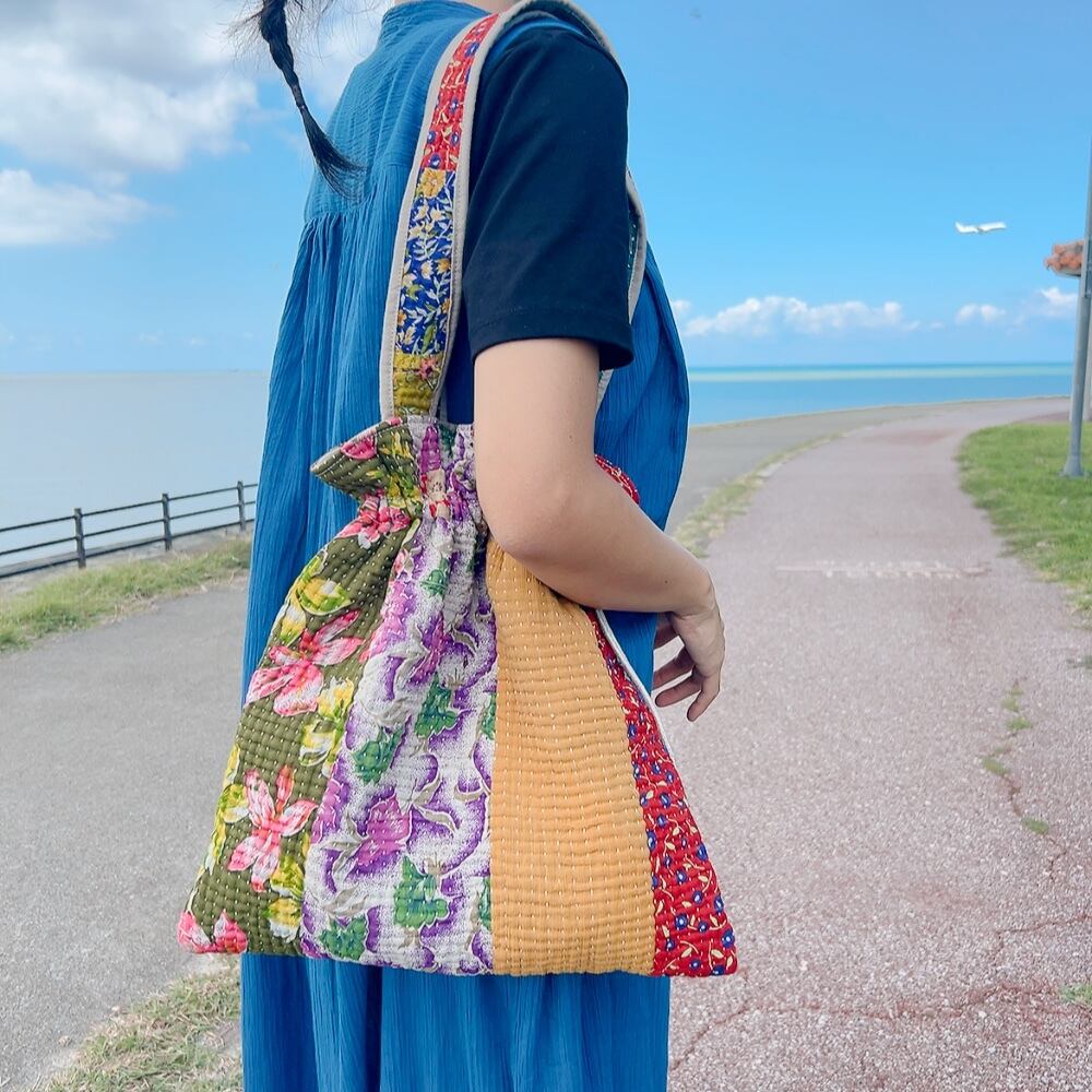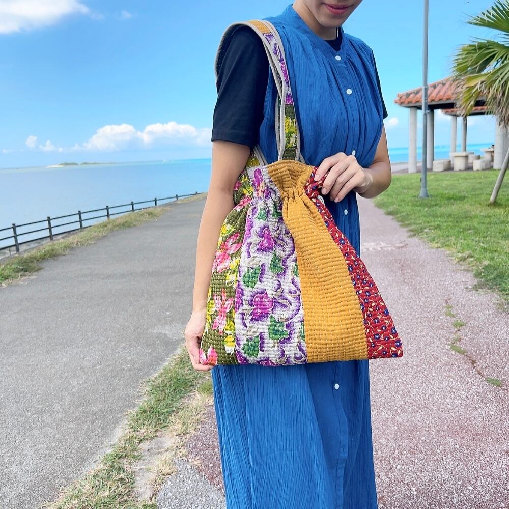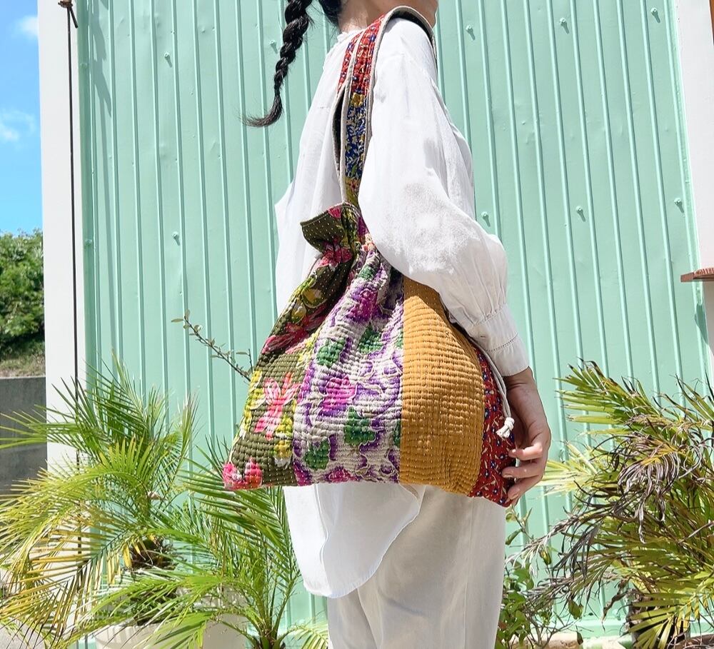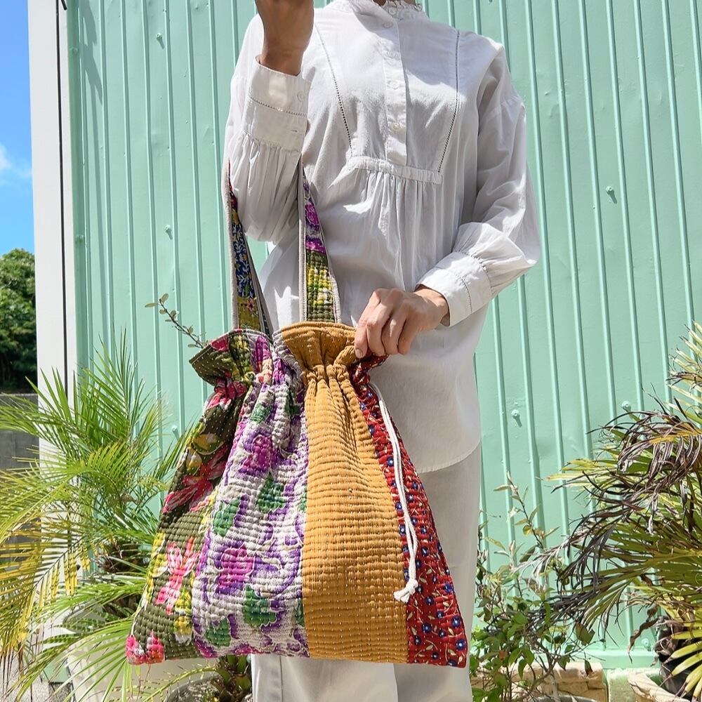 ヴィンテージ感漂うラリーキルトの大きめ巾着バッグです。ユニークな柄と色合いが目を引く一品。ちょっとしたお出かけやショッピングにも重宝するサイズ感です。巾着口の紐を引けば開閉も簡単で、中にはポケットも付いていますので、小物の収納にも便利です。