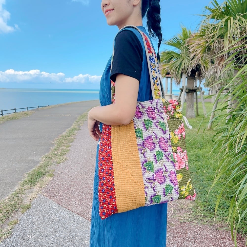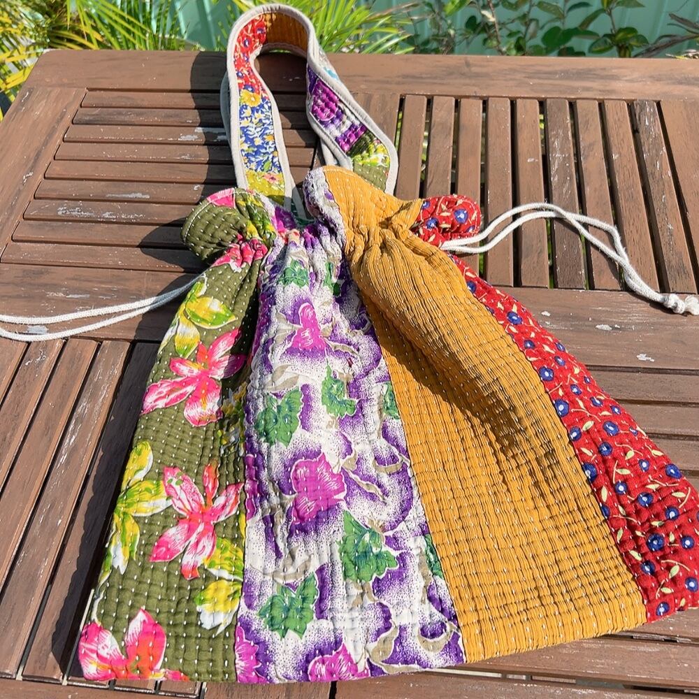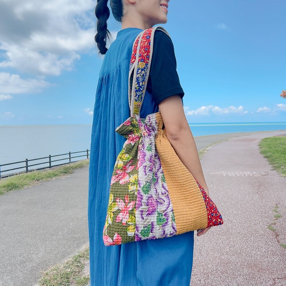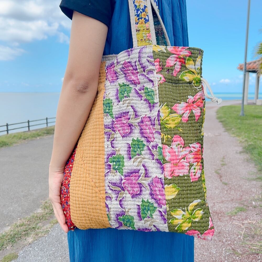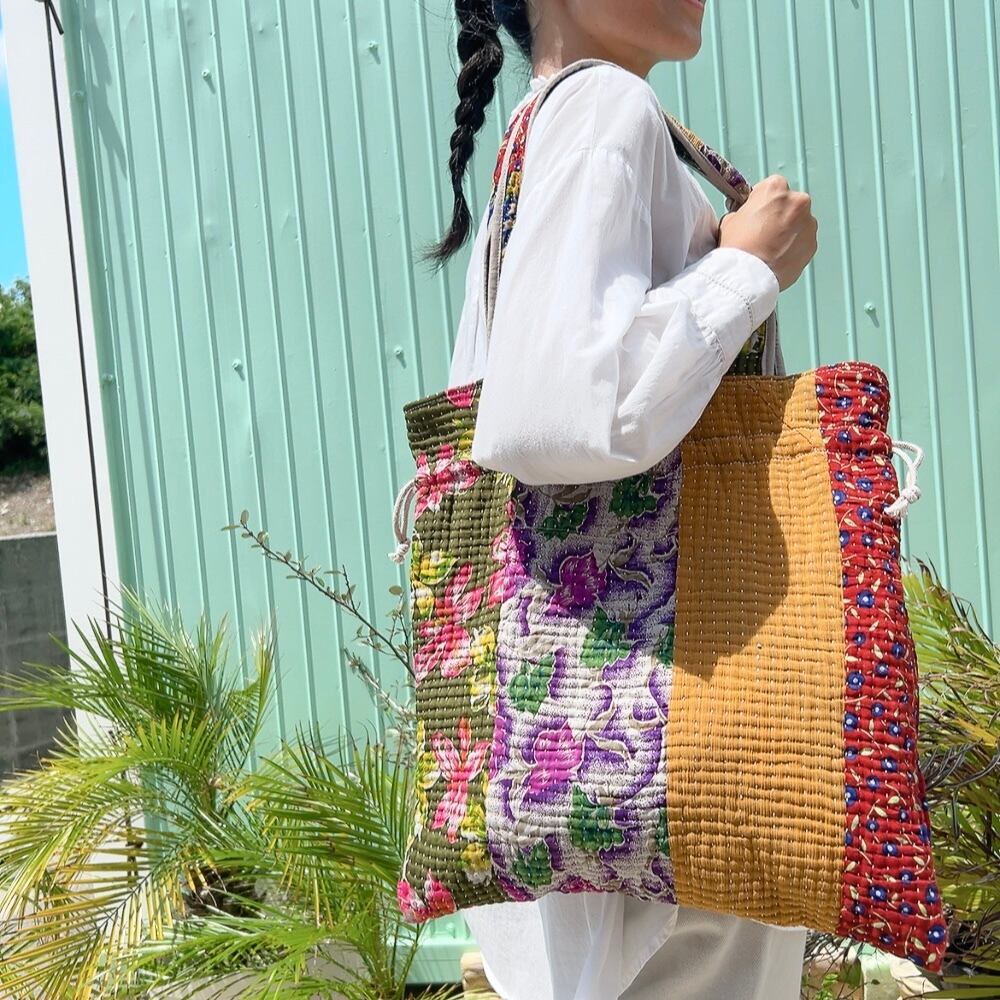 ヴィンテージ感漂うラリーキルトの大きめ巾着バッグです。ユニークな柄と色合いが目を引く一品。ちょっとしたお出かけやショッピングにも重宝するサイズ感です。巾着口の紐を引けば開閉も簡単で、中にはポケットも付いていますので、小物の収納にも便利です。
