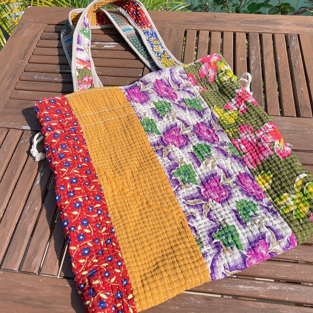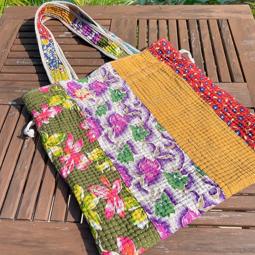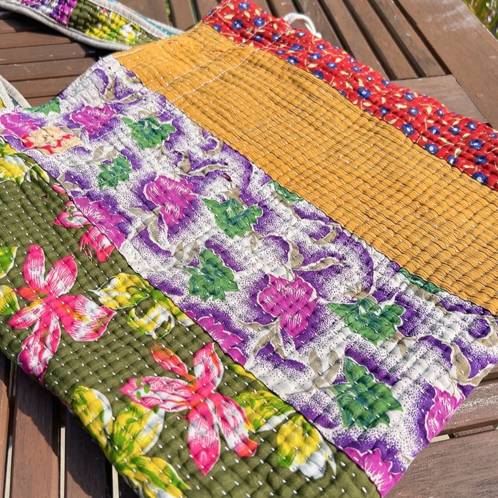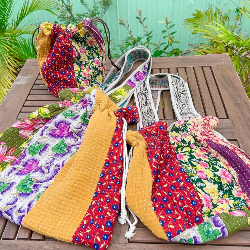 ヴィンテージ感漂うラリーキルトの大きめ巾着バッグです。ユニークな柄と色合いが目を引く一品。ちょっとしたお出かけやショッピングにも重宝するサイズ感です。巾着口の紐を引けば開閉も簡単で、中にはポケットも付いていますので、小物の収納にも便利です。