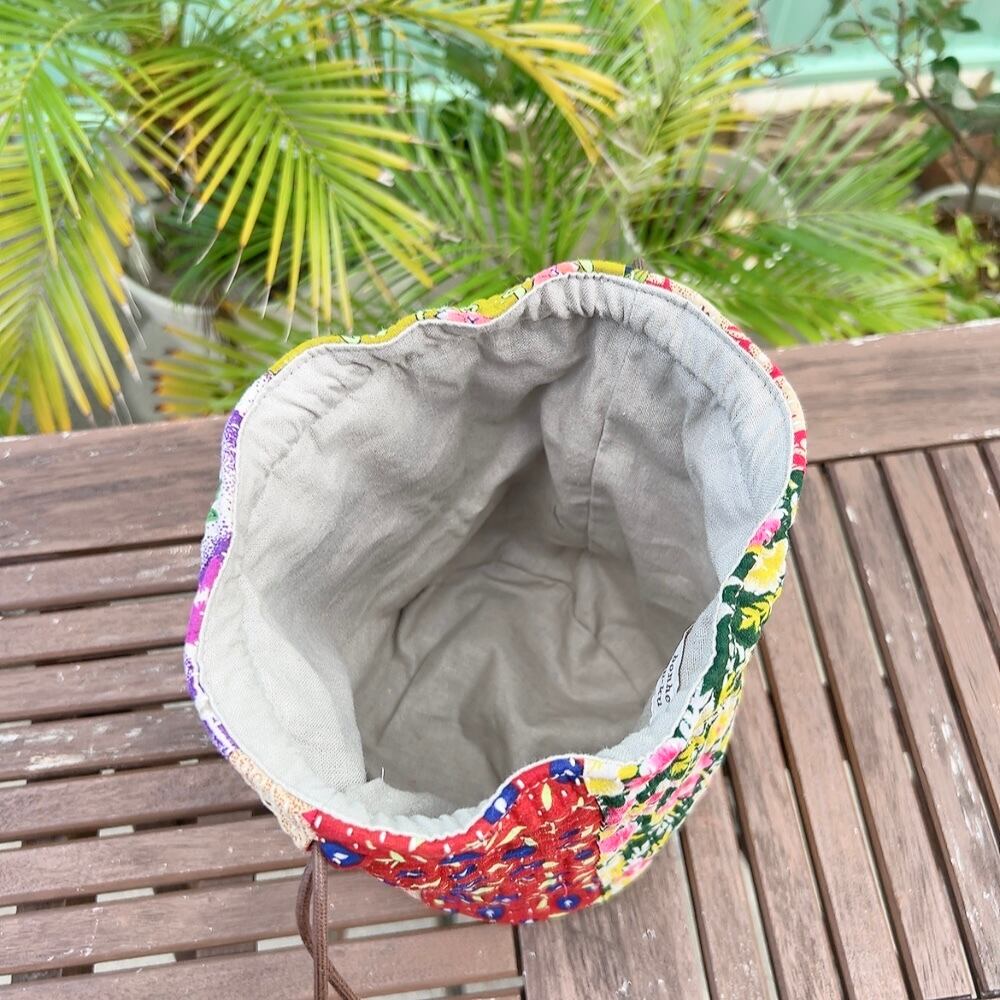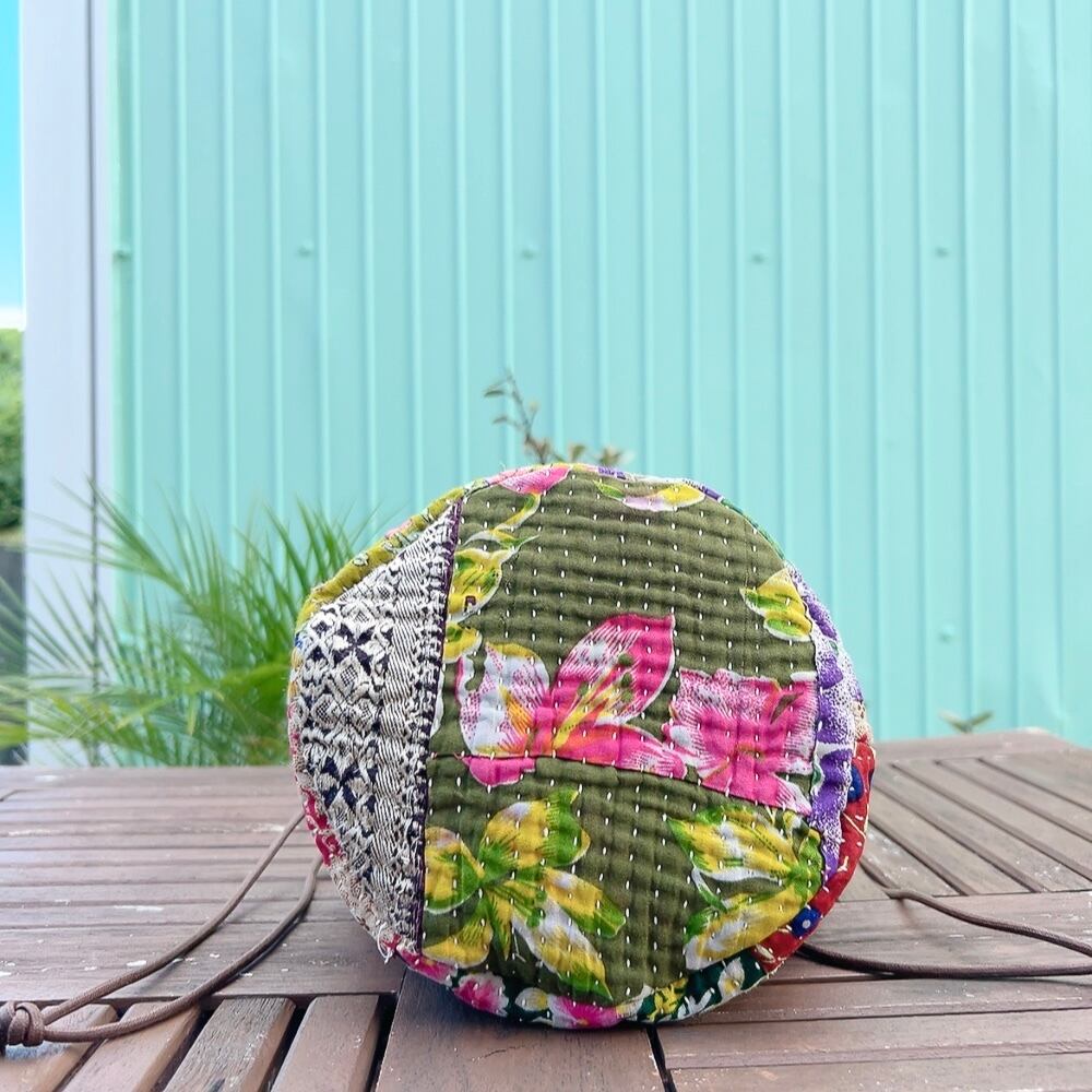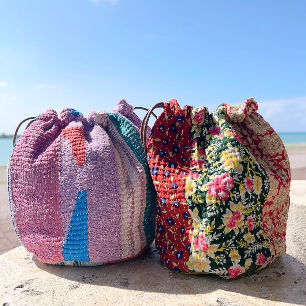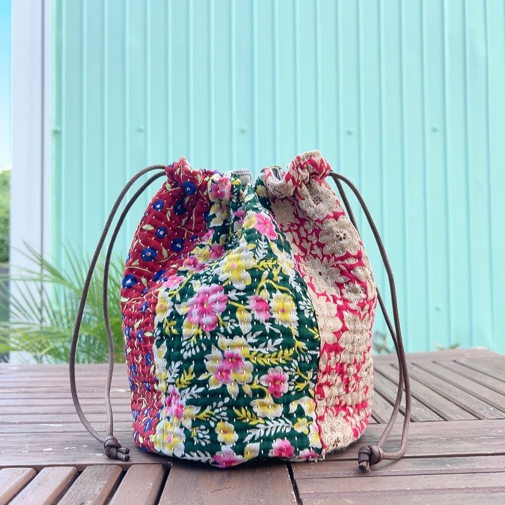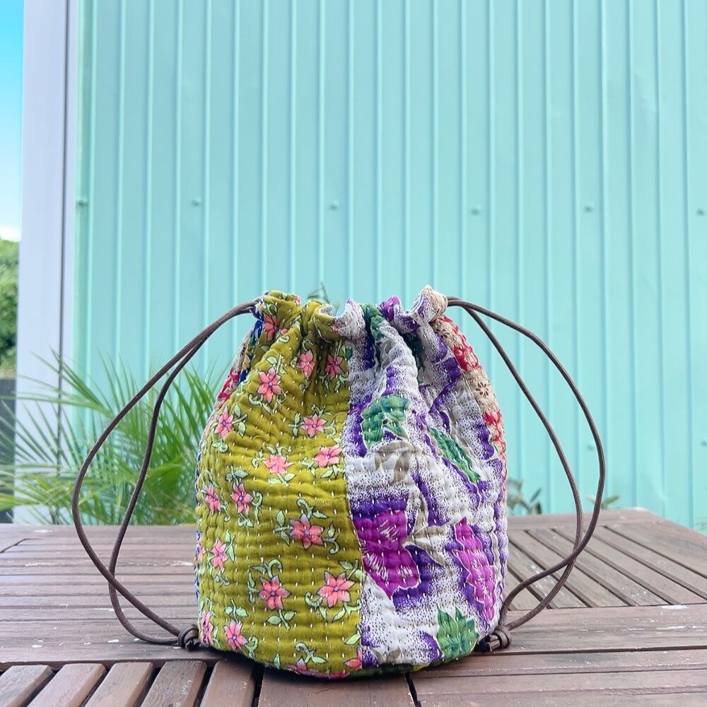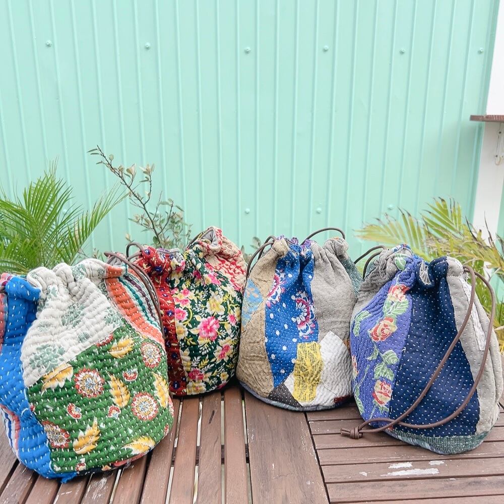 ヴィンテージラリーキルトの風合いを活かした、こだわりの巾着バッグです。