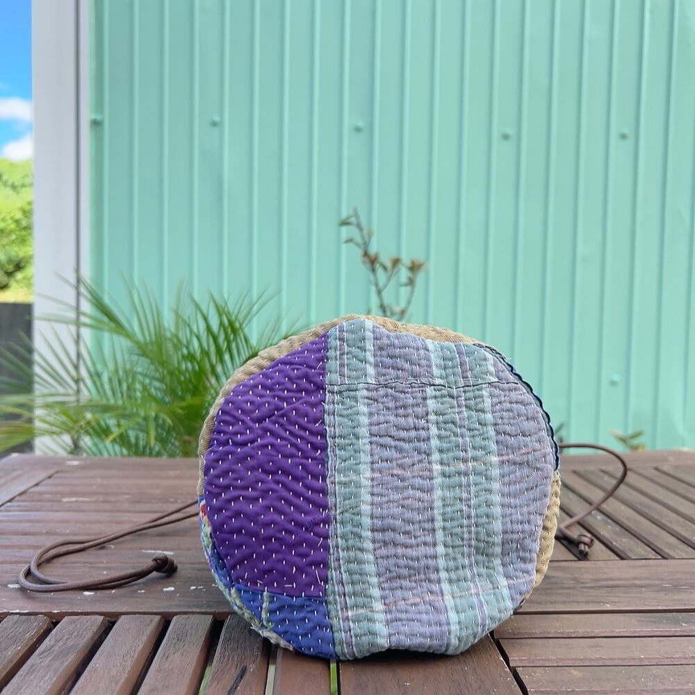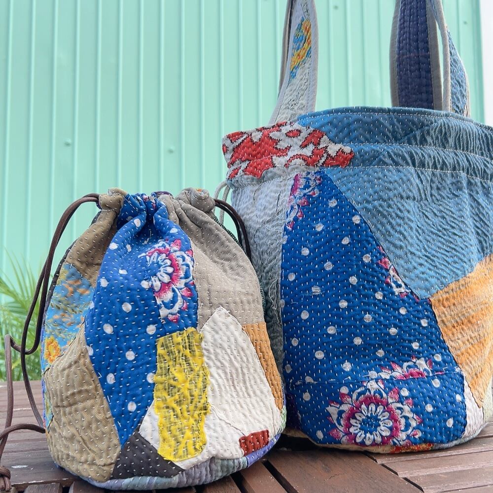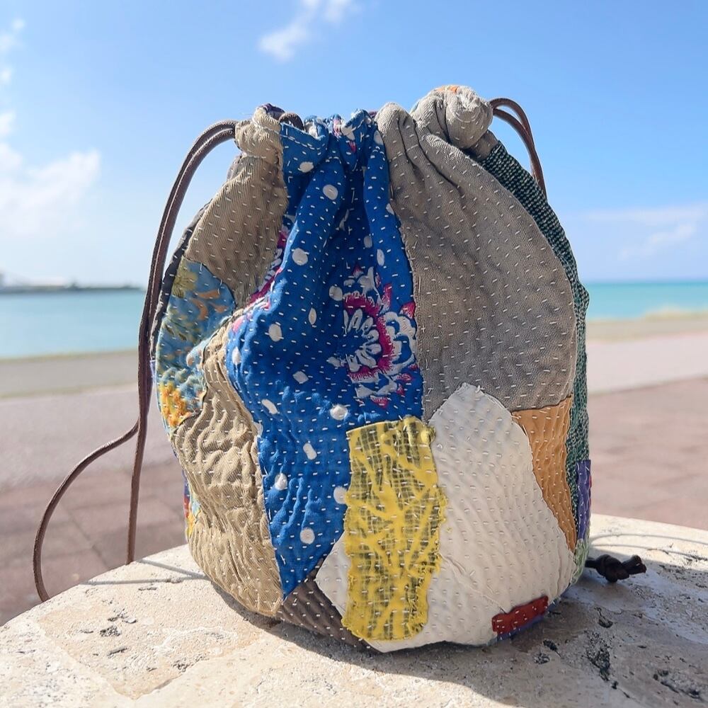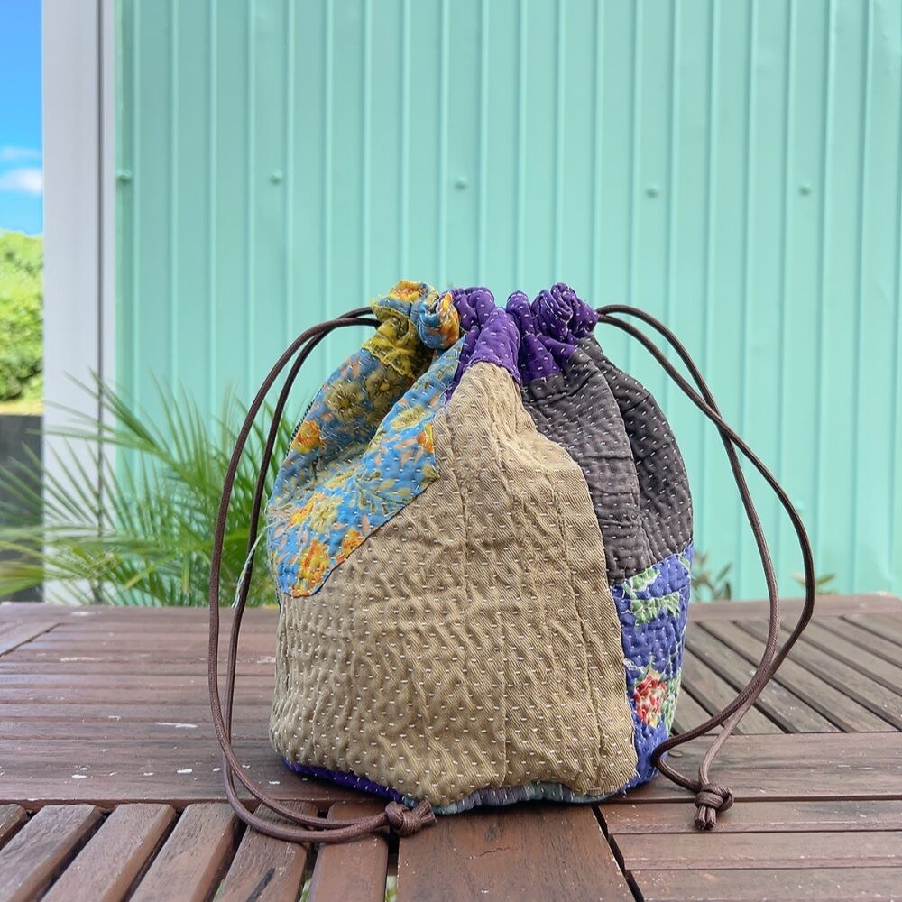 ヴィンテージラリーキルトの風合いを活かした、こだわりの巾着バッグです。