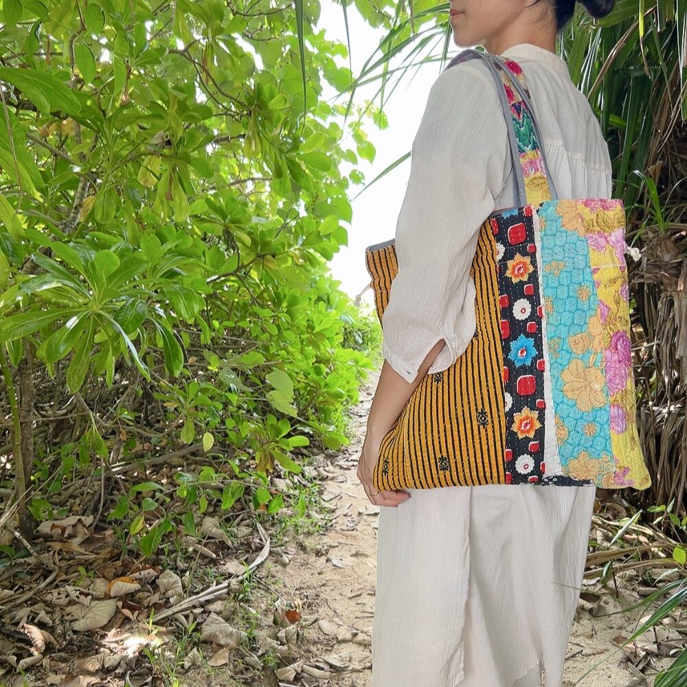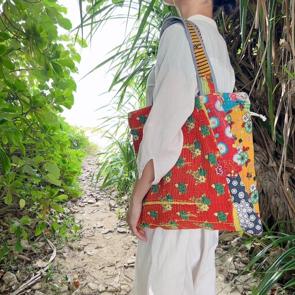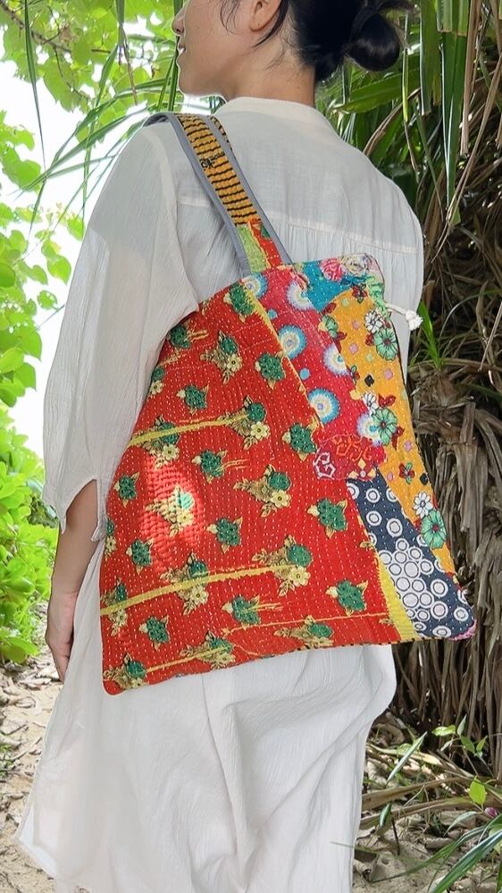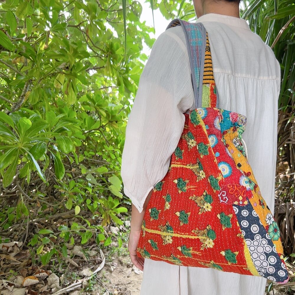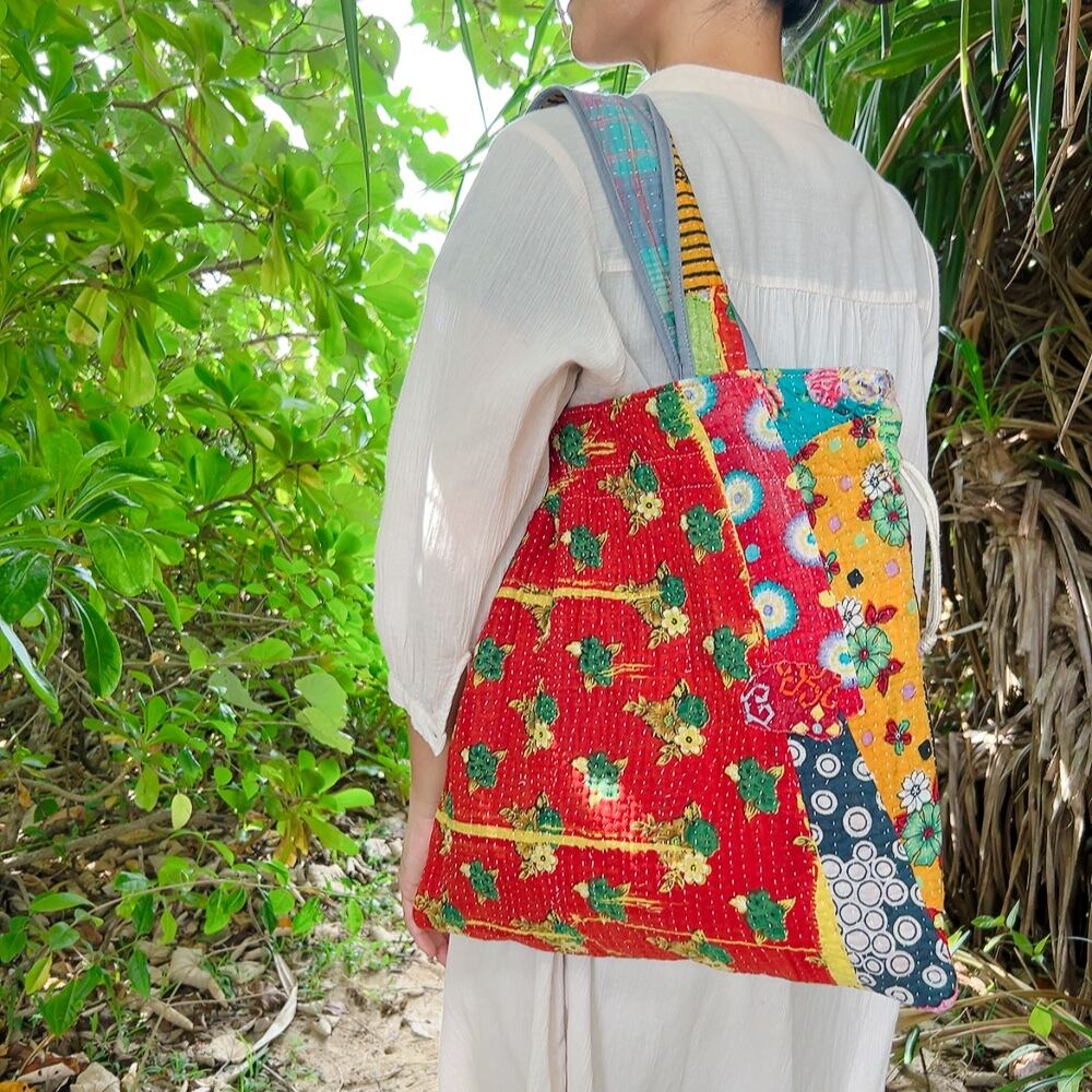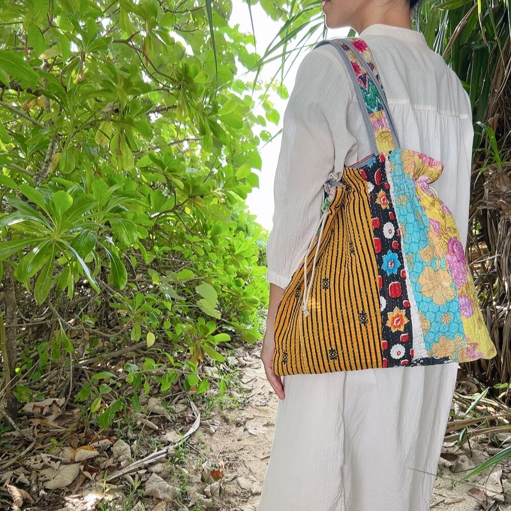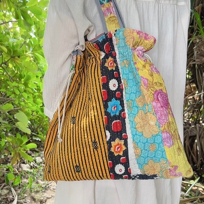 ヴィンテージ感漂うラリーキルトの大きめ巾着バッグです。ユニークな柄と色合いが目を引く一品。ちょっとしたお出かけやショッピングにも重宝するサイズ感です。巾着口の紐を引けば開閉も簡単で、中にはポケットも付いていますので、小物の収納にも便利です。