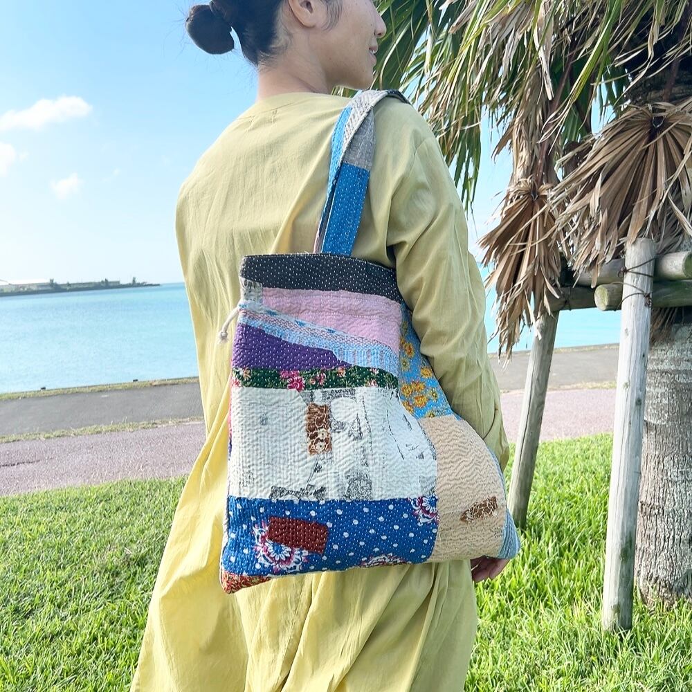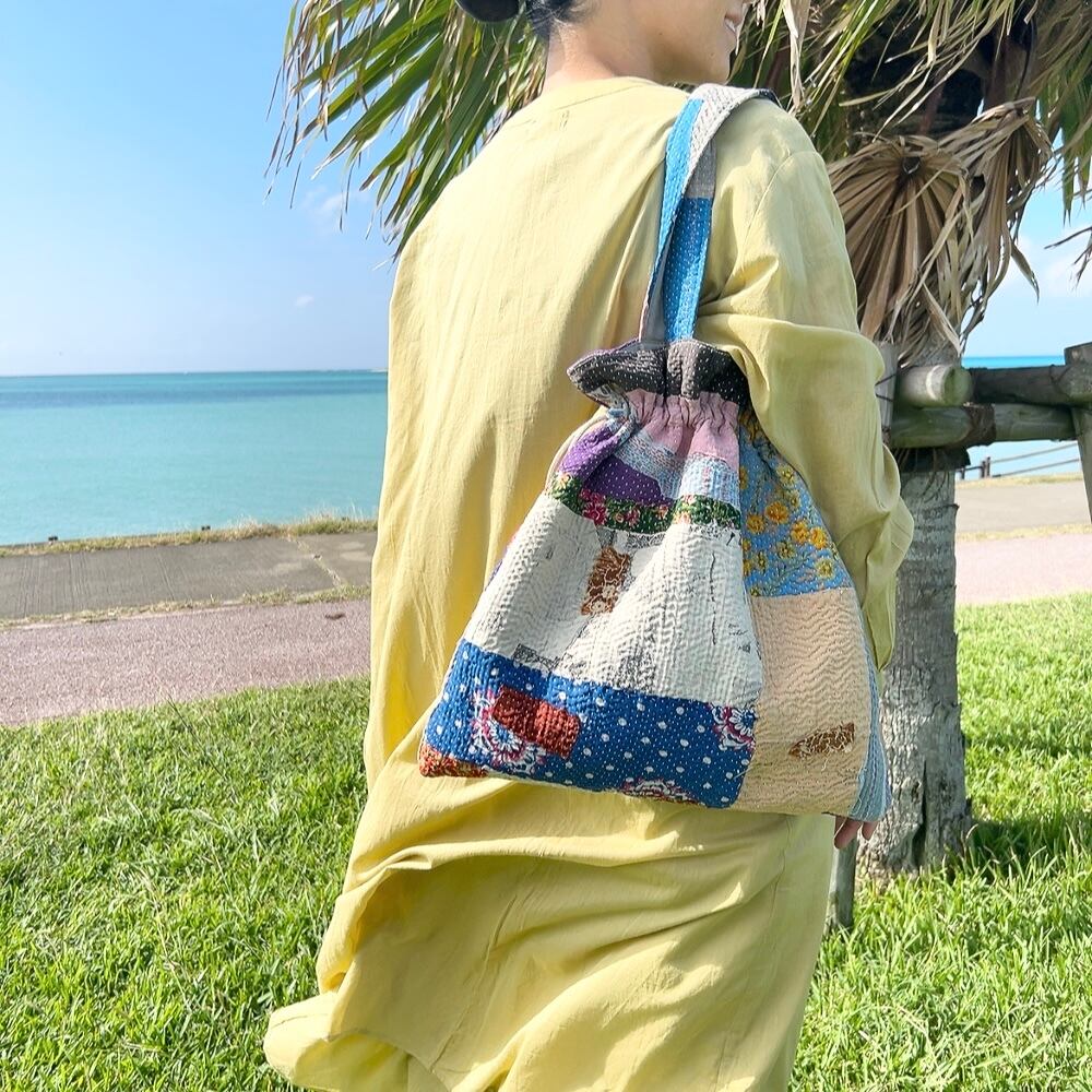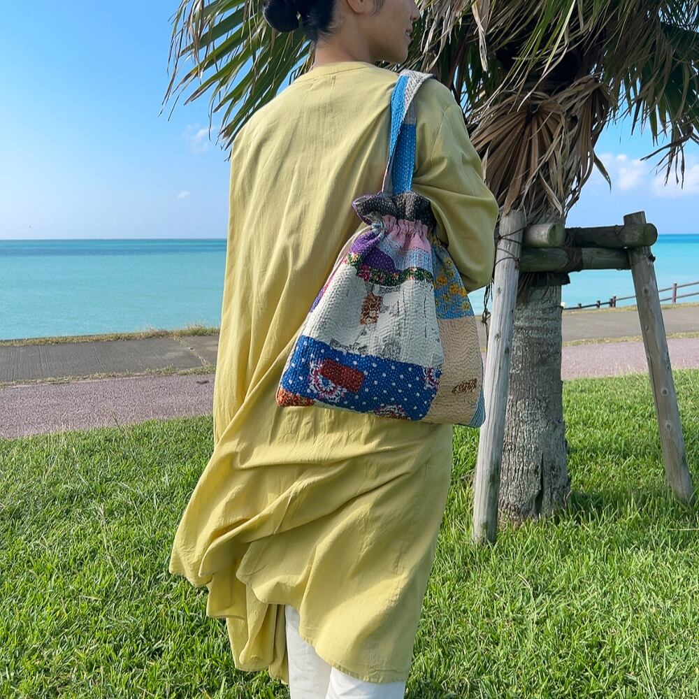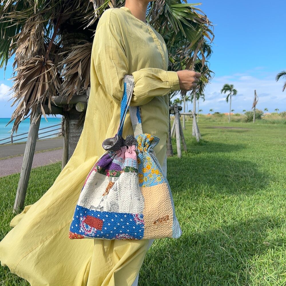 ヴィンテージ感漂うラリーキルトの大きめ巾着バッグです。ユニークな柄と色合いが目を引く一品。ちょっとしたお出かけやショッピングにも重宝するサイズ感です。巾着口の紐を引けば開閉も簡単で、中にはポケットも付いていますので、小物の収納にも便利です。