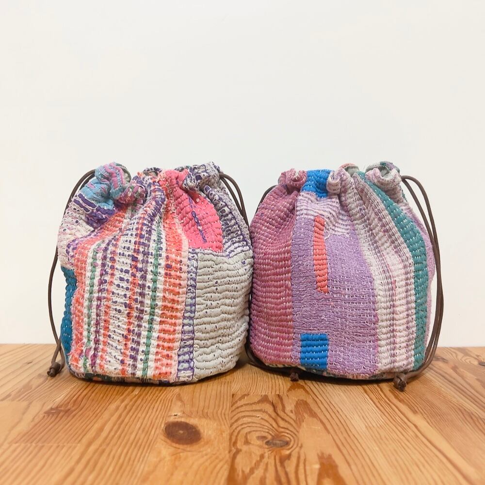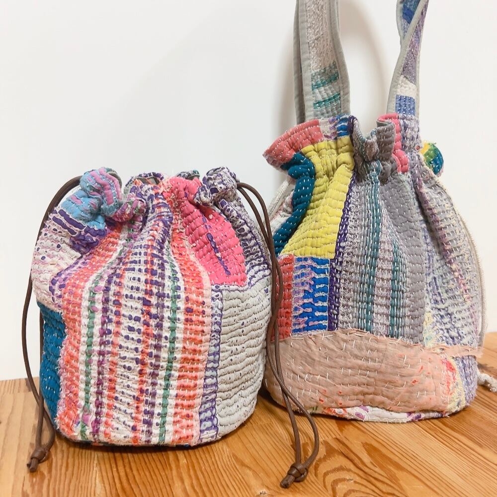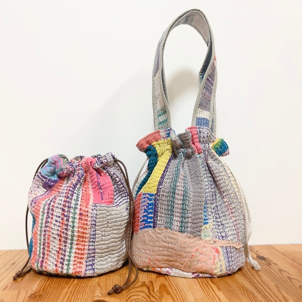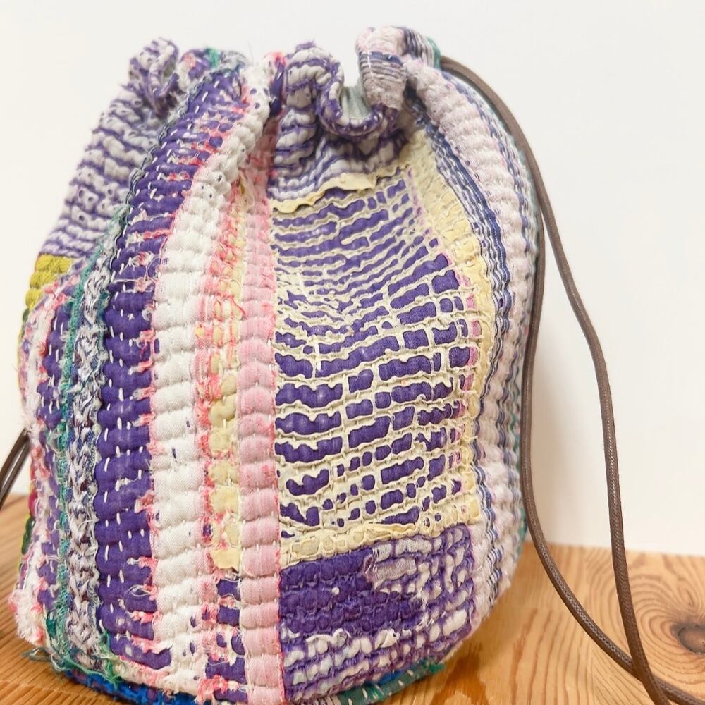 ヴィンテージラリーキルトの風合いを活かした、こだわりの巾着バッグです。