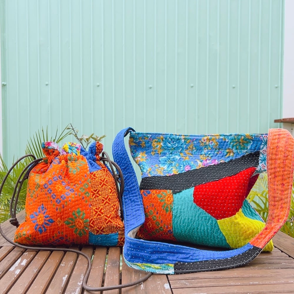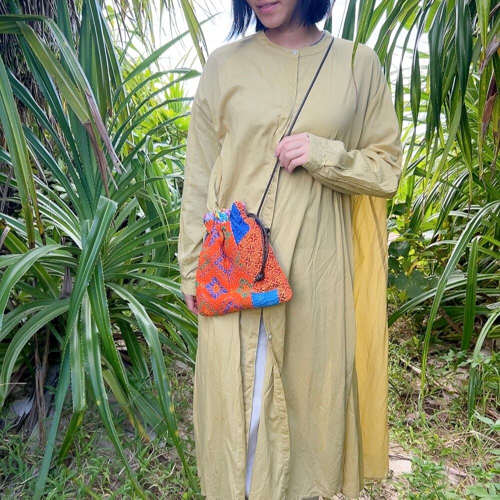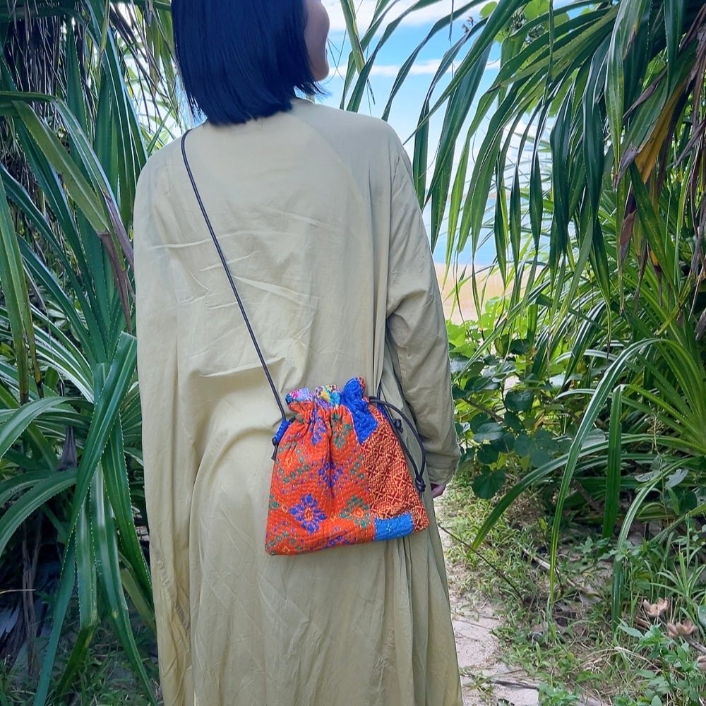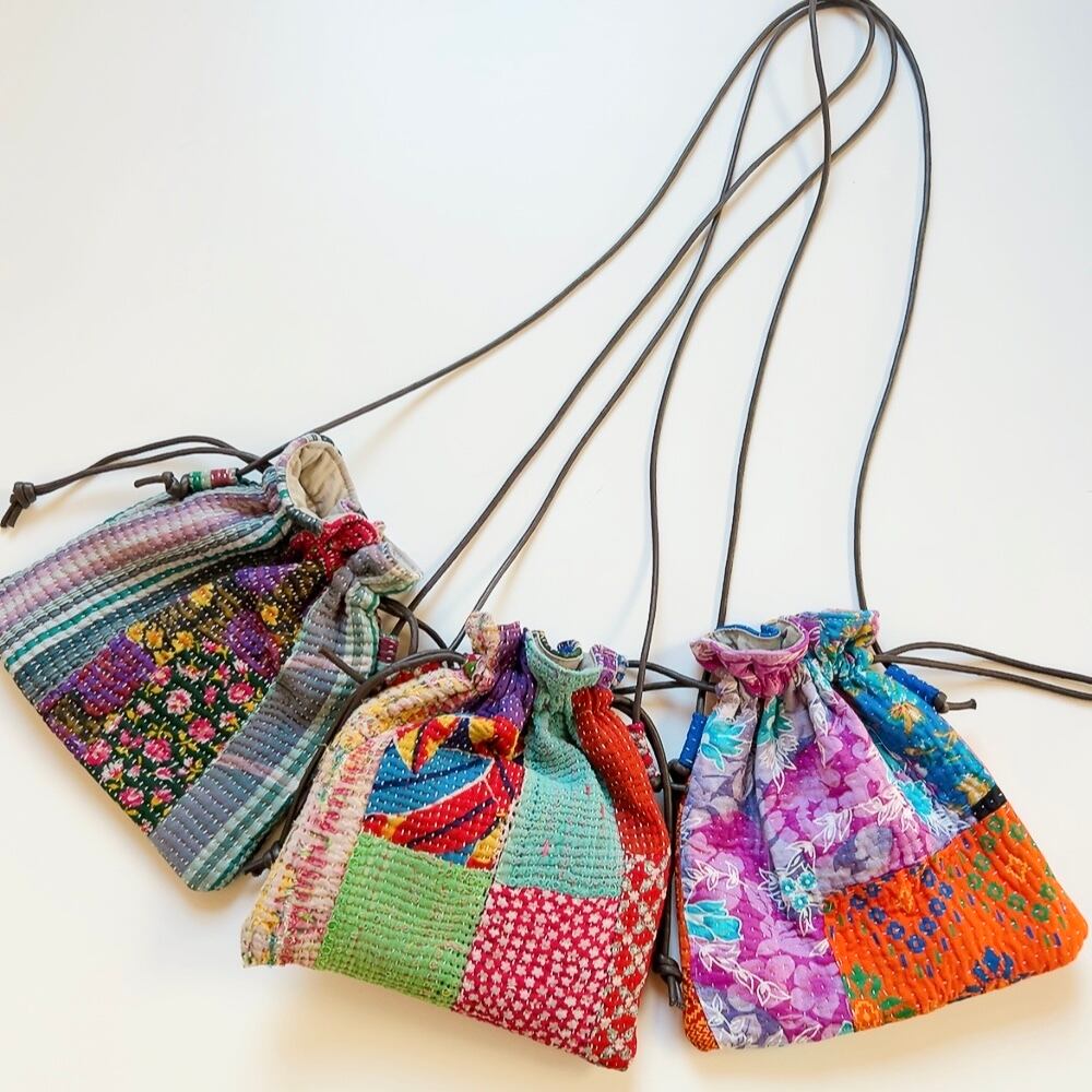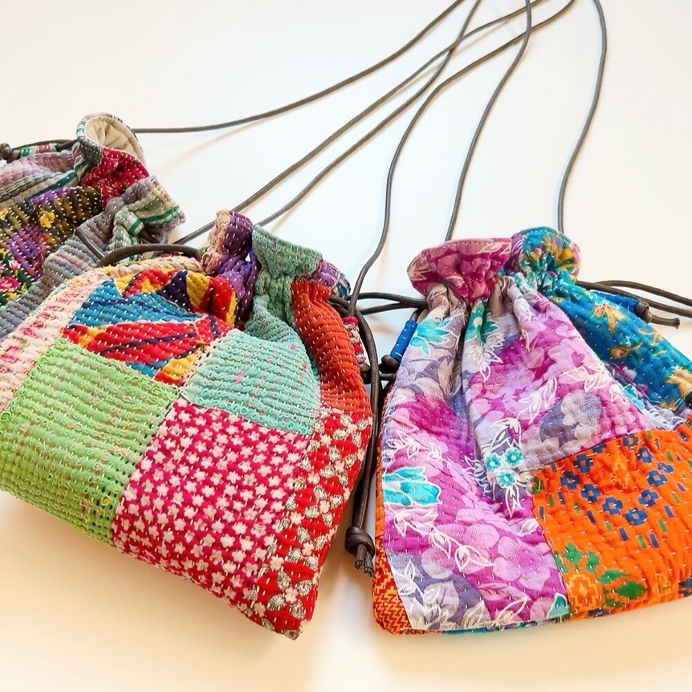 ヴィンテージラリーキルトから作られた、巾着ショルダーバッグです。
