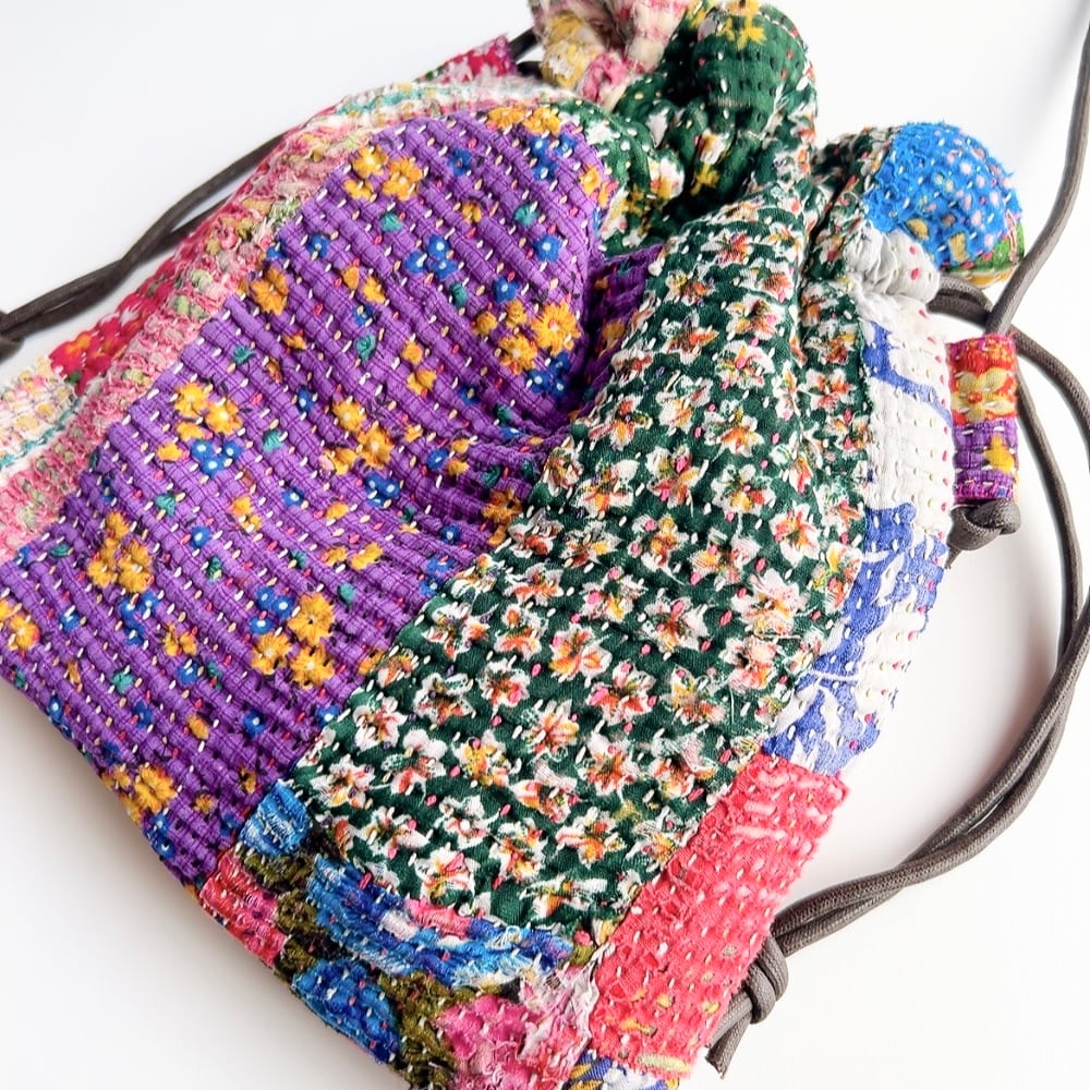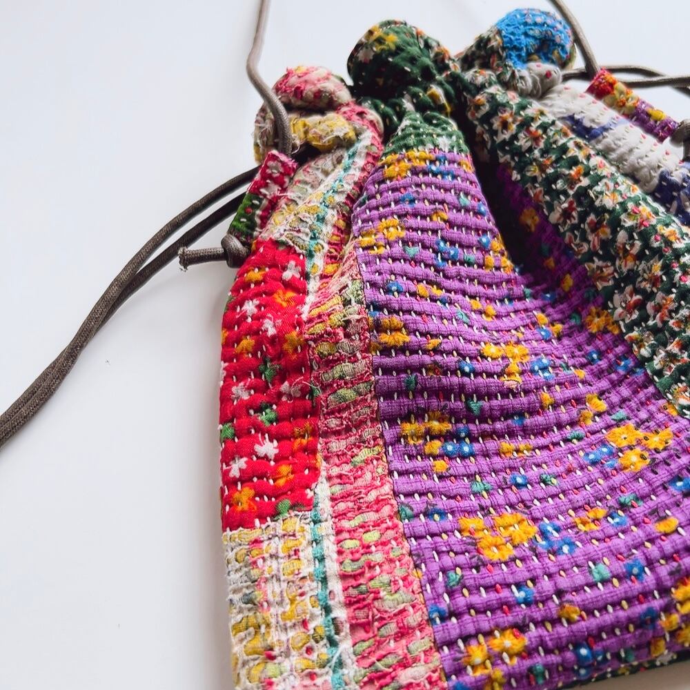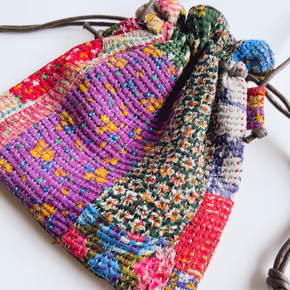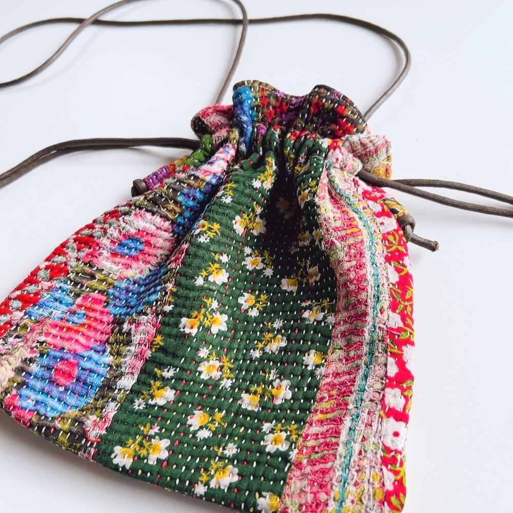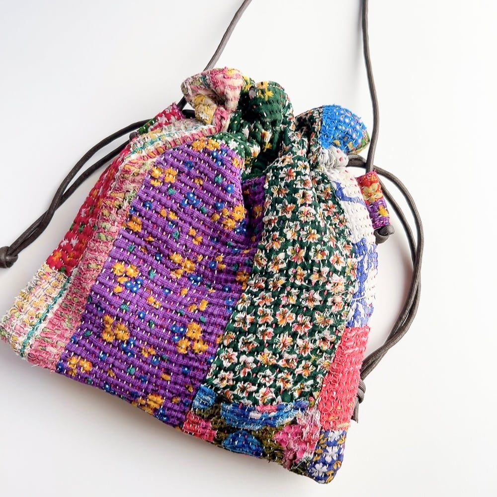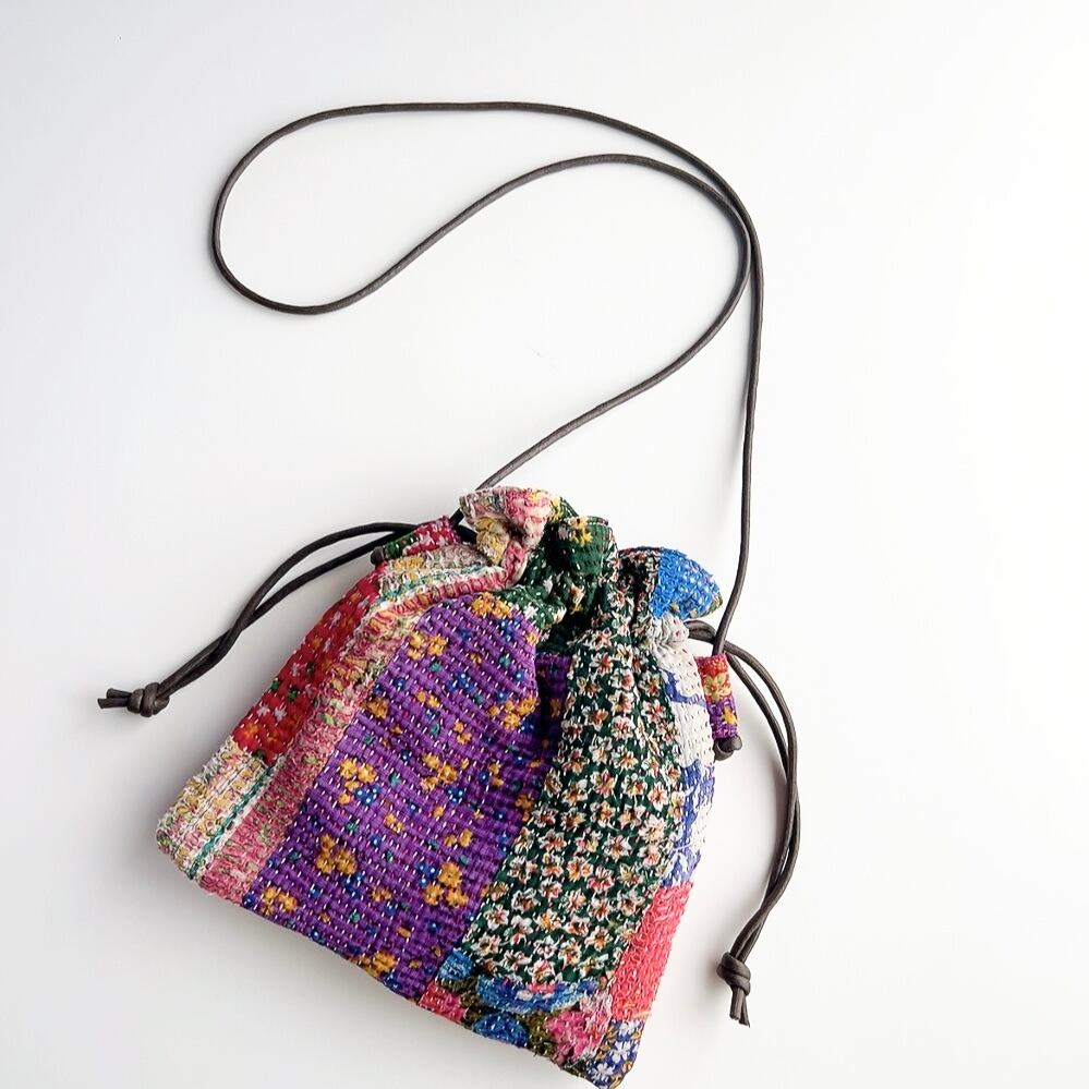 ヴィンテージラリーキルトから作られた、巾着ショルダーバッグです。