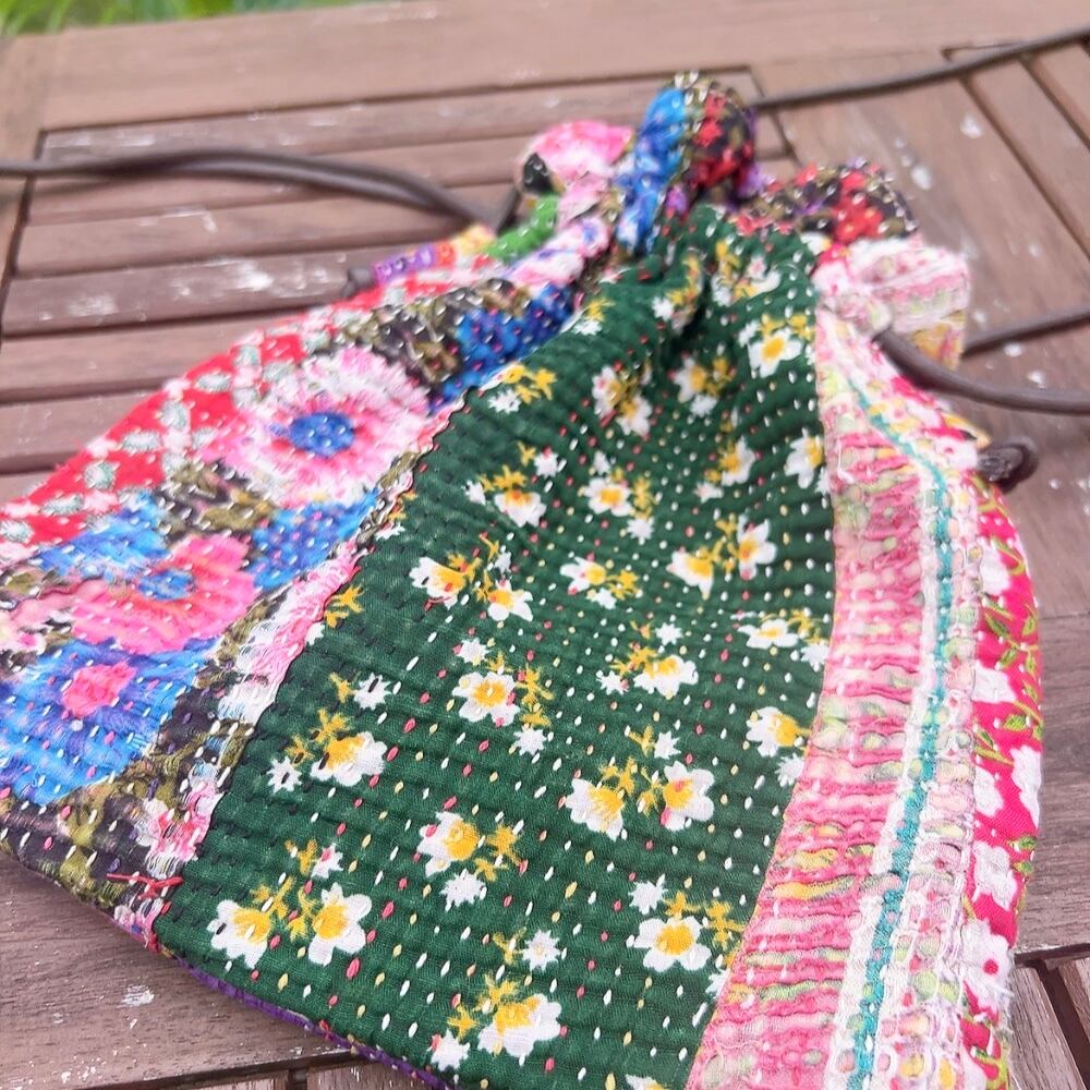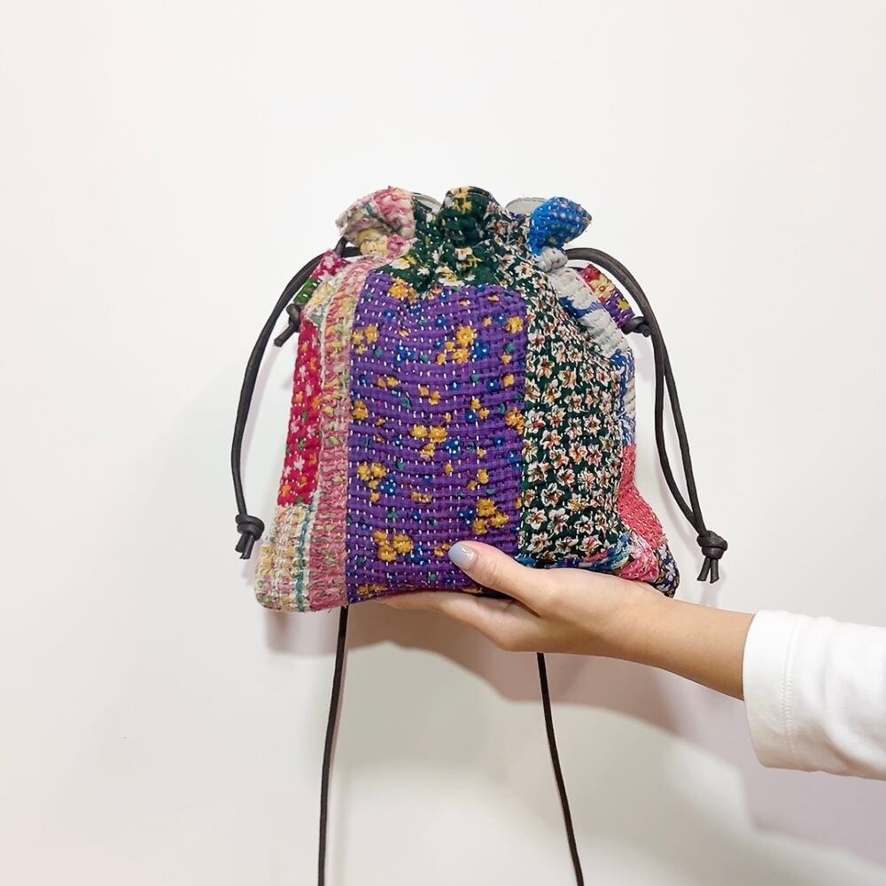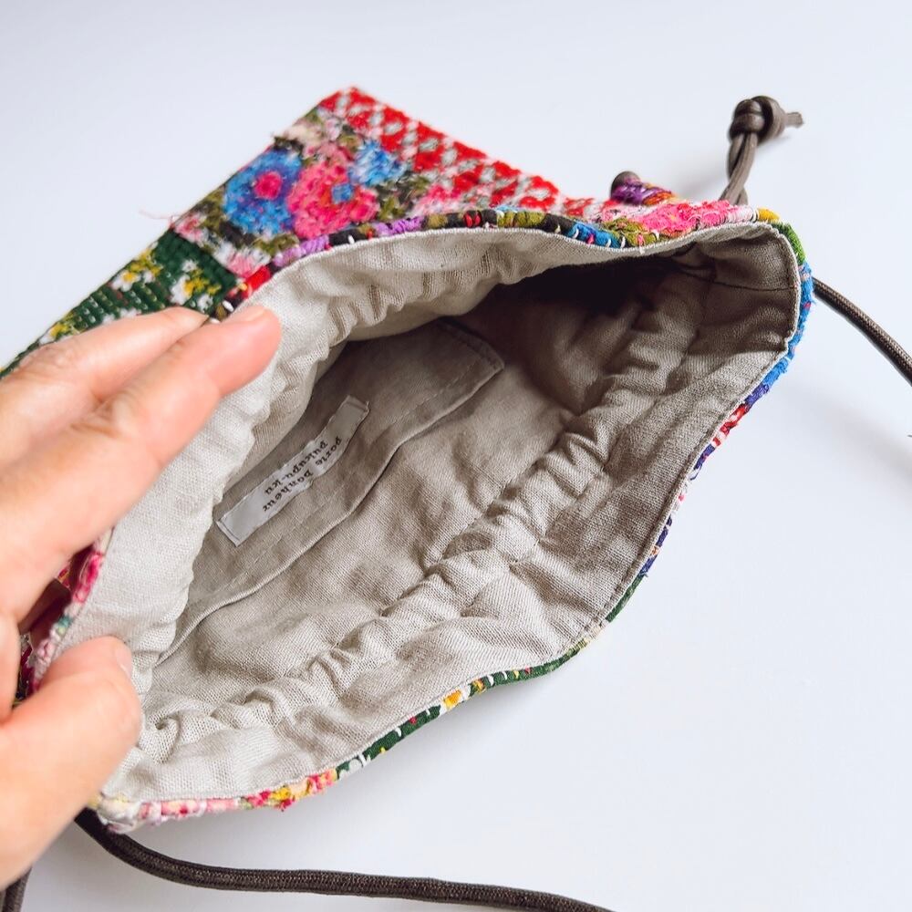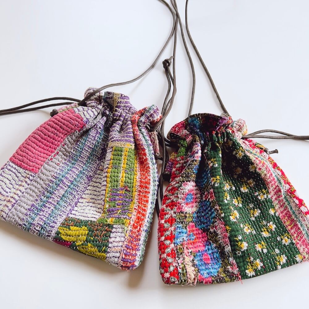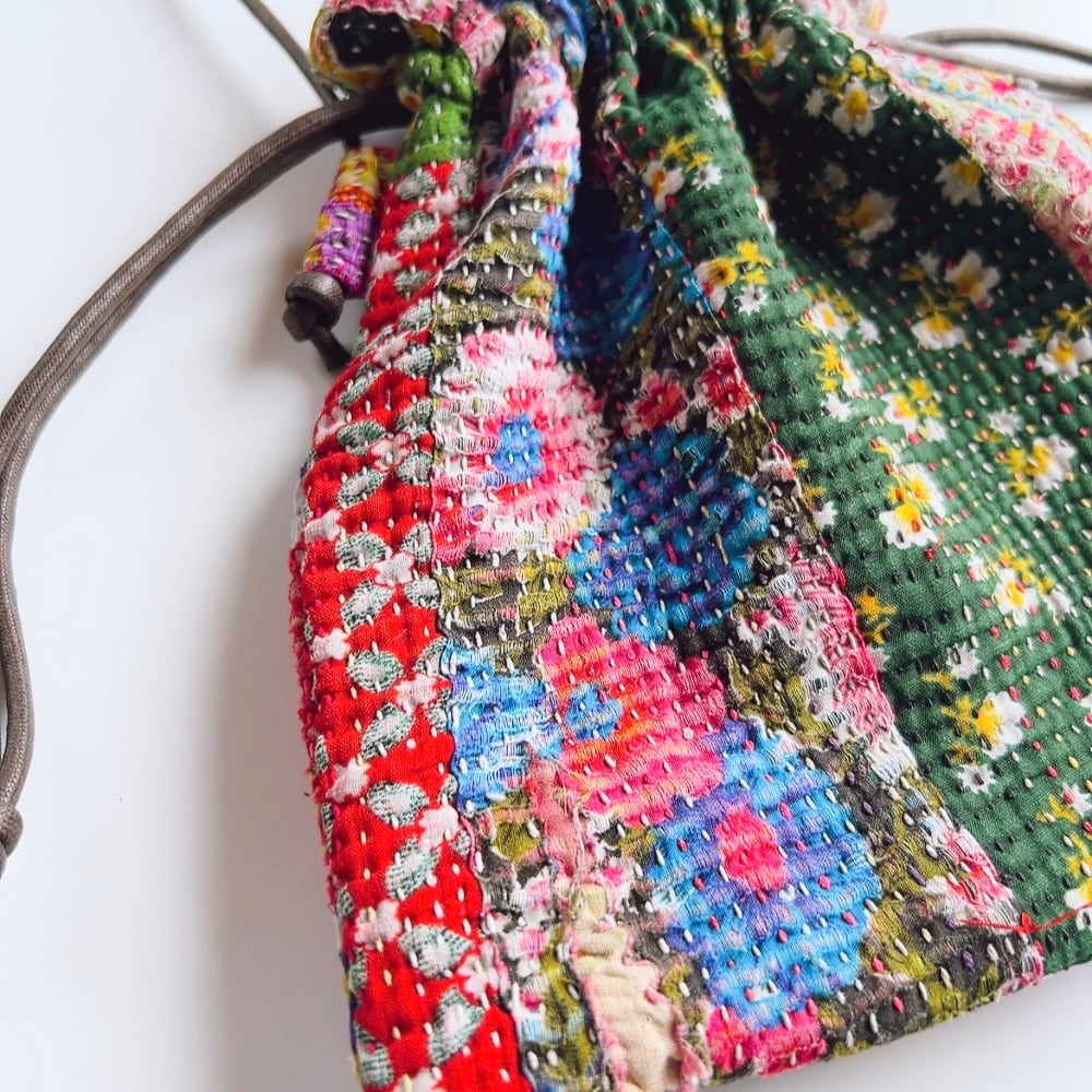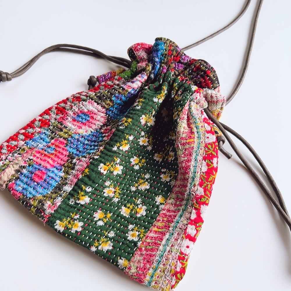ヴィンテージラリーキルトから作られた、巾着ショルダーバッグです。