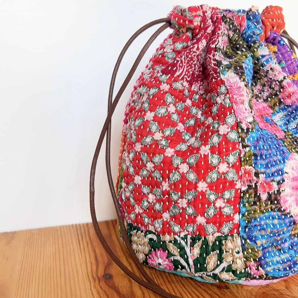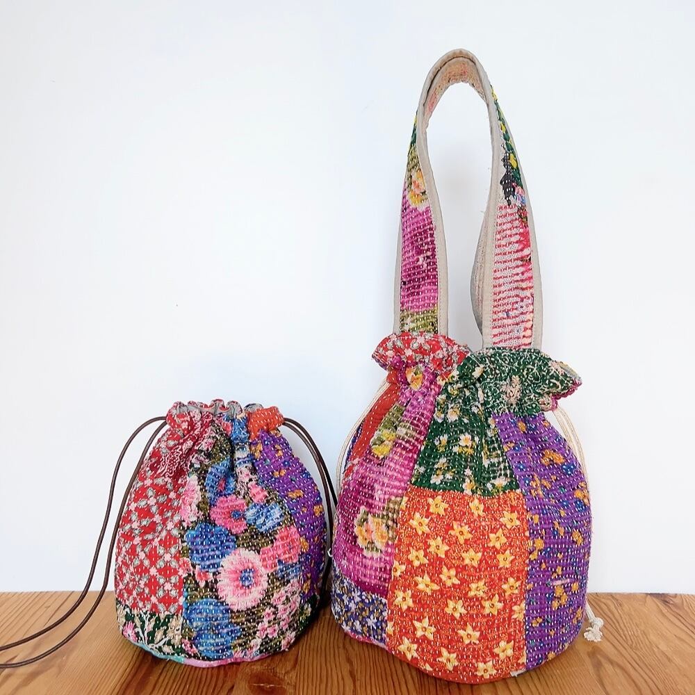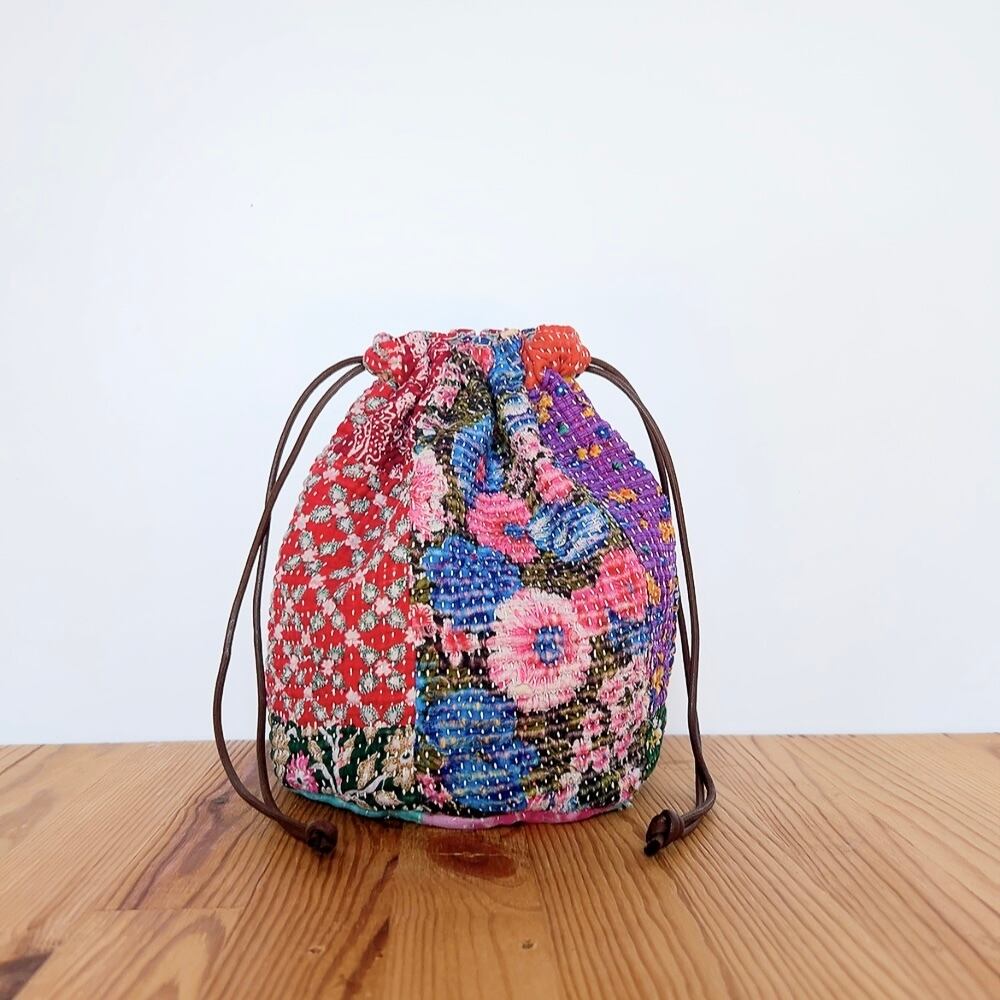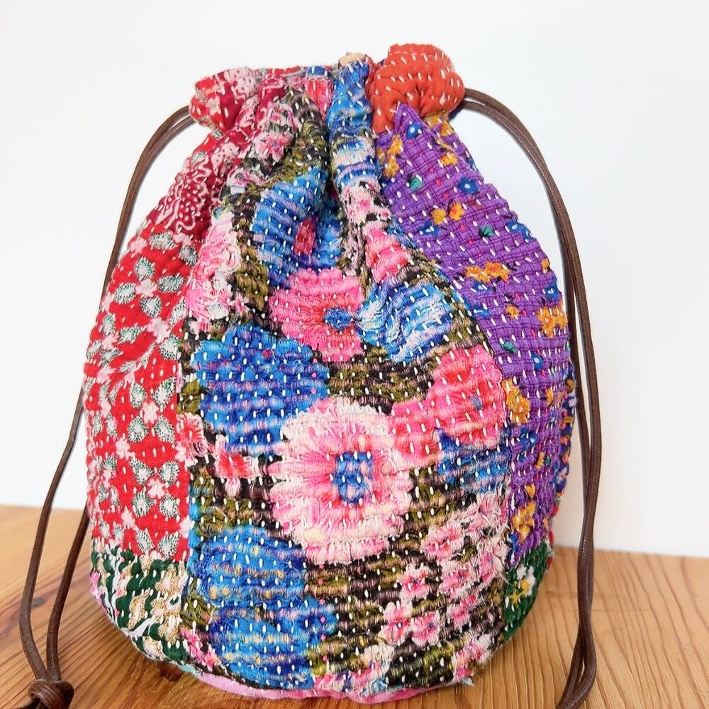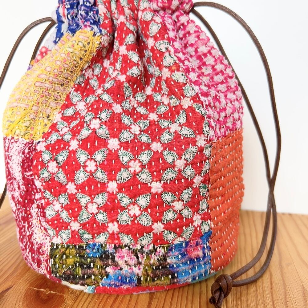 ヴィンテージラリーキルトの風合いを活かした、こだわりの巾着バッグです。