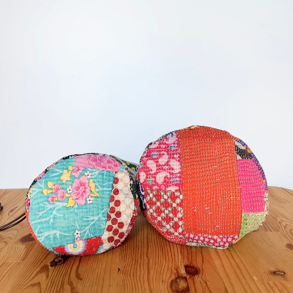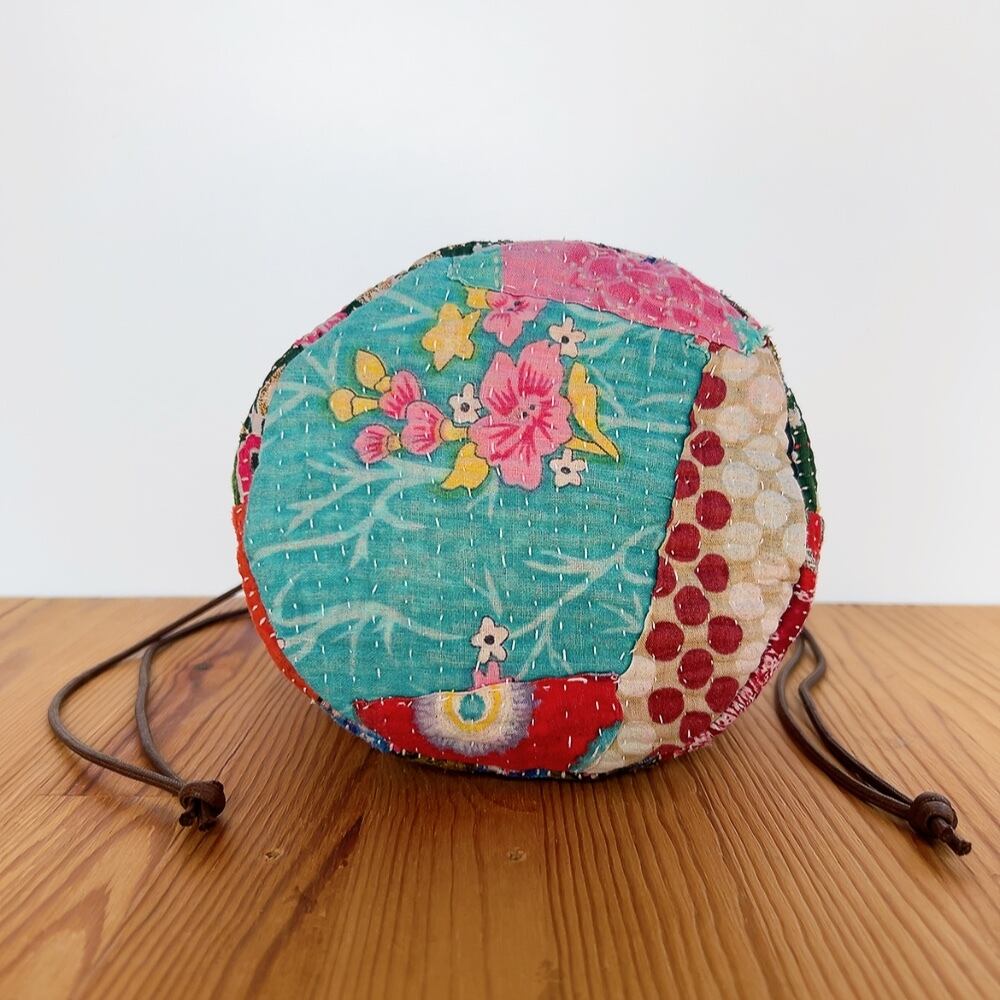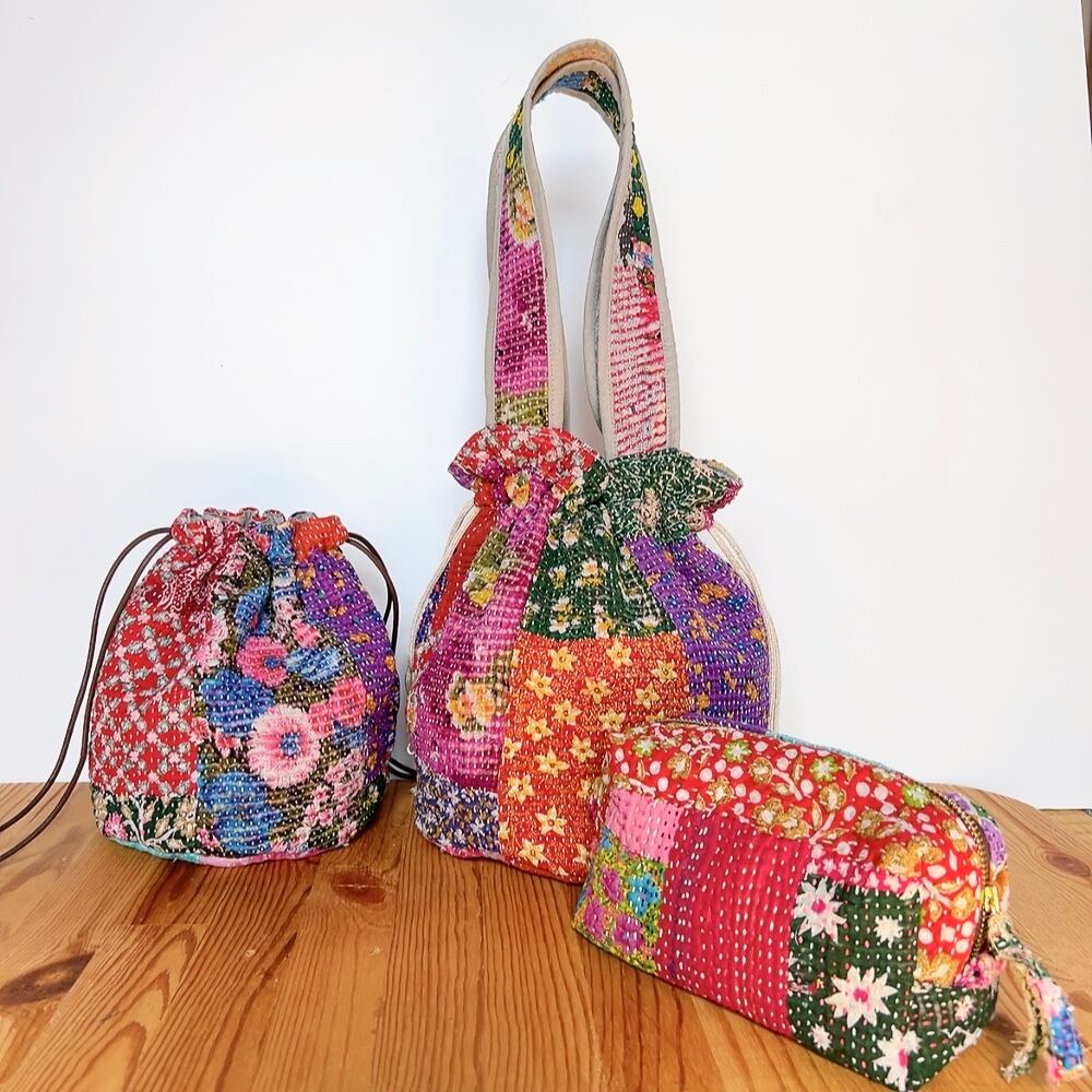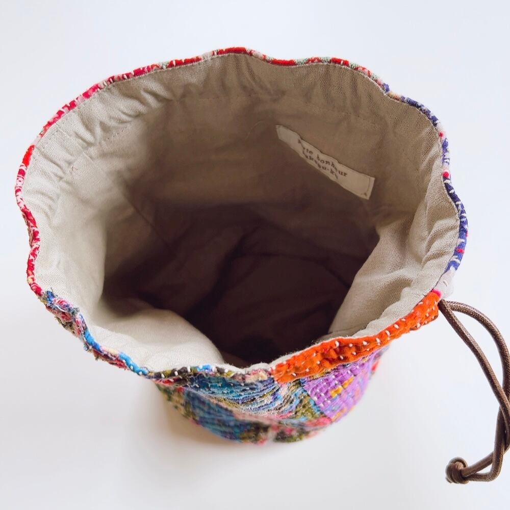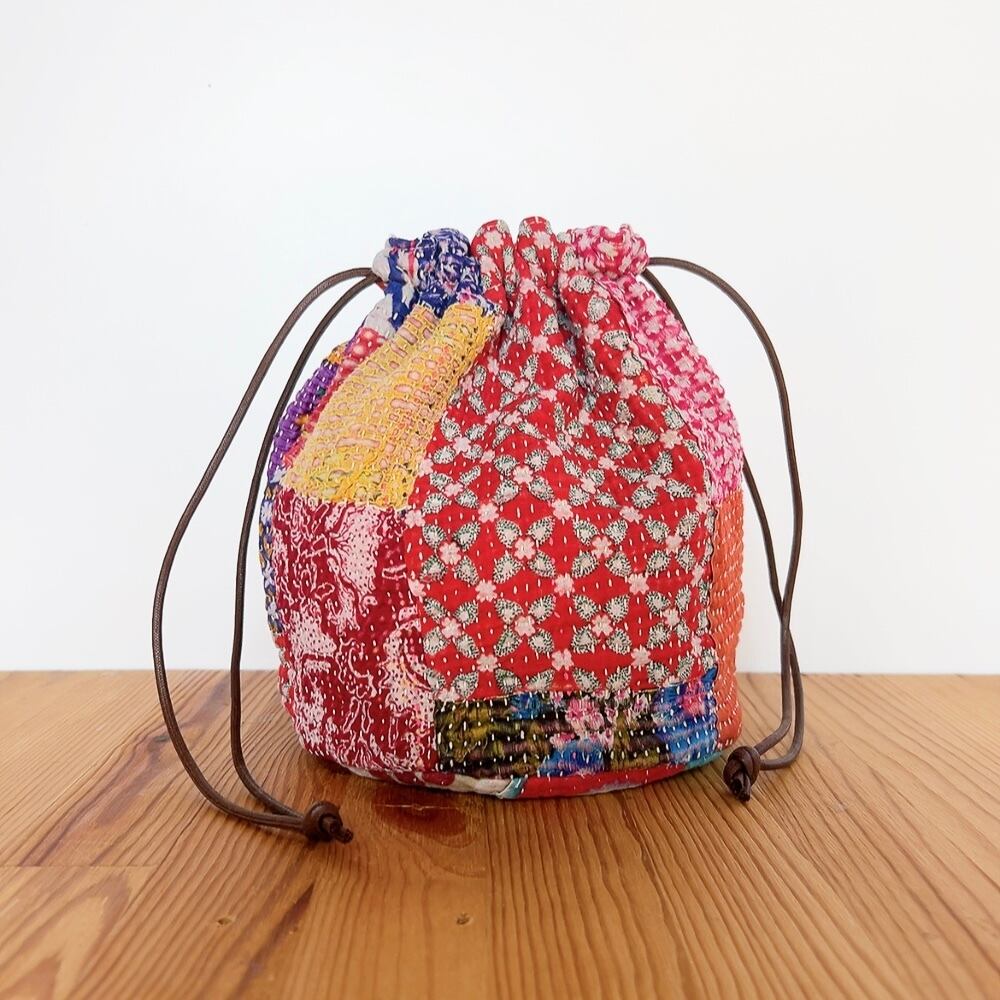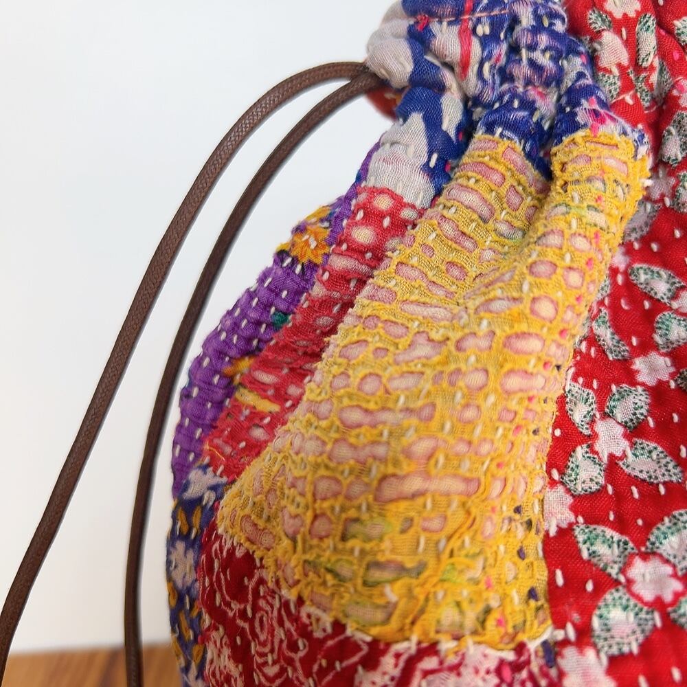 ヴィンテージラリーキルトの風合いを活かした、こだわりの巾着バッグです。