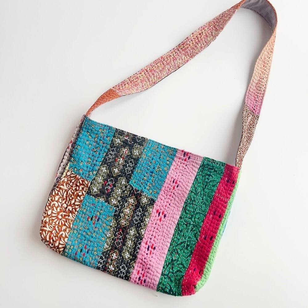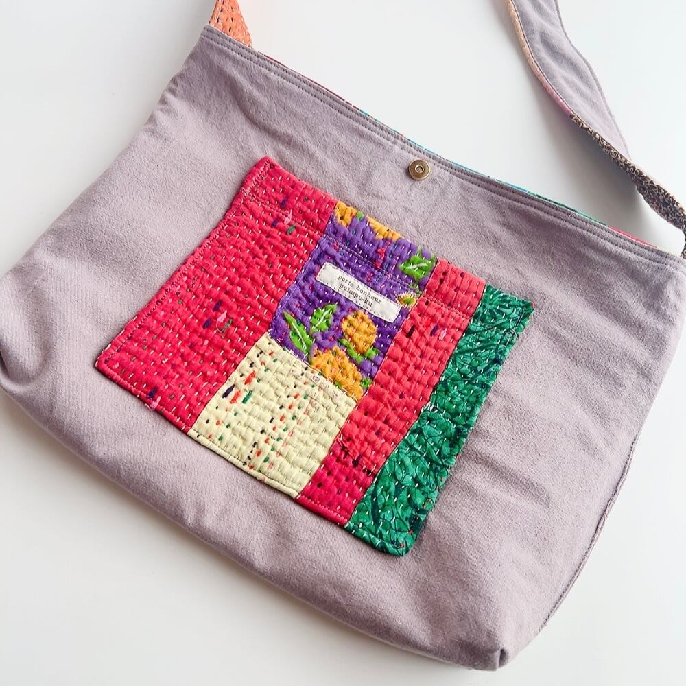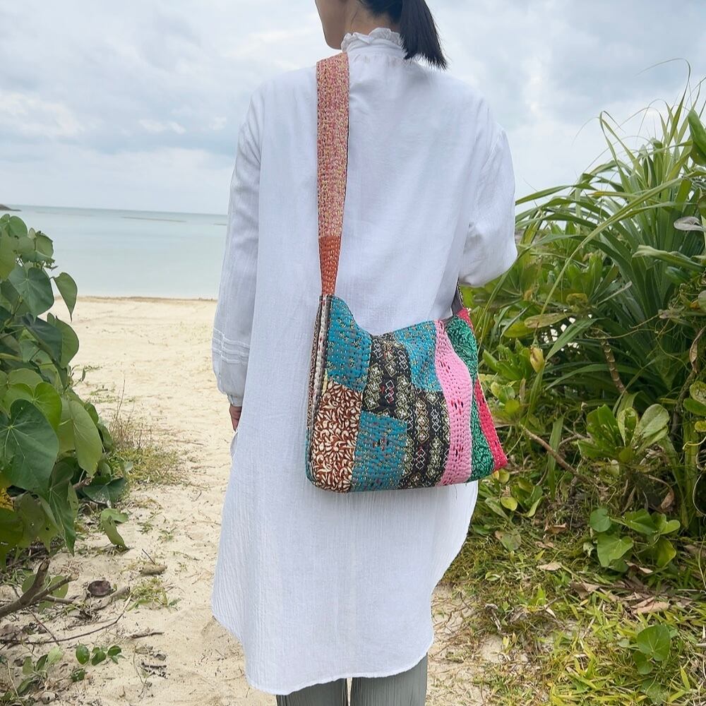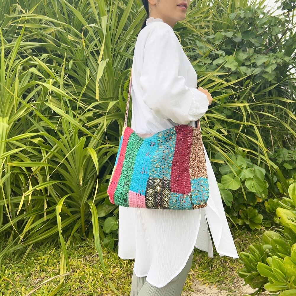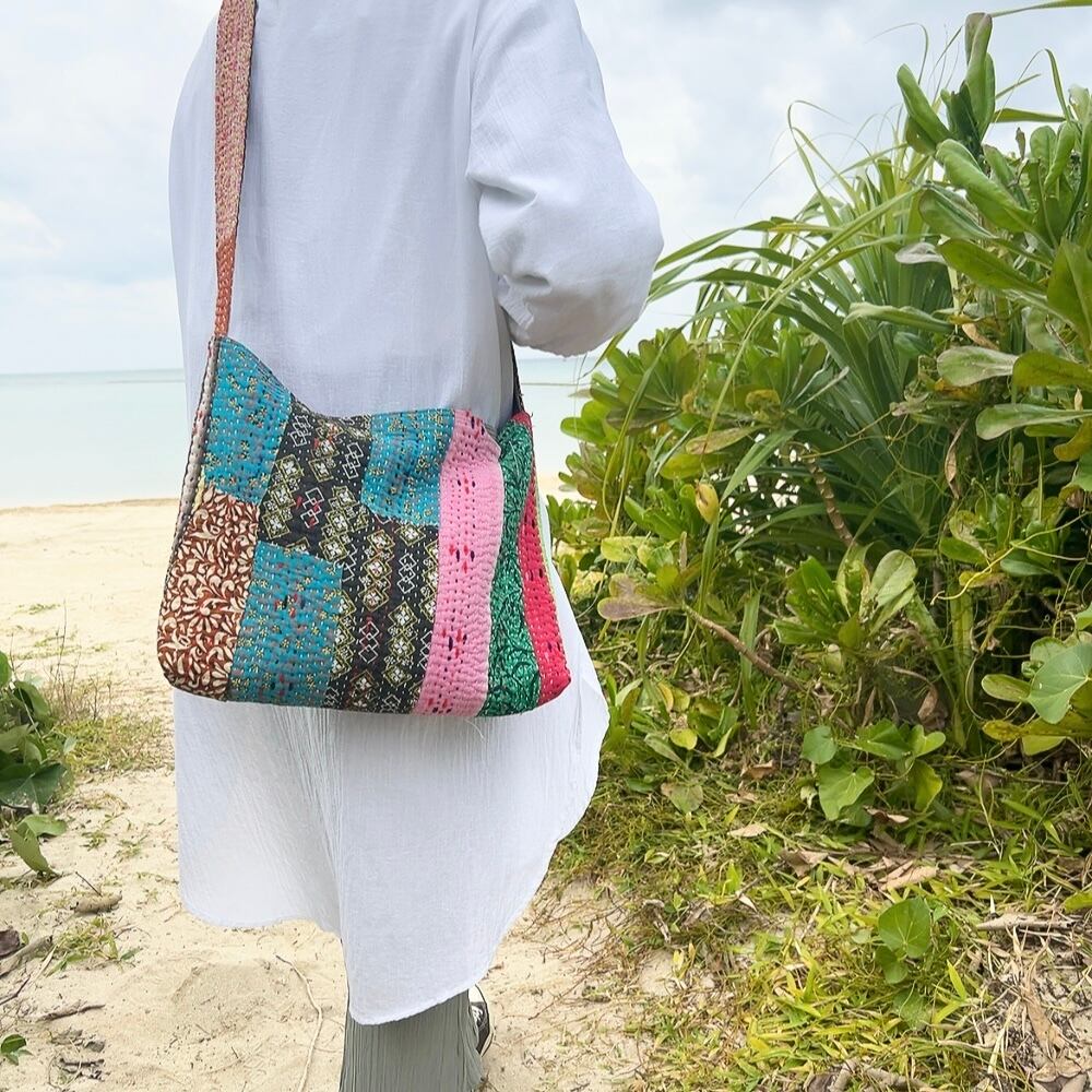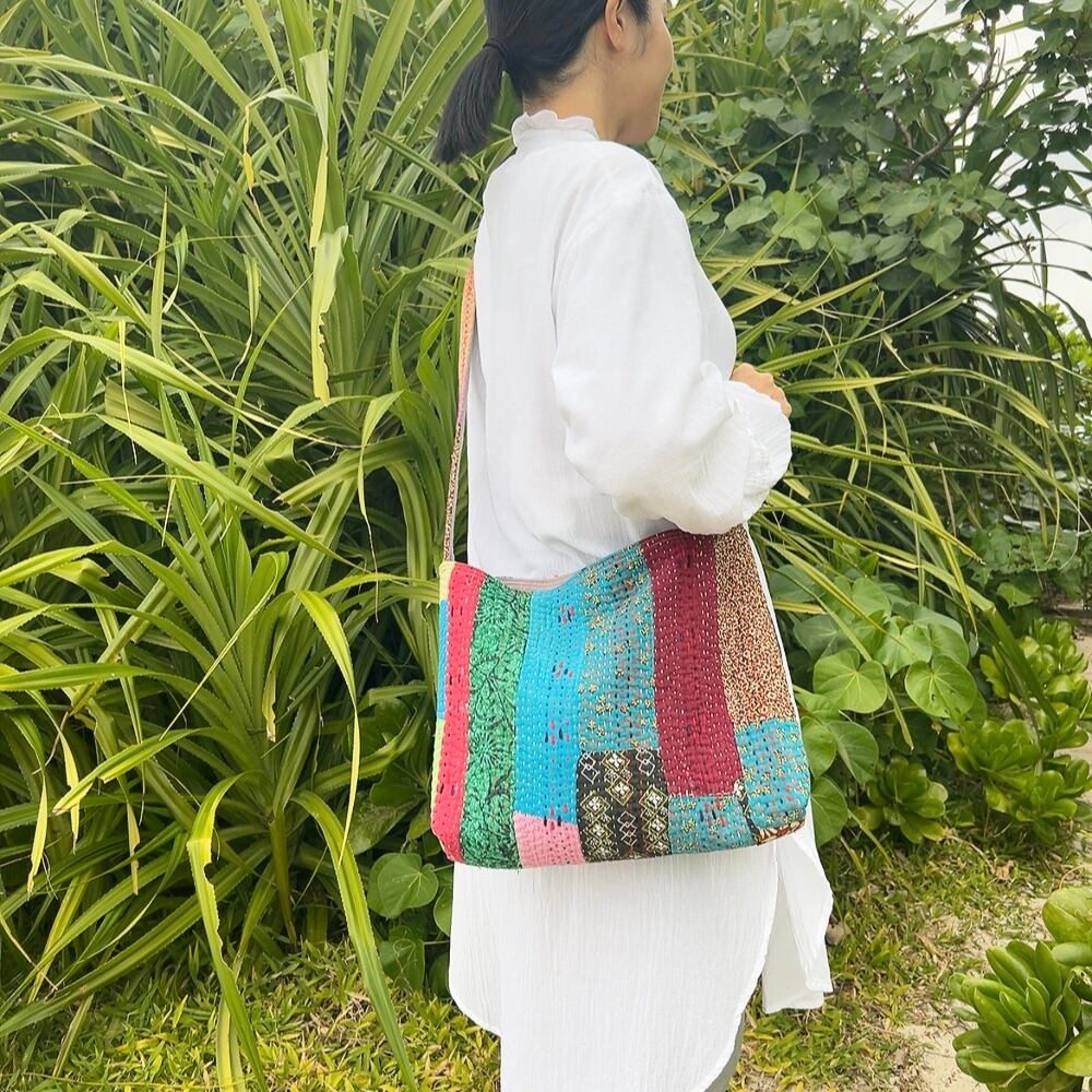 ヴィンテージラリーキルトから作られた、マチ付きショルダーバッグです。個性的なパッチワーク柄が施されており、手作りの温かみを感じることができます。