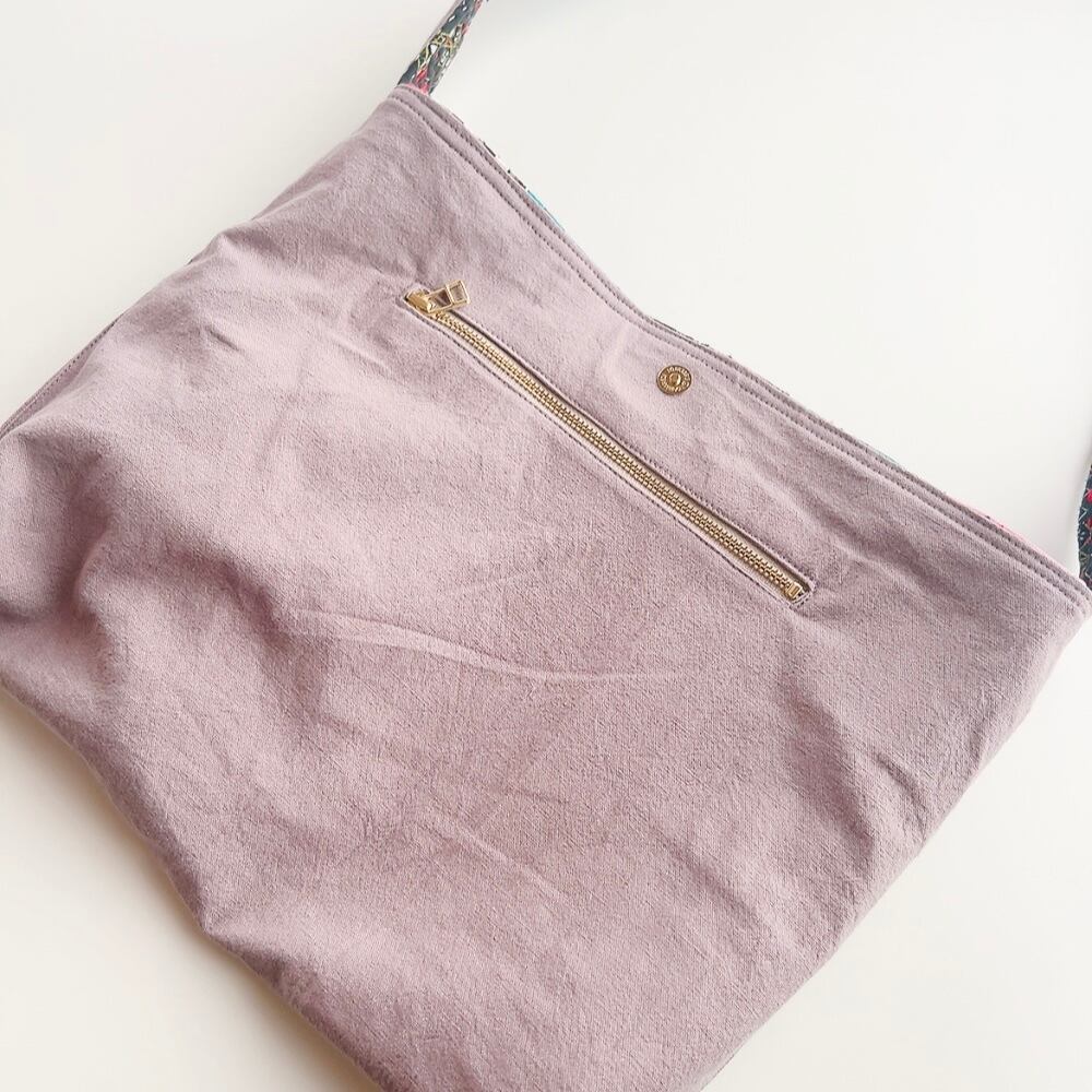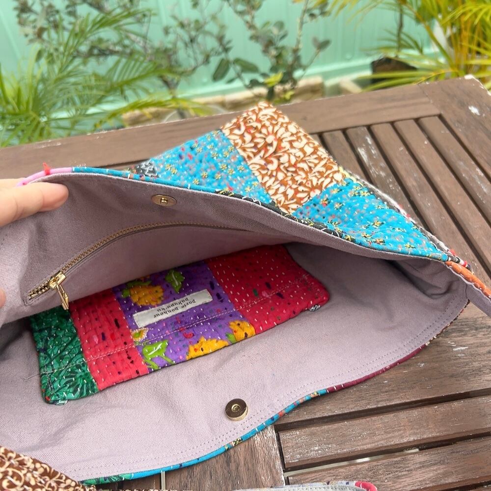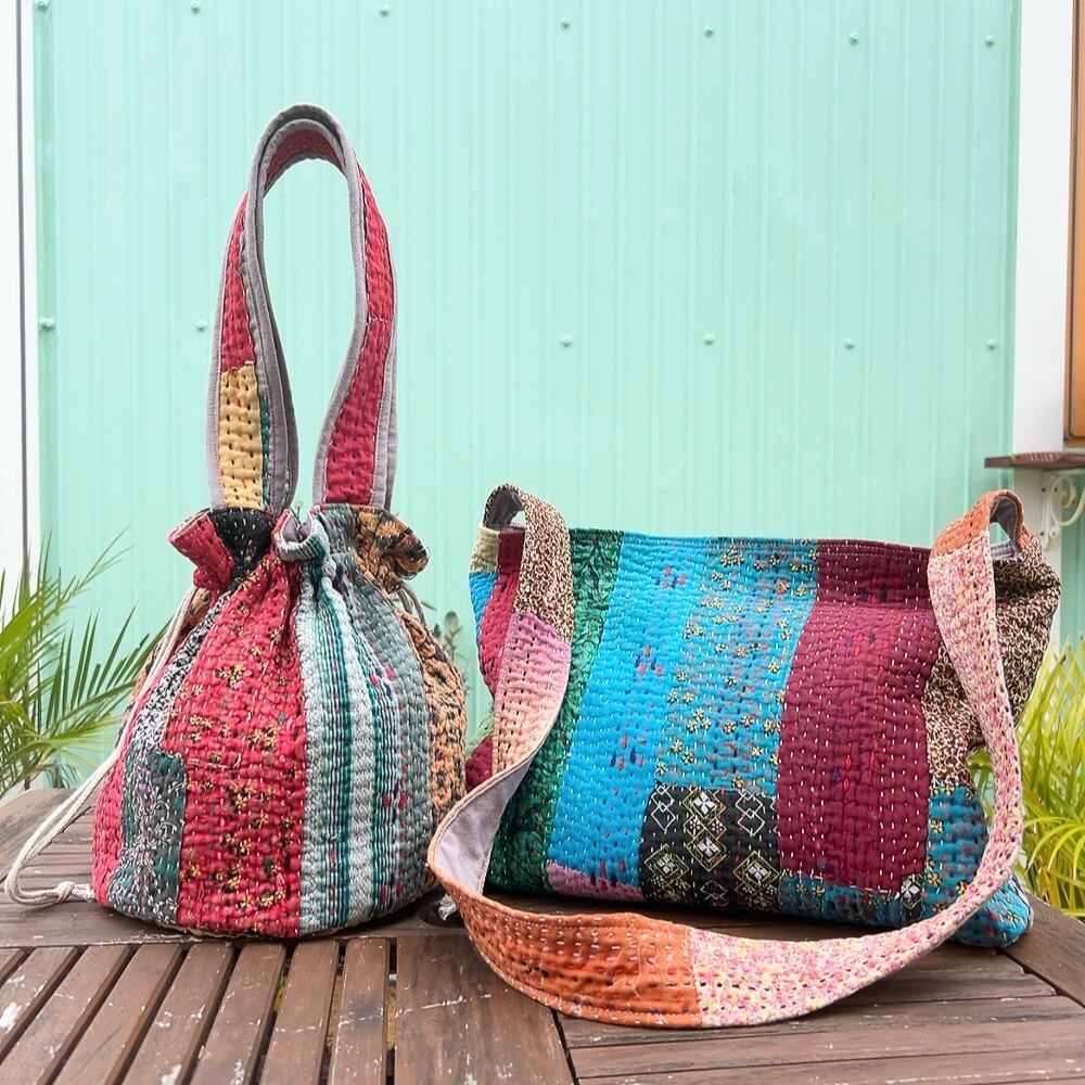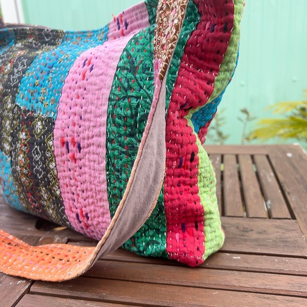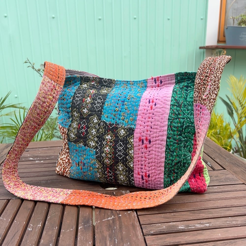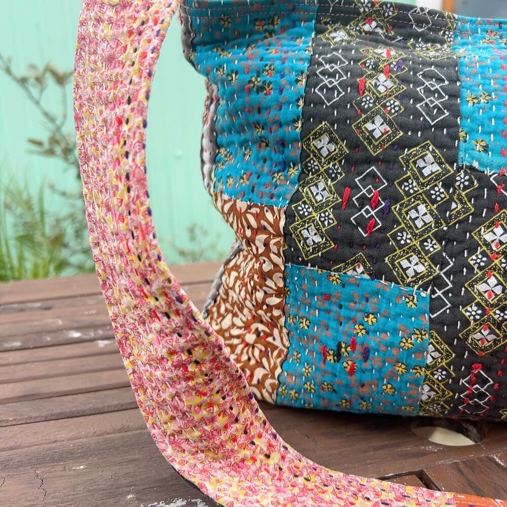 ヴィンテージラリーキルトから作られた、マチ付きショルダーバッグです。個性的なパッチワーク柄が施されており、手作りの温かみを感じることができます。