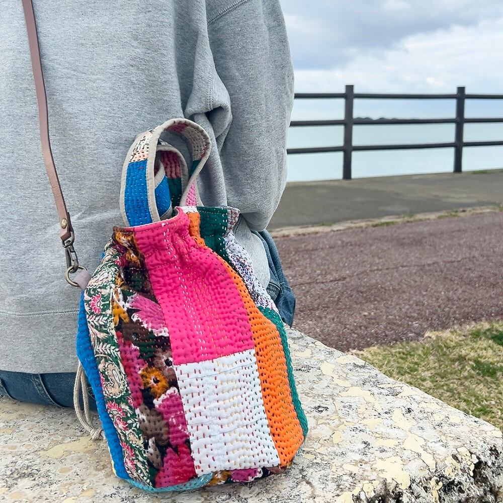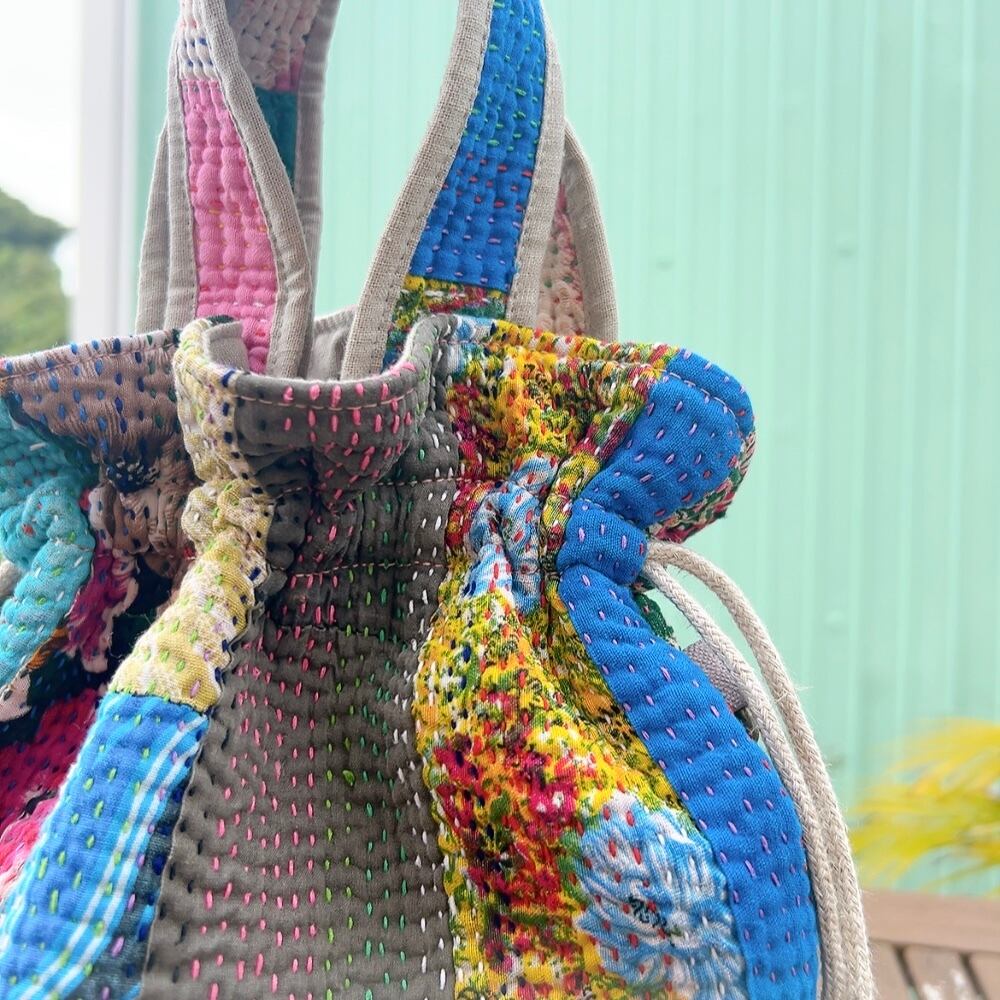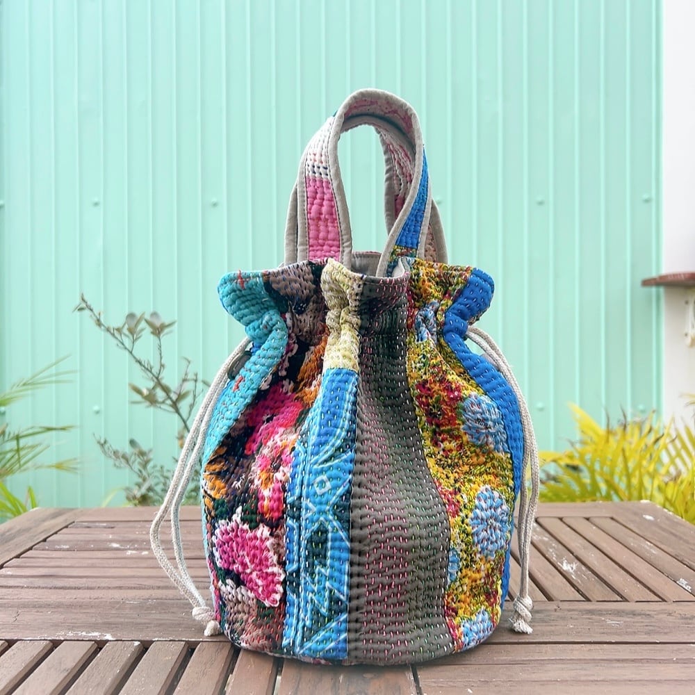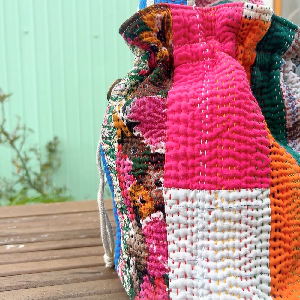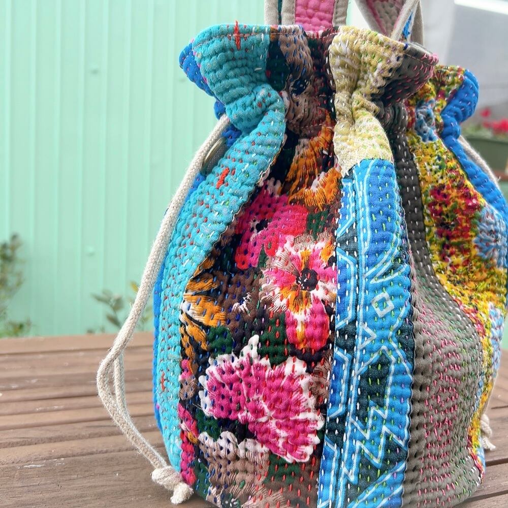 一点もののヴィンテージラリーキルトの巾着バッグ。カラフルなパッチワーク柄と可愛らしいサイズ感が魅力です。
