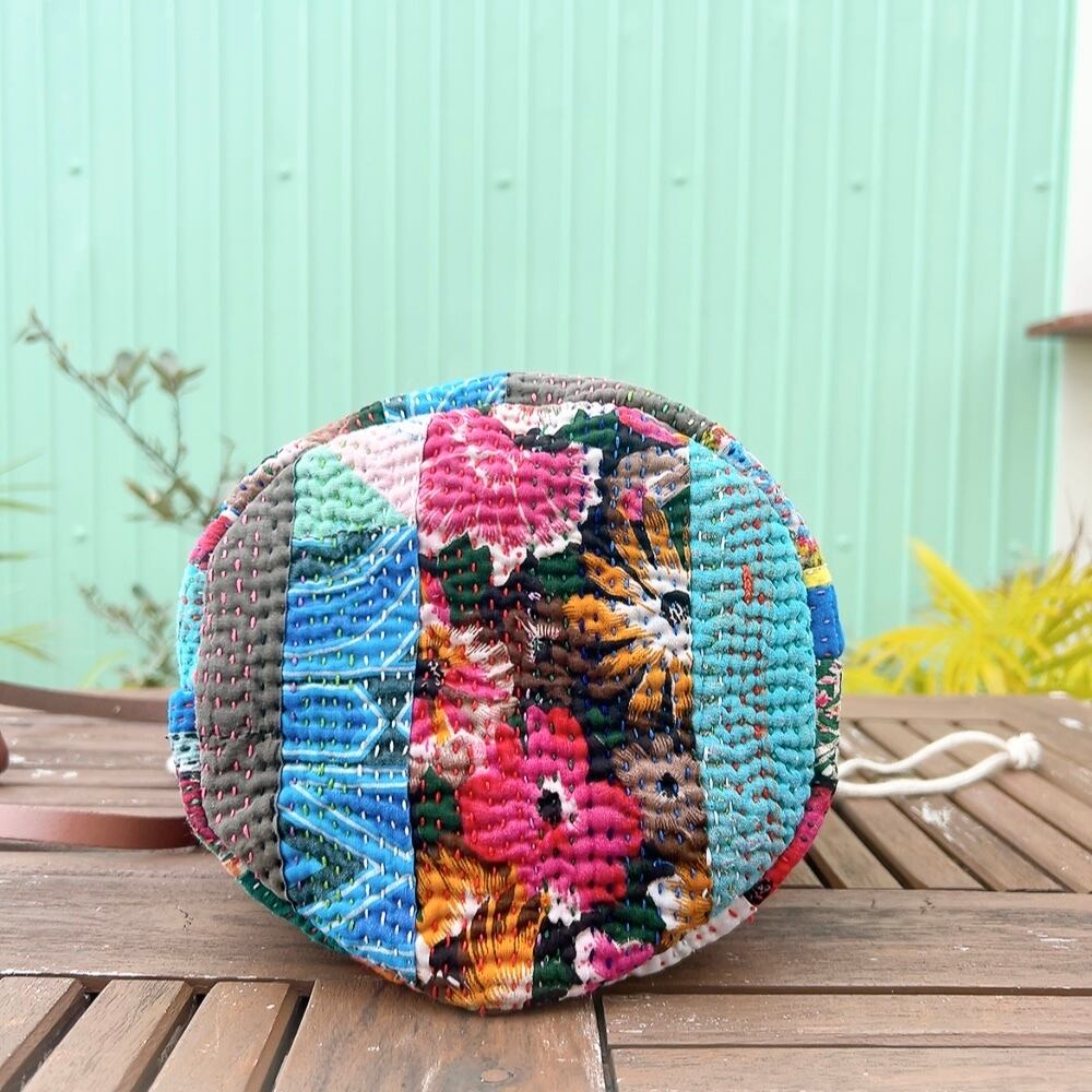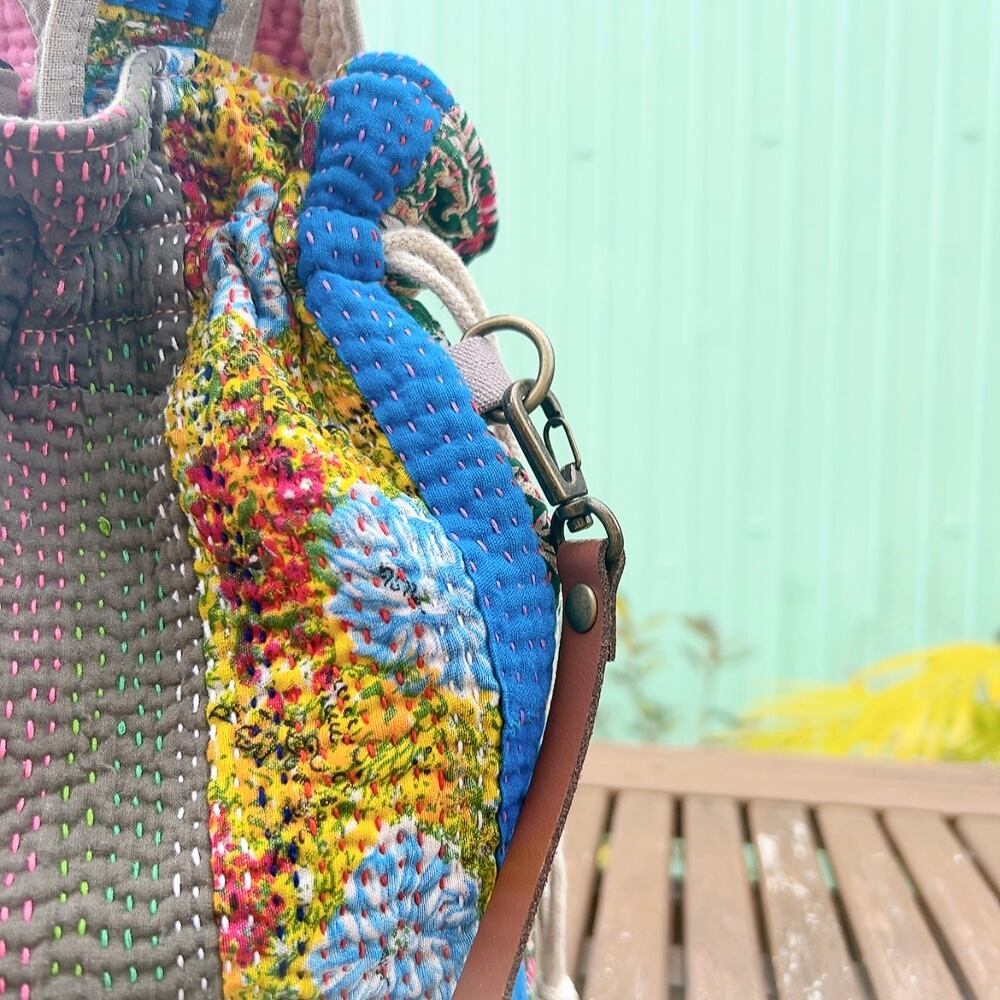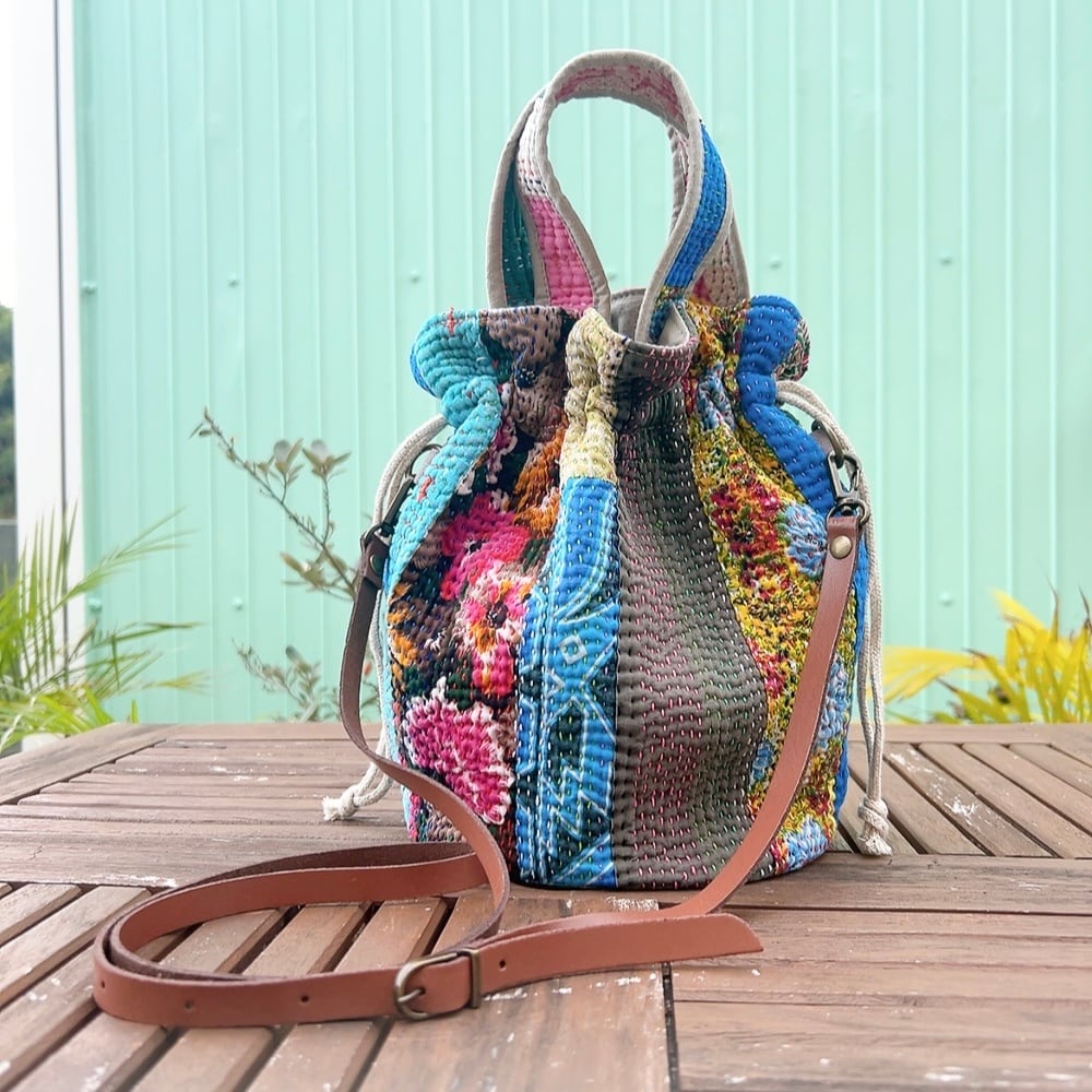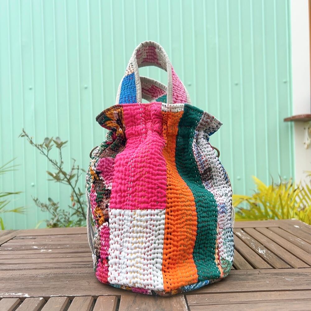 一点もののヴィンテージラリーキルトの巾着バッグ。カラフルなパッチワーク柄と可愛らしいサイズ感が魅力です。