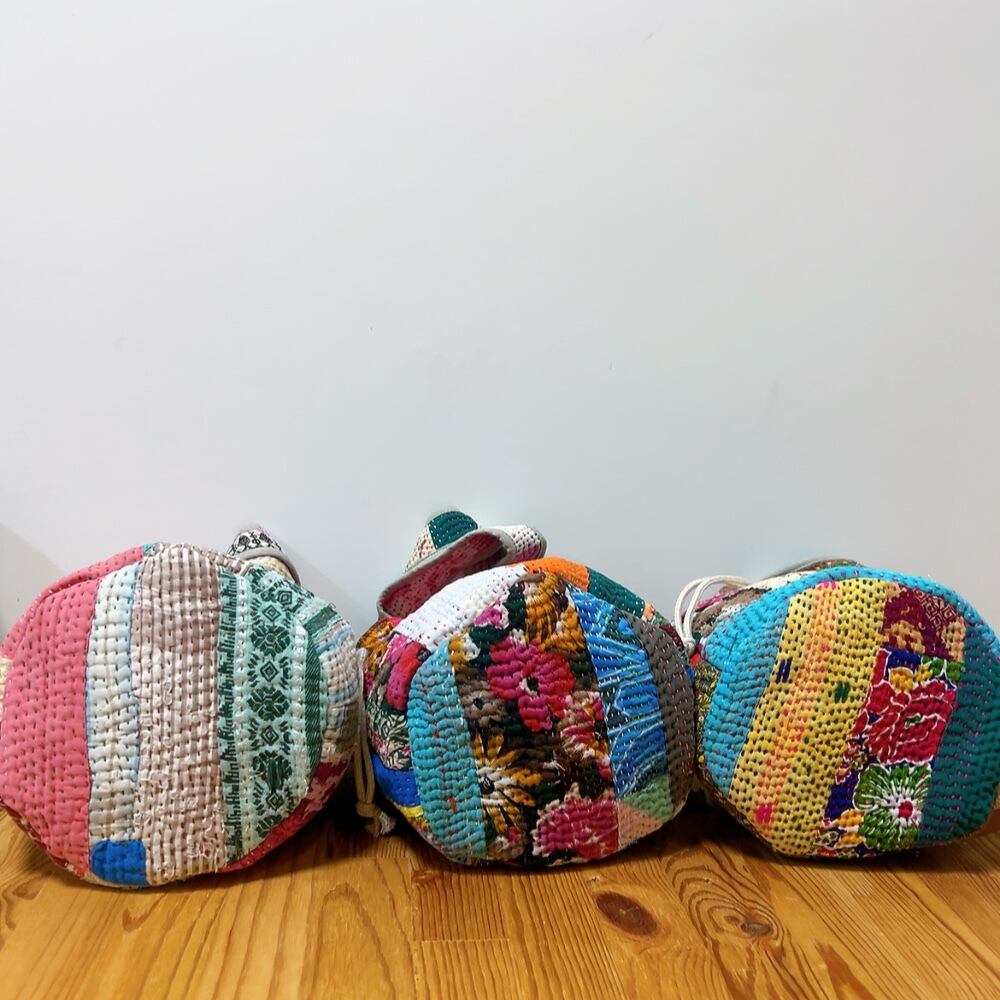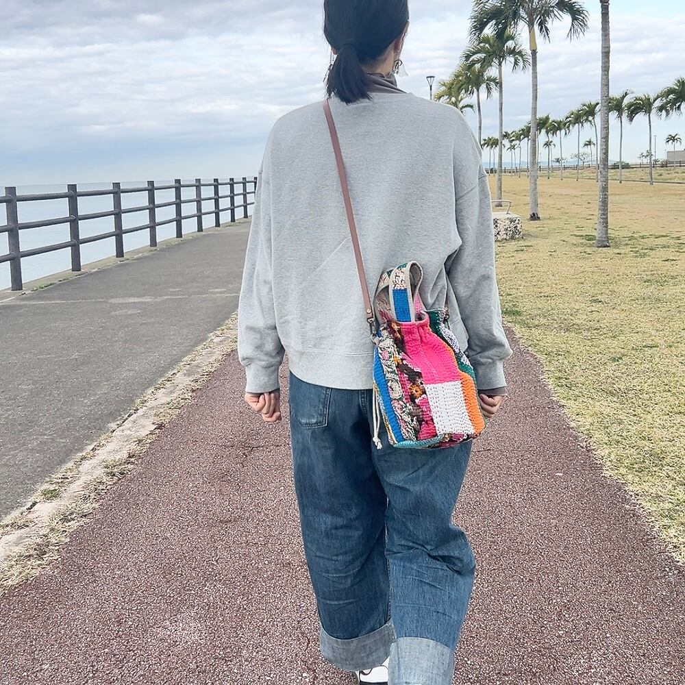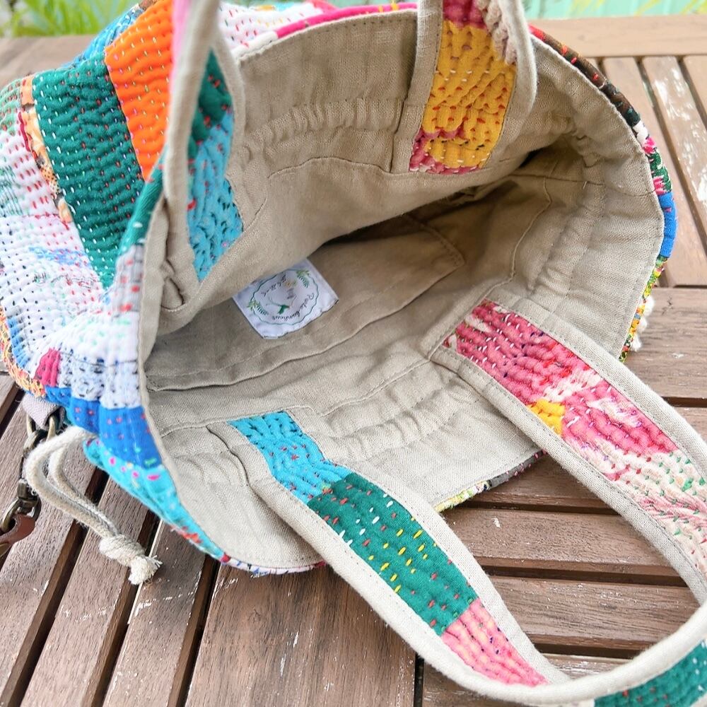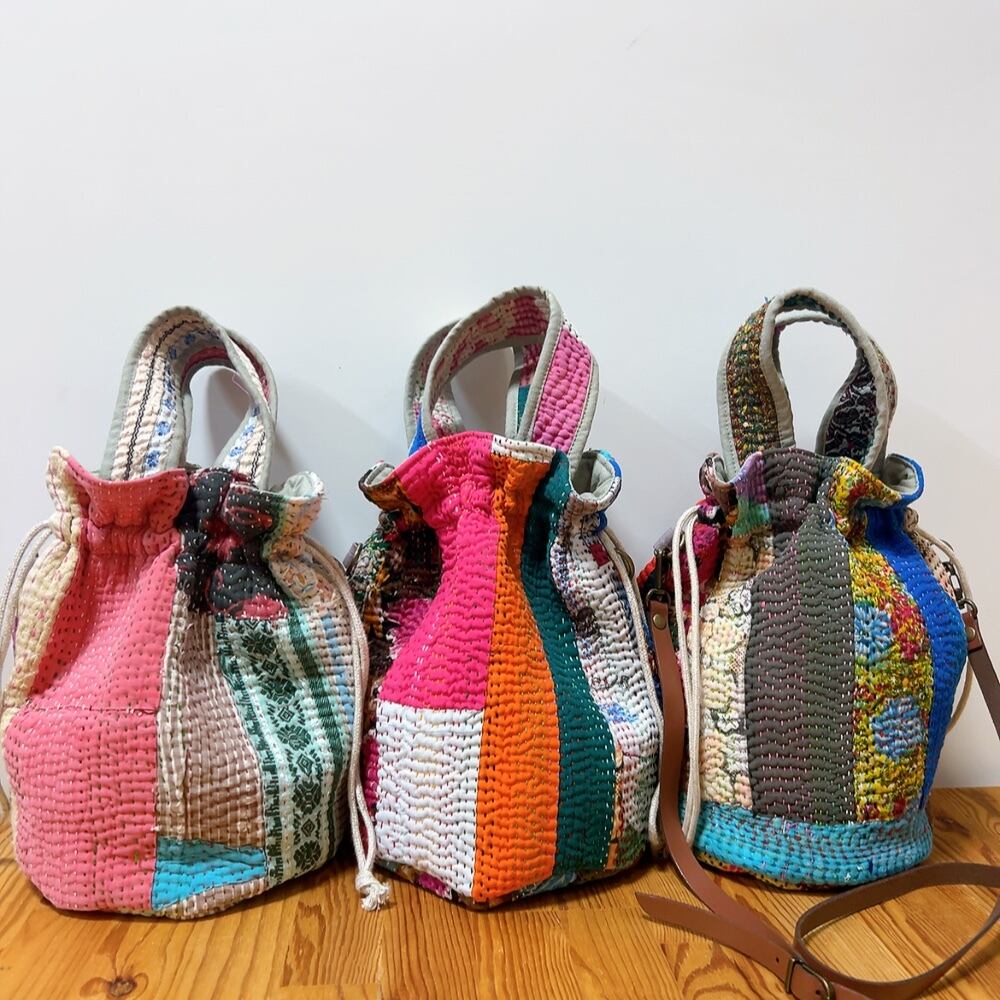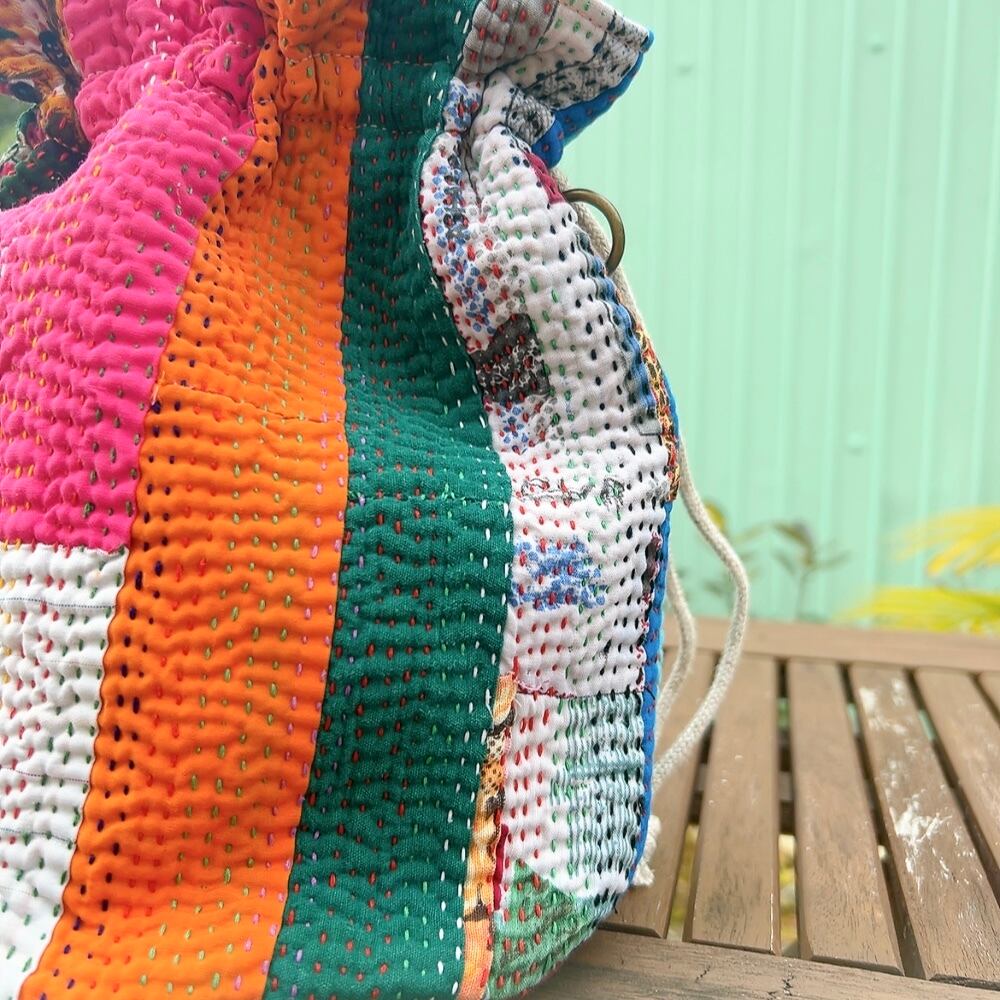 一点もののヴィンテージラリーキルトの巾着バッグ。カラフルなパッチワーク柄と可愛らしいサイズ感が魅力です。
